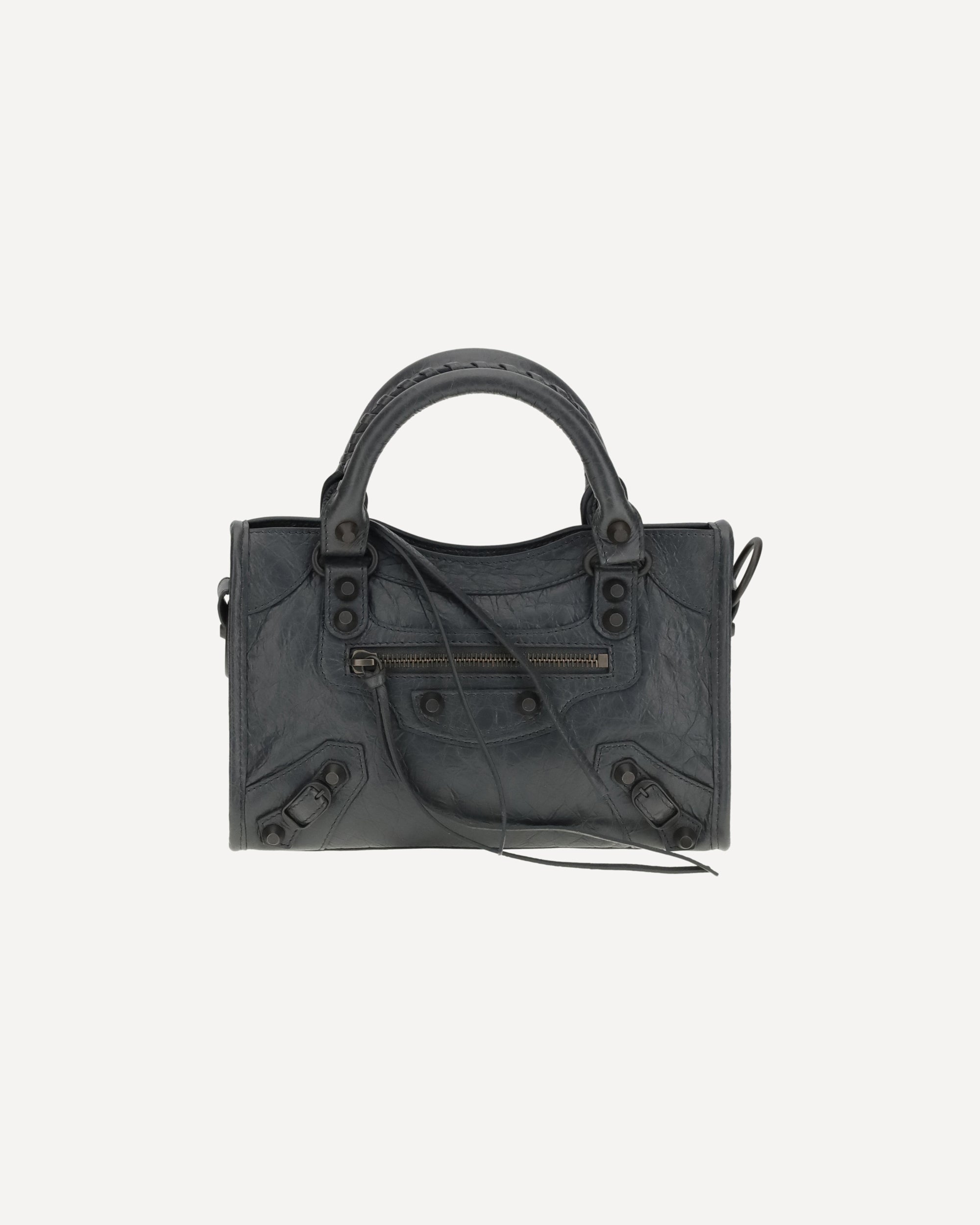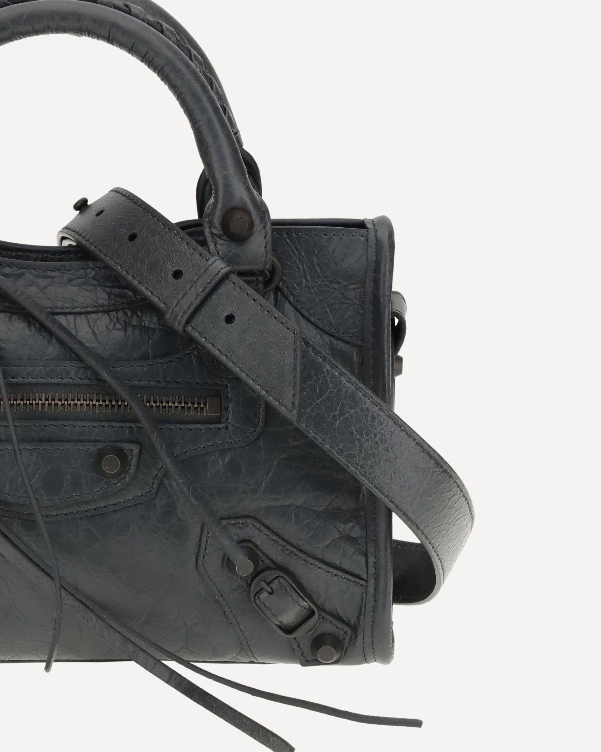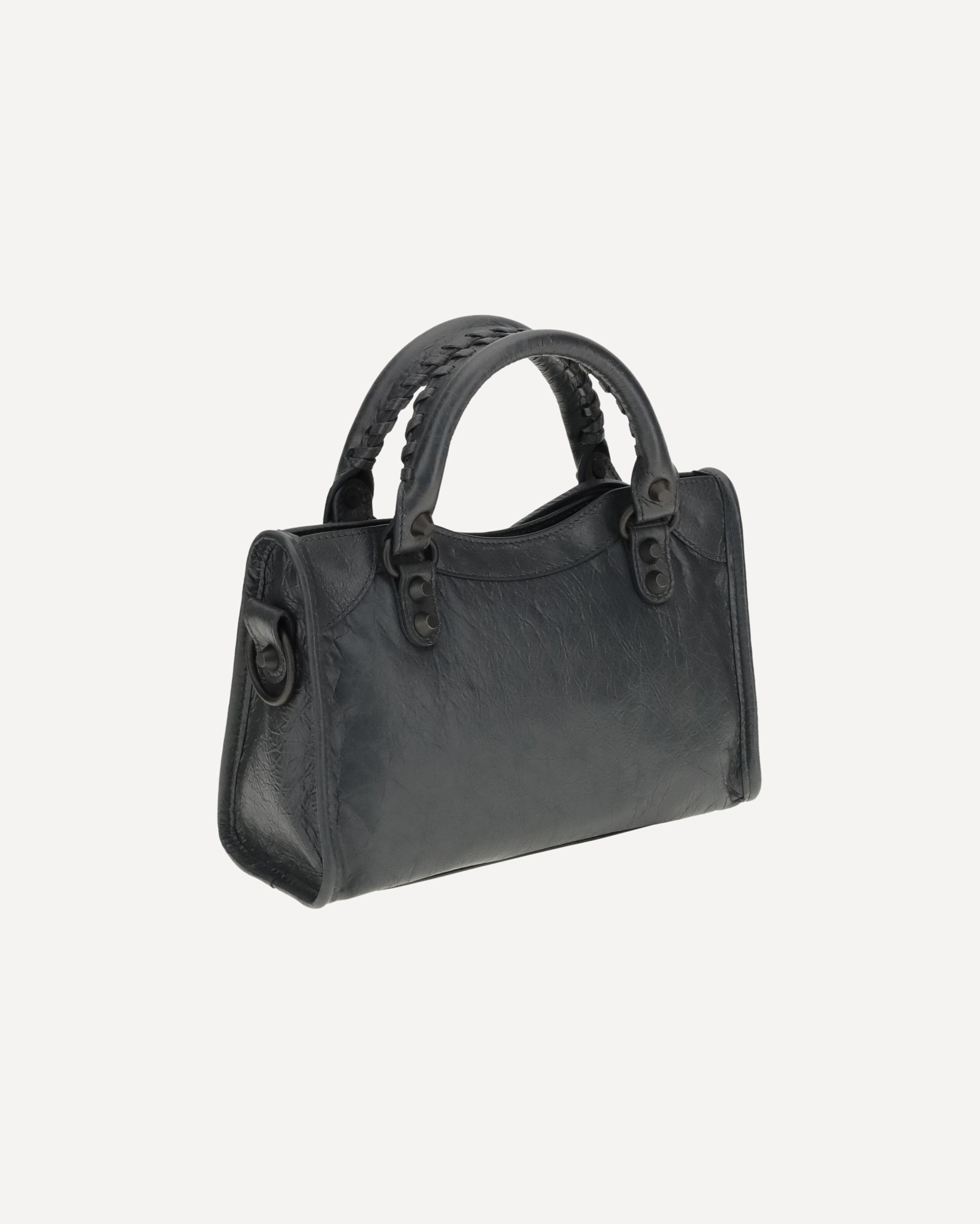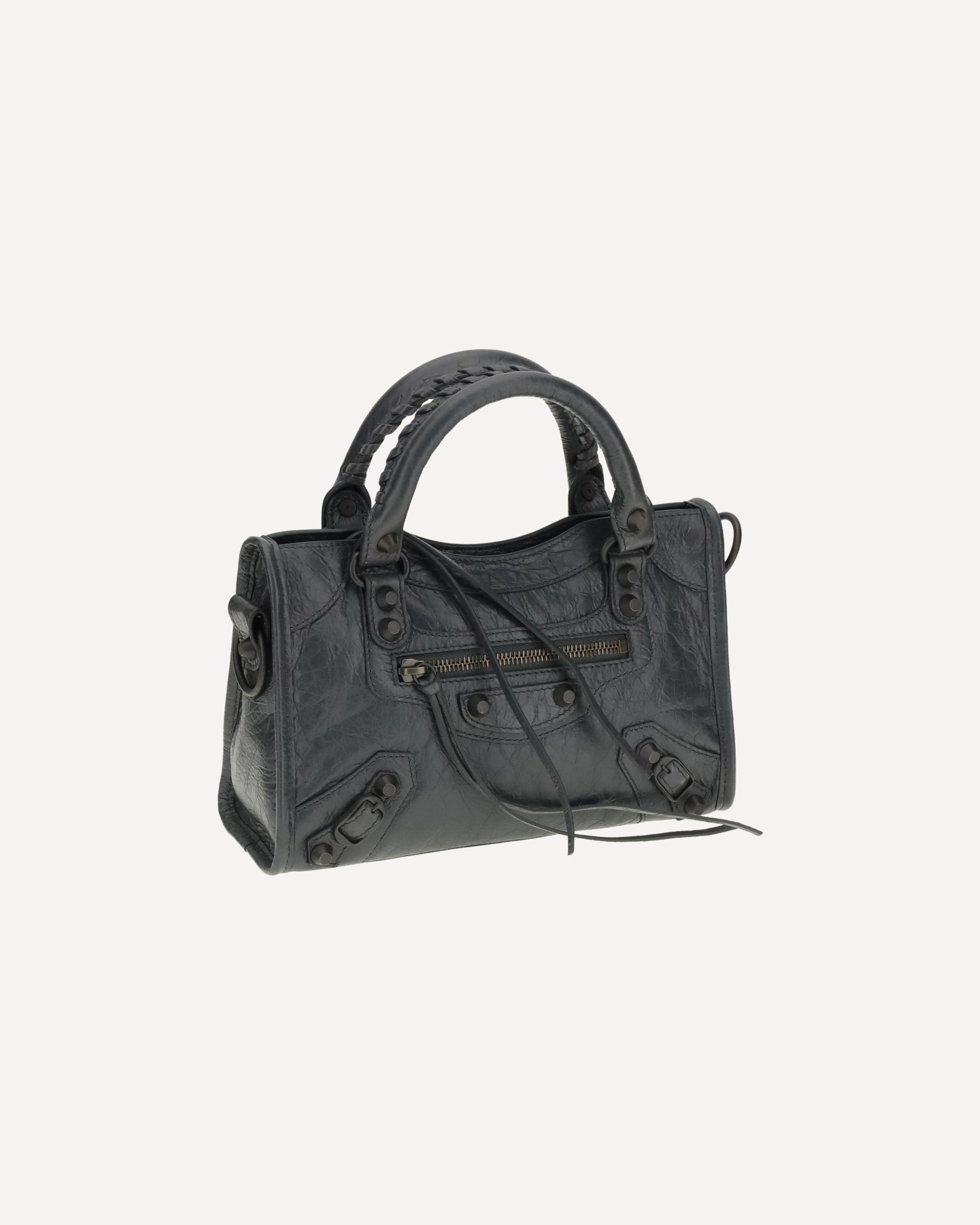 Lambskin Le City mini Handbag by Balenciaga, made of wrinkled-effect Arena Leather, adjustable and removable shoulder strap, two hand-woven leather handles, brass hardware, knotted leather zipper and zipper puller closure, knotted leather front zipper pocket and zipper puller, interior zippered pocket, cotton canvas lining.