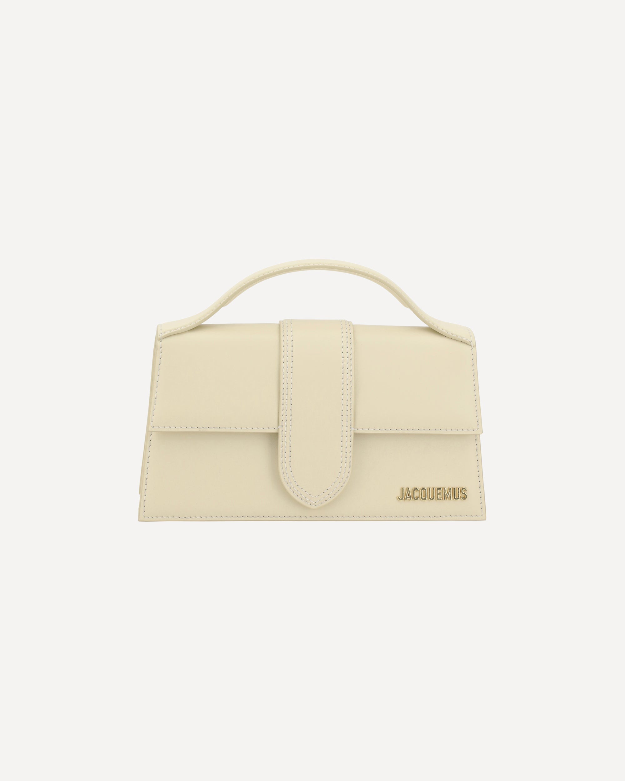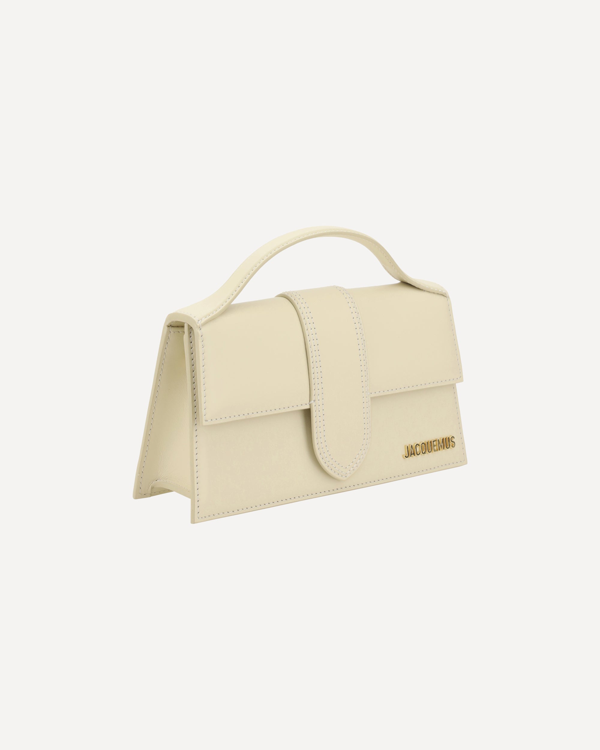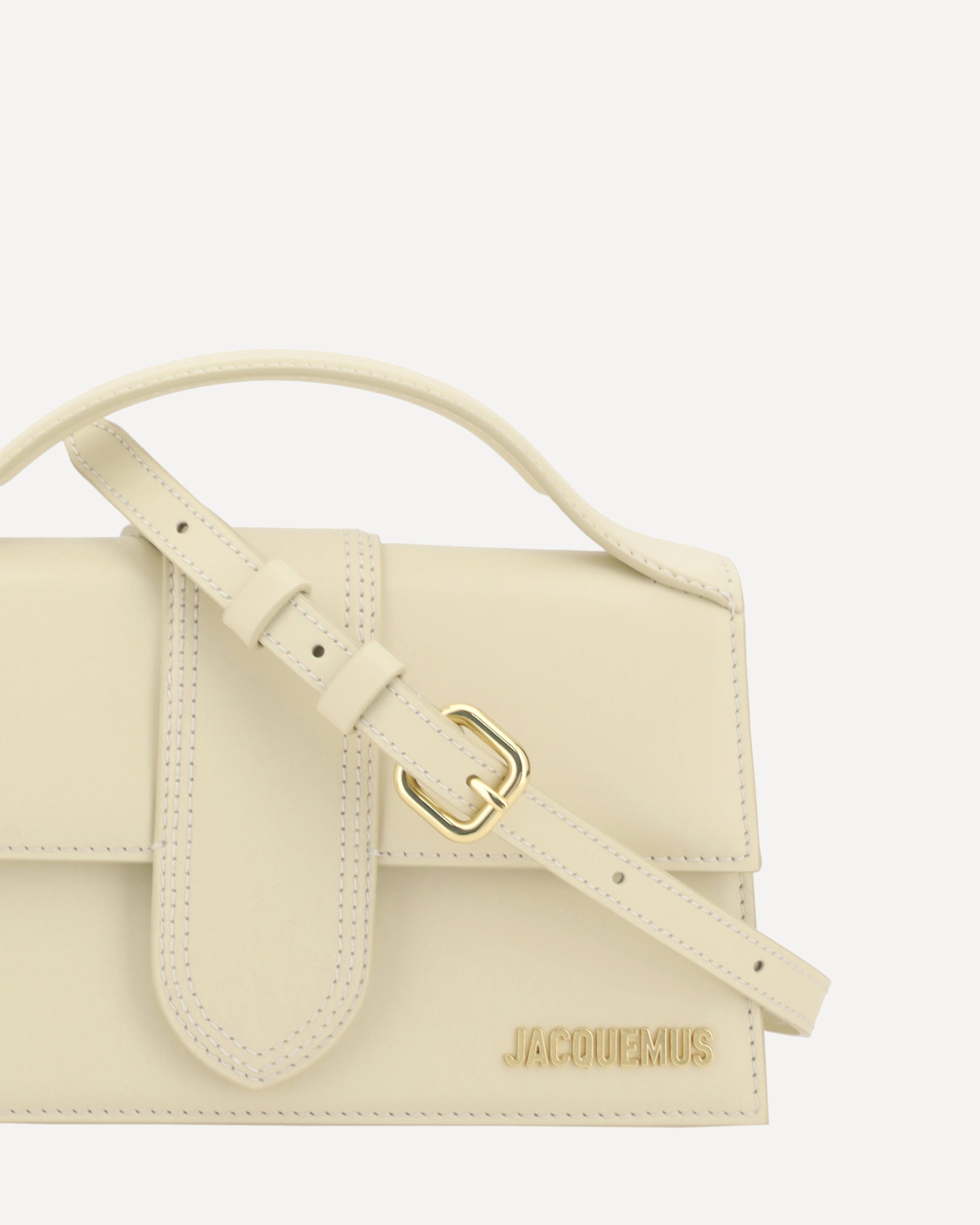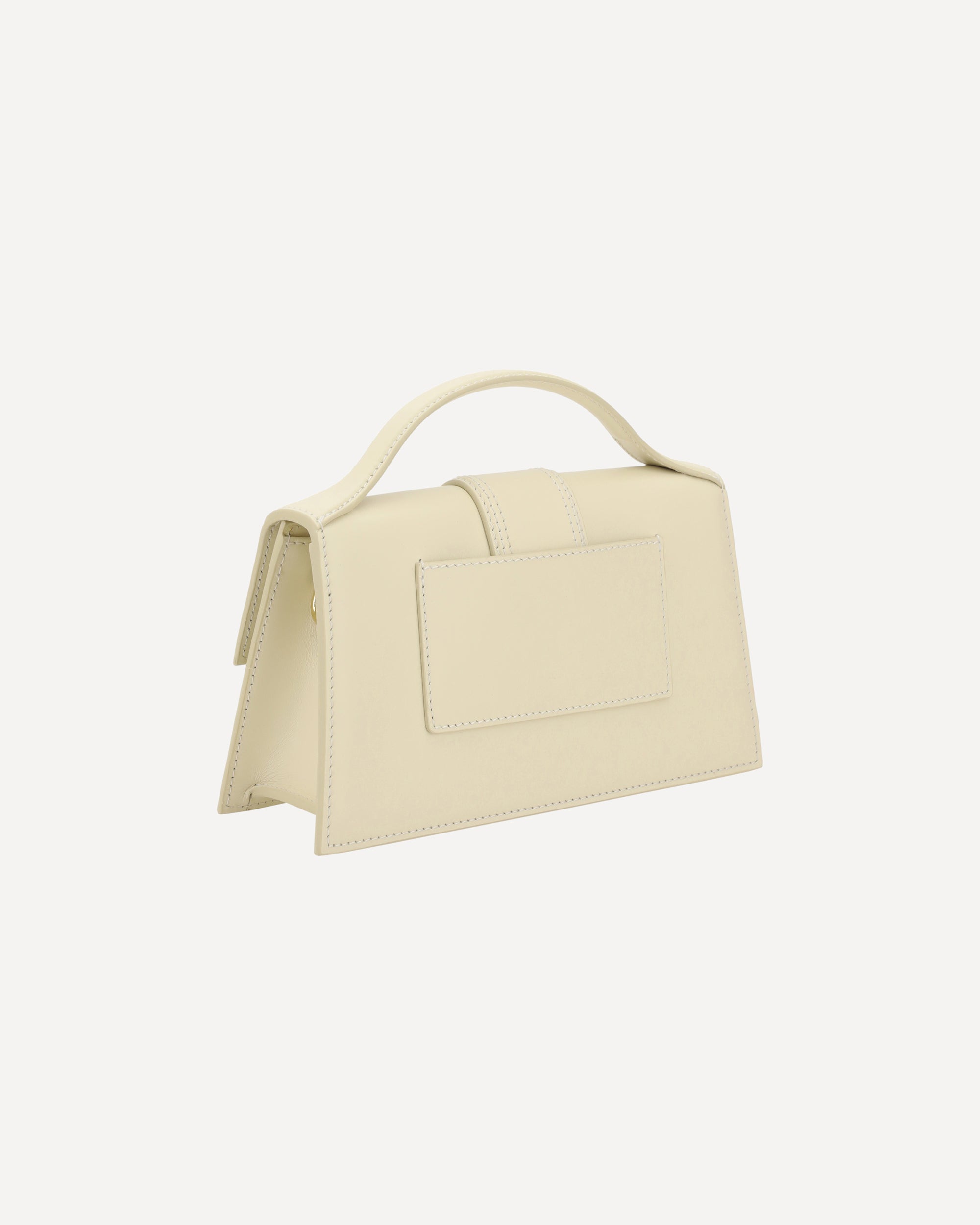 Le Grand Bambino Handbag by Jacquemus is a sophisticated accessory that combines contemporary elegance and functionality. Featuring a flat top handle and an adjustable and removable shoulder strap, it offers a wide versatility in wearing style. The geometric design of the bag is enhanced by the three-dimensional plaque with the brand's iconic monogram, applied in contrast on the front, giving it a distinctive and modern touch. On the back, a welt pocket adds practicality to keep smaller items close at hand. A flap closure with a magnetic button on the front ensures security and ease of use.