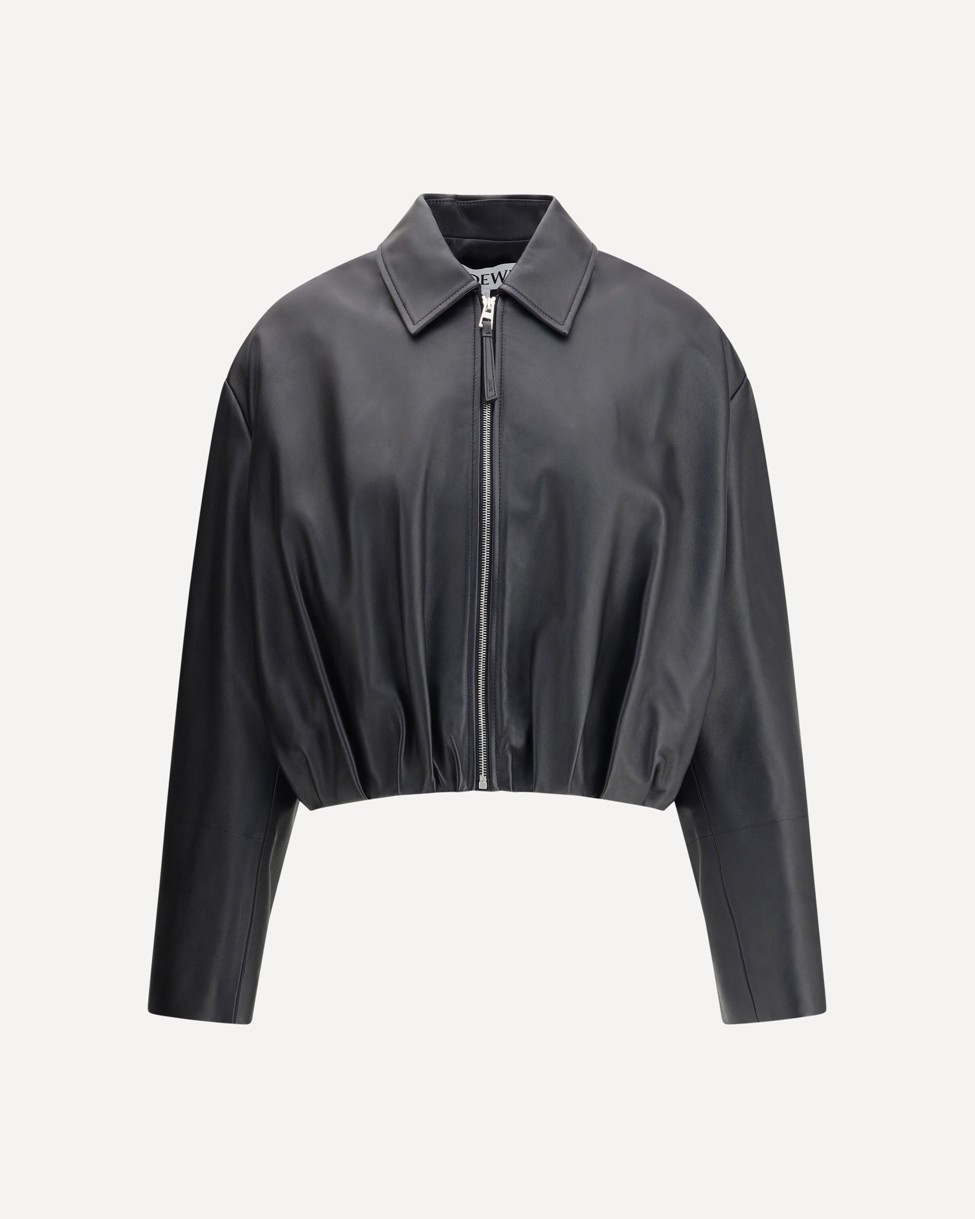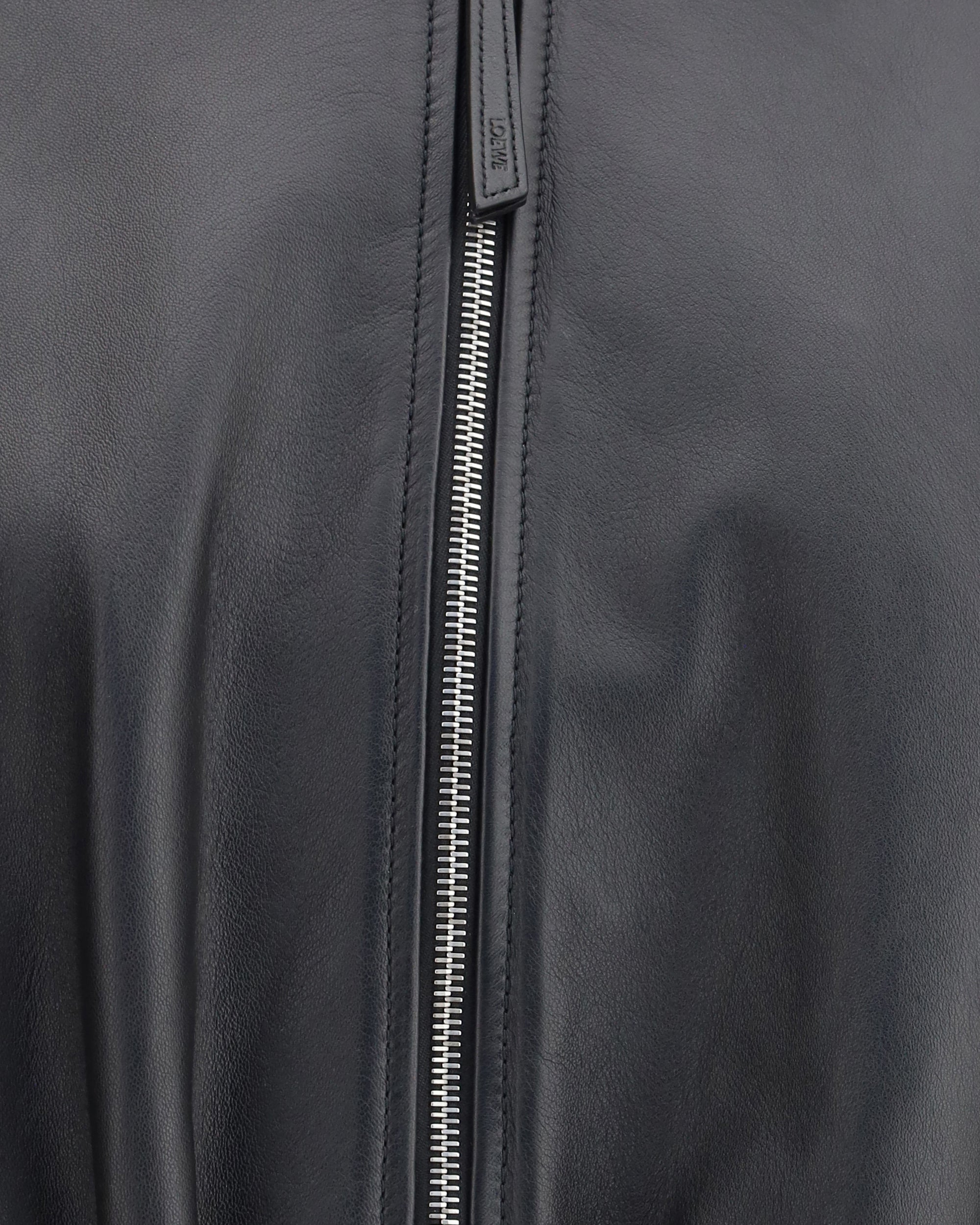 The Loewe leather Jacket is a bold and sophisticated piece, perfect for those seeking a bold and modern look. The classic collar gives it an elegant line, while the front zip closure offers a contemporary and practical touch. The two side welt pockets add a functional element, keeping the look clean and refined. The gathered hem gives a fluid and dynamic fit, while the patch with the iconic signature of the brand sewn on the back enriches the piece with a distinctive detail. A versatile jacket, which can be combined with both casual and more elegant looks, with a touch of luxury and modernity.