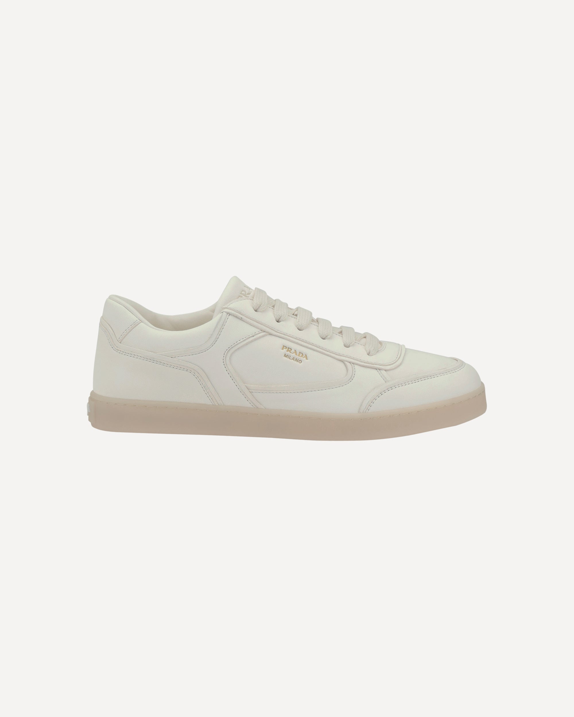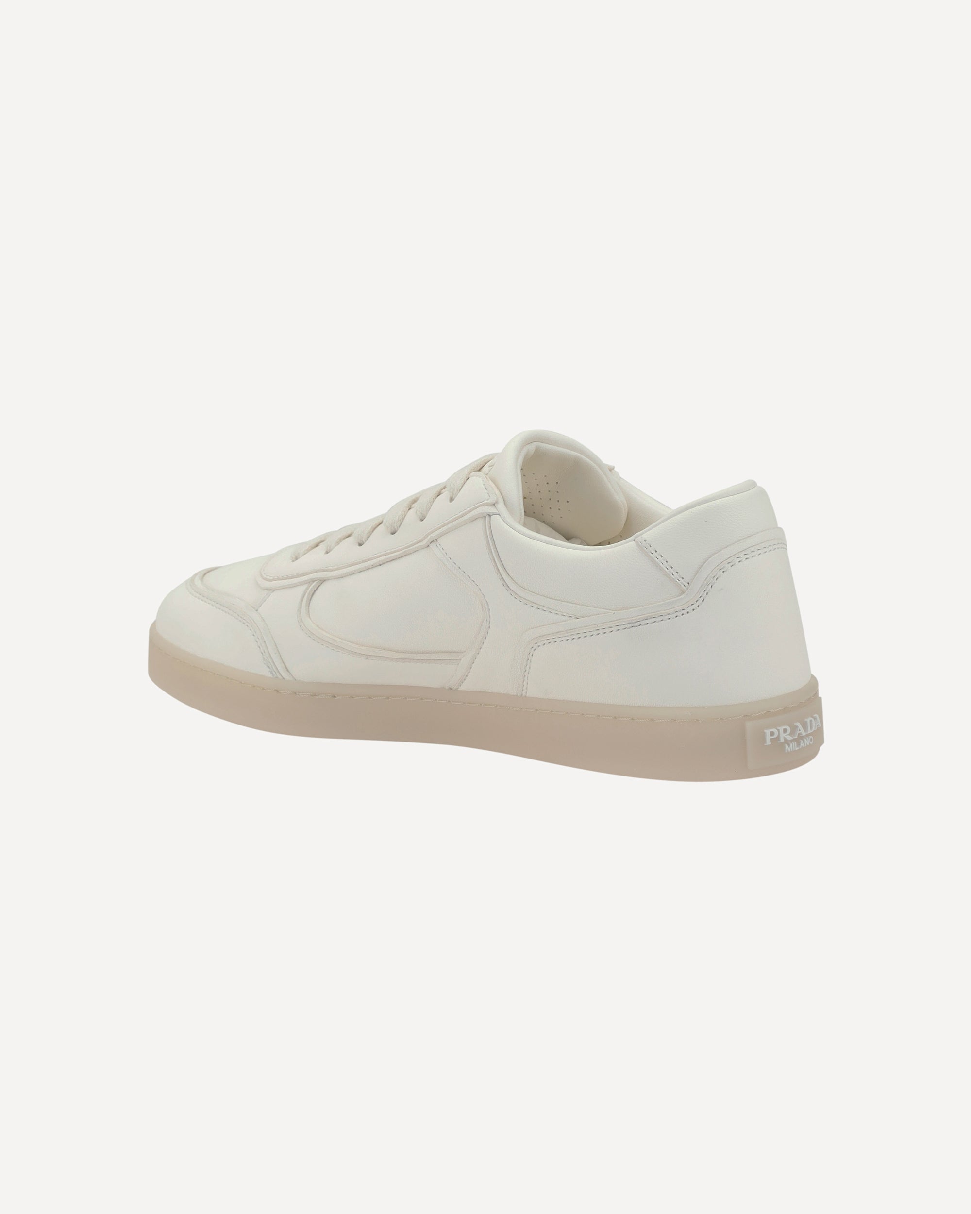 Prada's leather Sneakers are a stylish and versatile pair of shoes made of fine leather. They feature a lace-up front closure for a comfortable and secure fit and a round toe that emphasizes the classic design. The iconic press-stamped monogram on the outer side panel adds a distinctive and recognizable brand touch. The flat sole provides comfort and stability, while the branded insole lends an additional luxury detail.