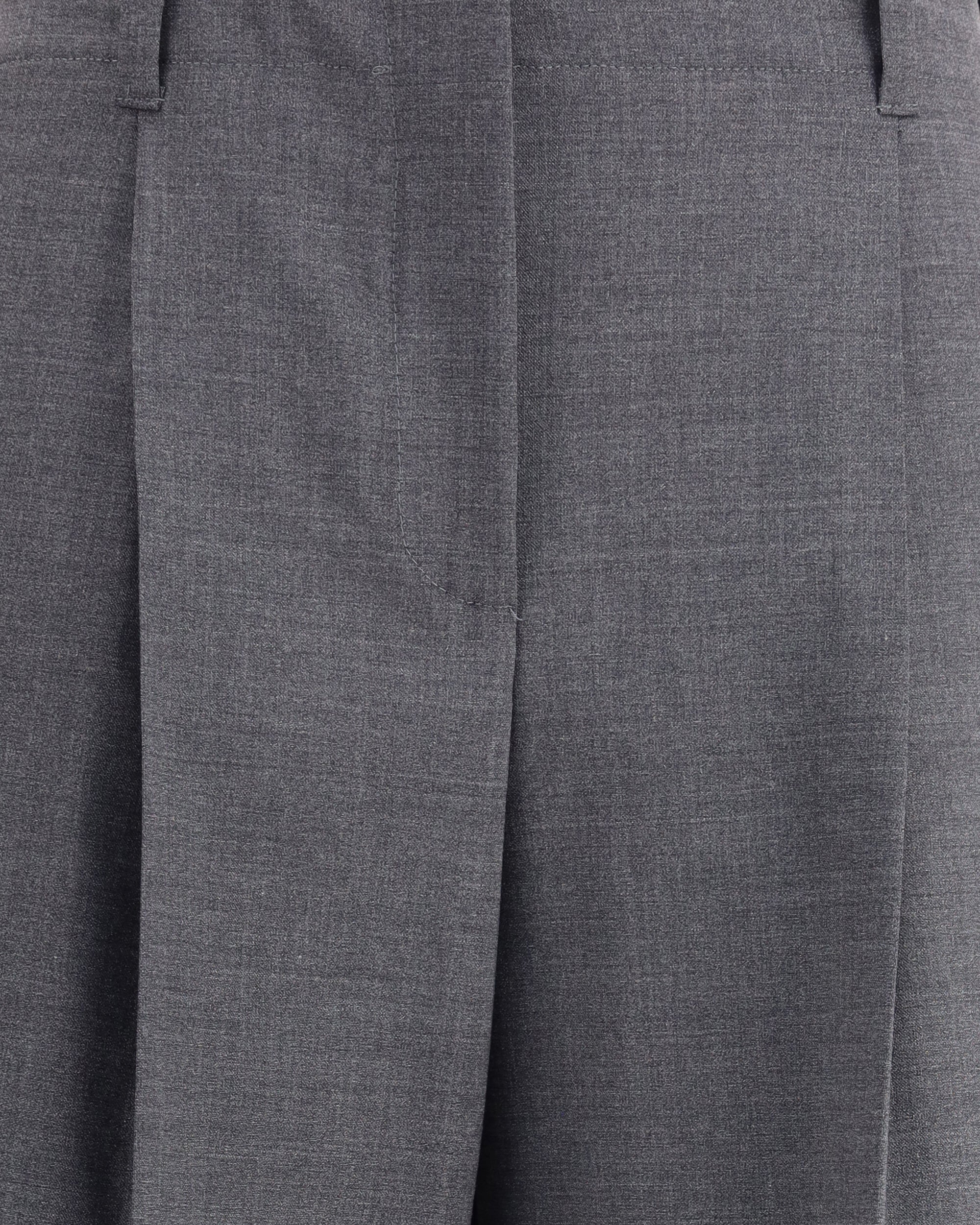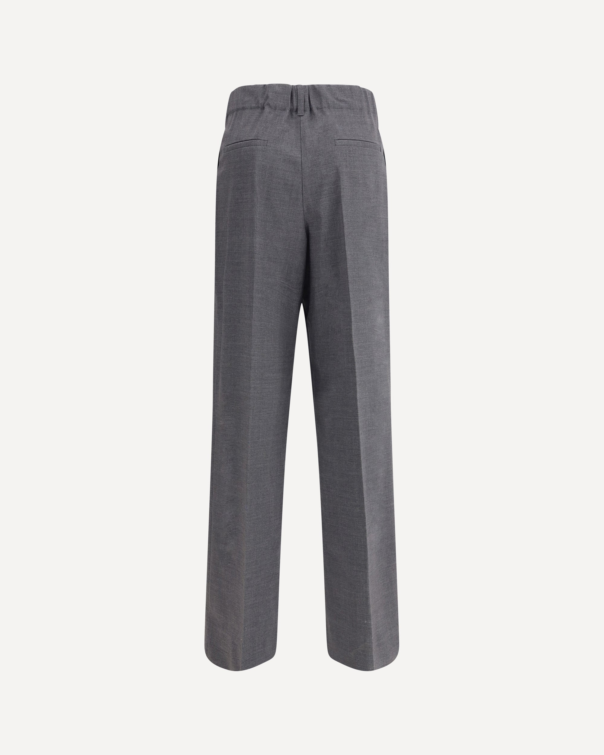Virgin Wool Pants by P.A.R.O.S.H, wide-leg pattern, elasticized waistband, front button and zipper closure, two side slash pockets, two welt pockets on back, belt loops waistband.