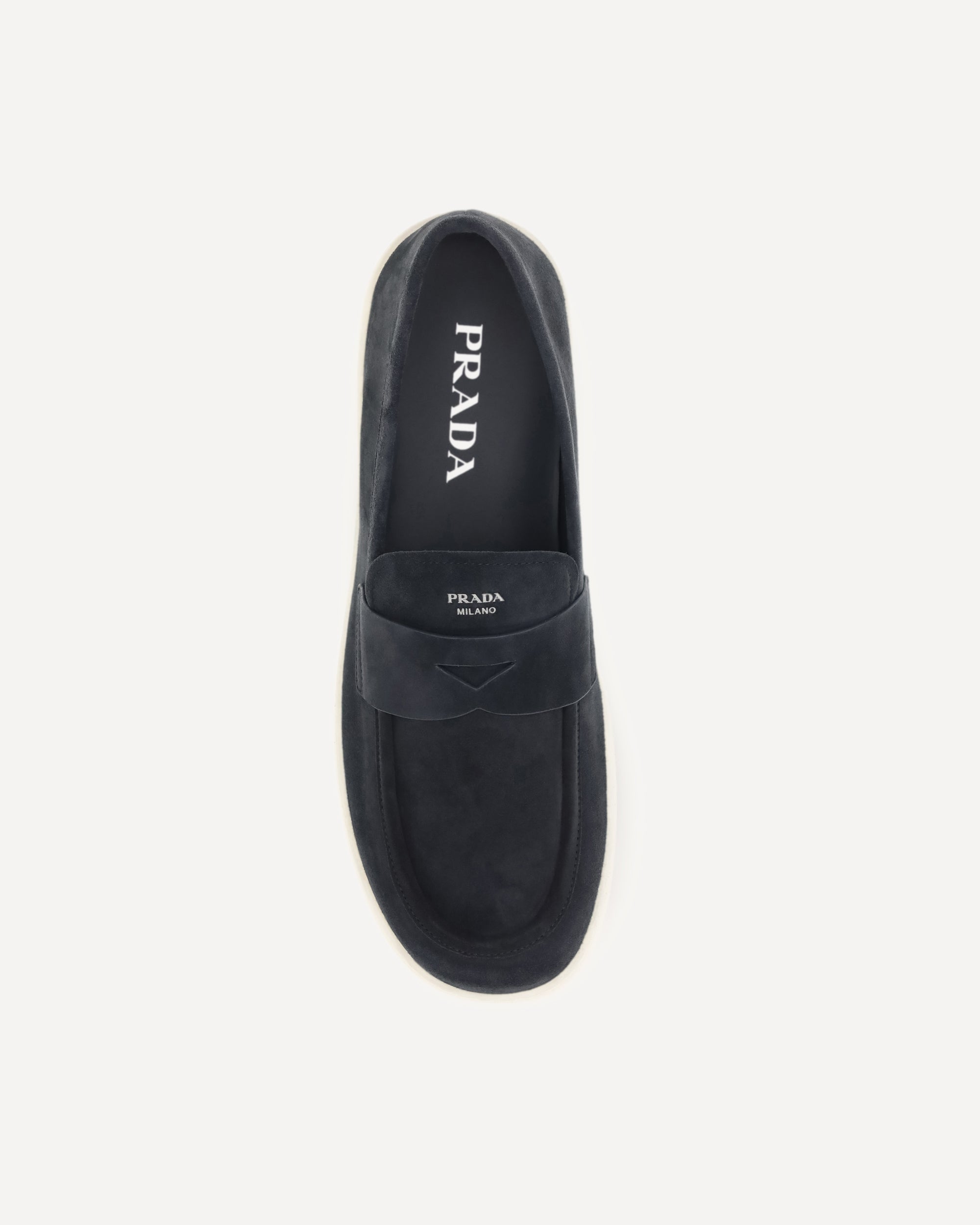 The suede Loafers by Prada are a sophisticated and versatile piece, perfect for those seeking timeless elegance. The round toe and mask give them a classic, refined design, while the laminated logo print on the instep adds a distinctive, modern touch. The logo-printed interior and contrasting sole complete the look, making these loafers not only elegant but also comfortable. Ideal for a chic, refined look, they are perfect for a variety of occasions, from work to casual outings.