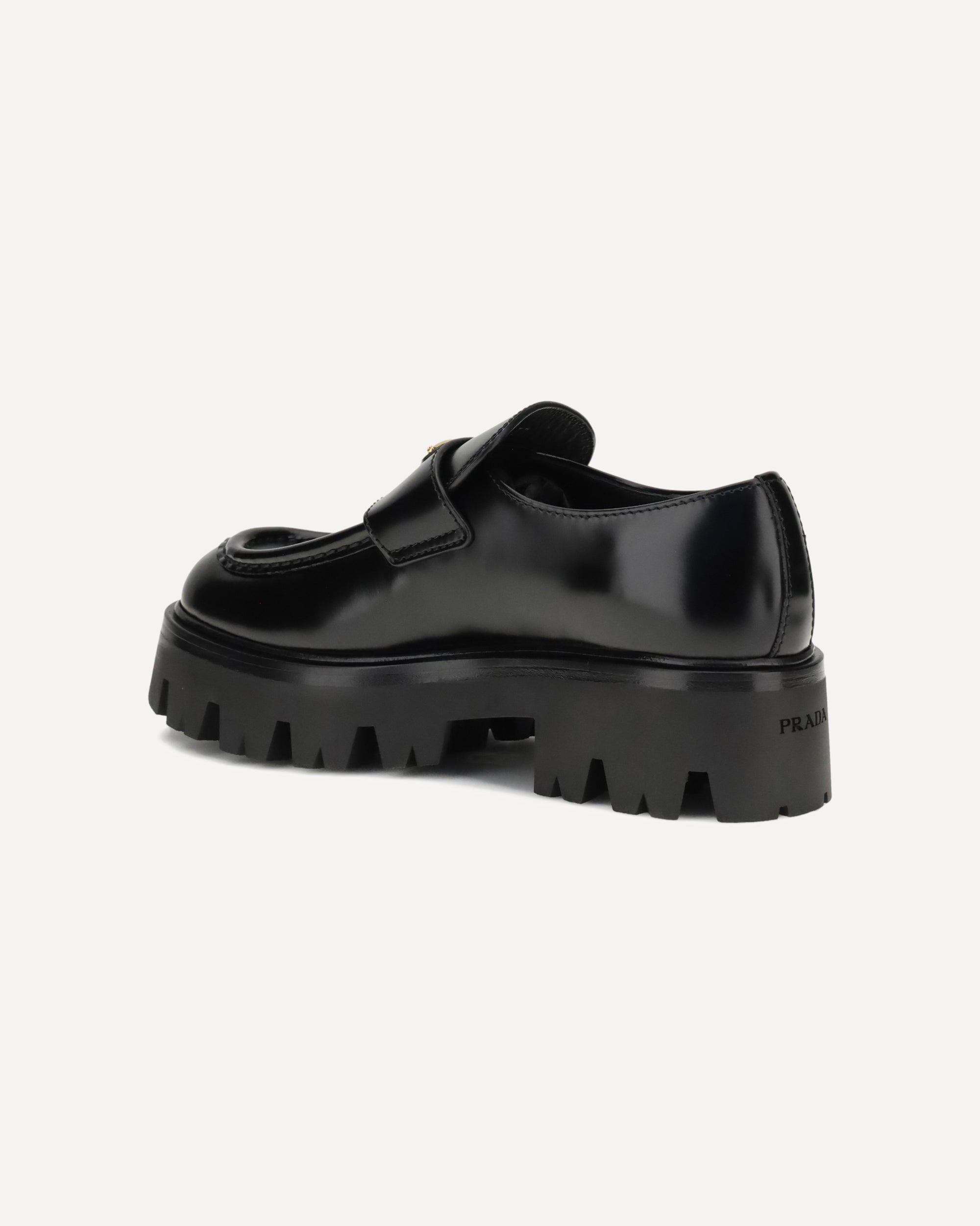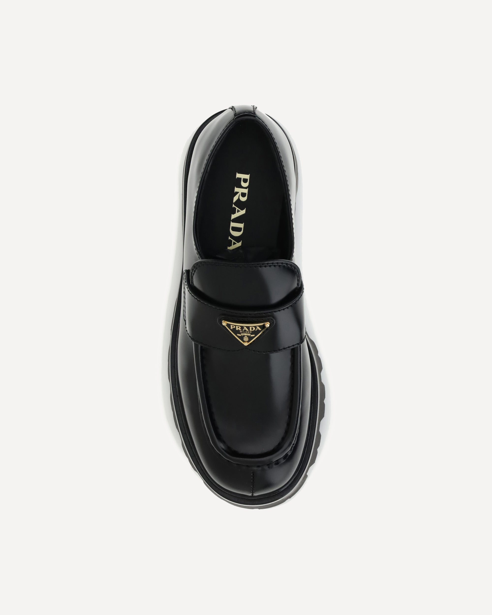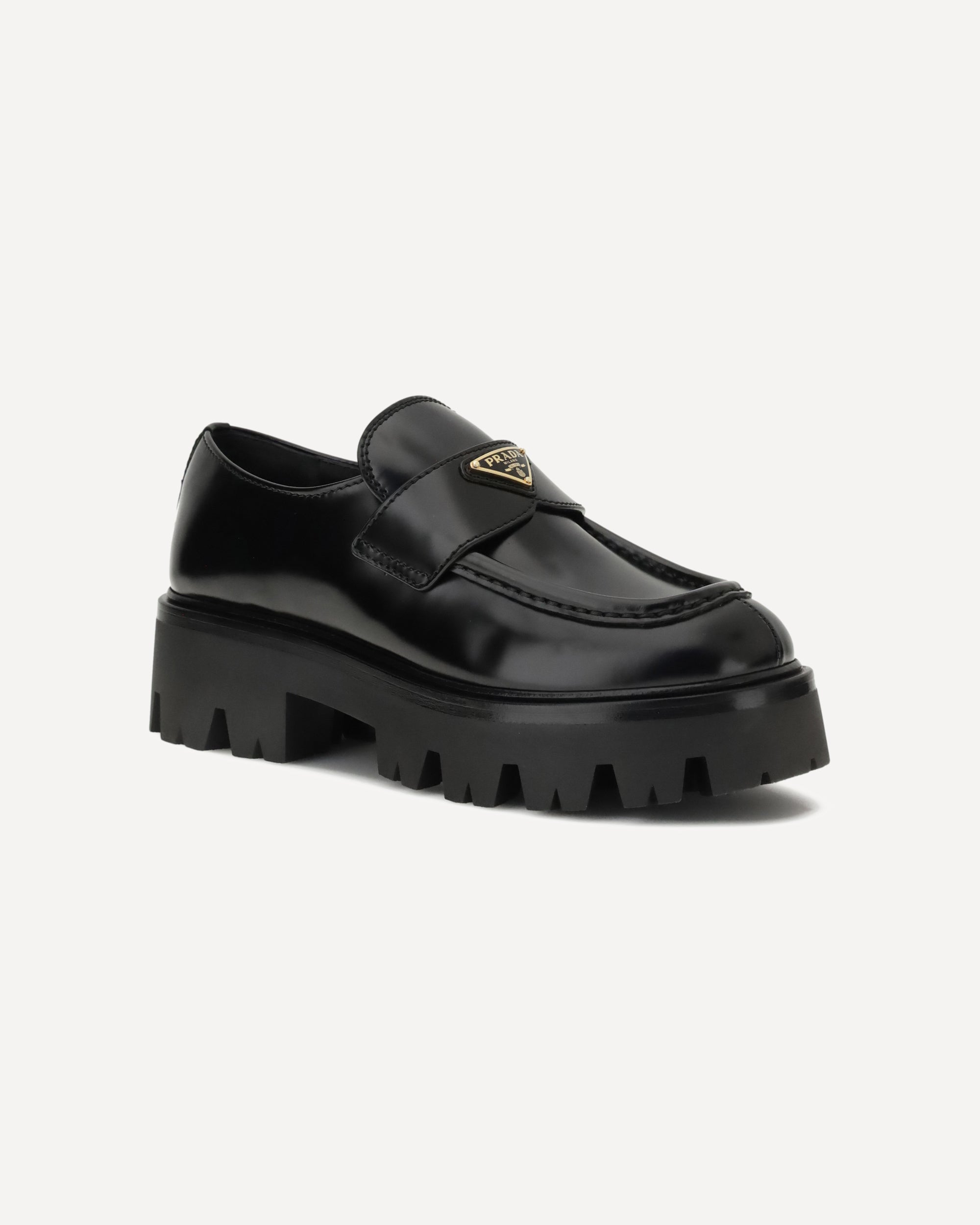 Brushed leather Monolith Loafers by Prada reinterpret a classic with a bold, contemporary twist. Featuring a leather horsebit upper with metallic detail, they have a burlotto bowl and an all-leather lining. The foam sole with block tread gives them lightness, volume and a bold attitude, perfect for completing metropolitan looks with personality.