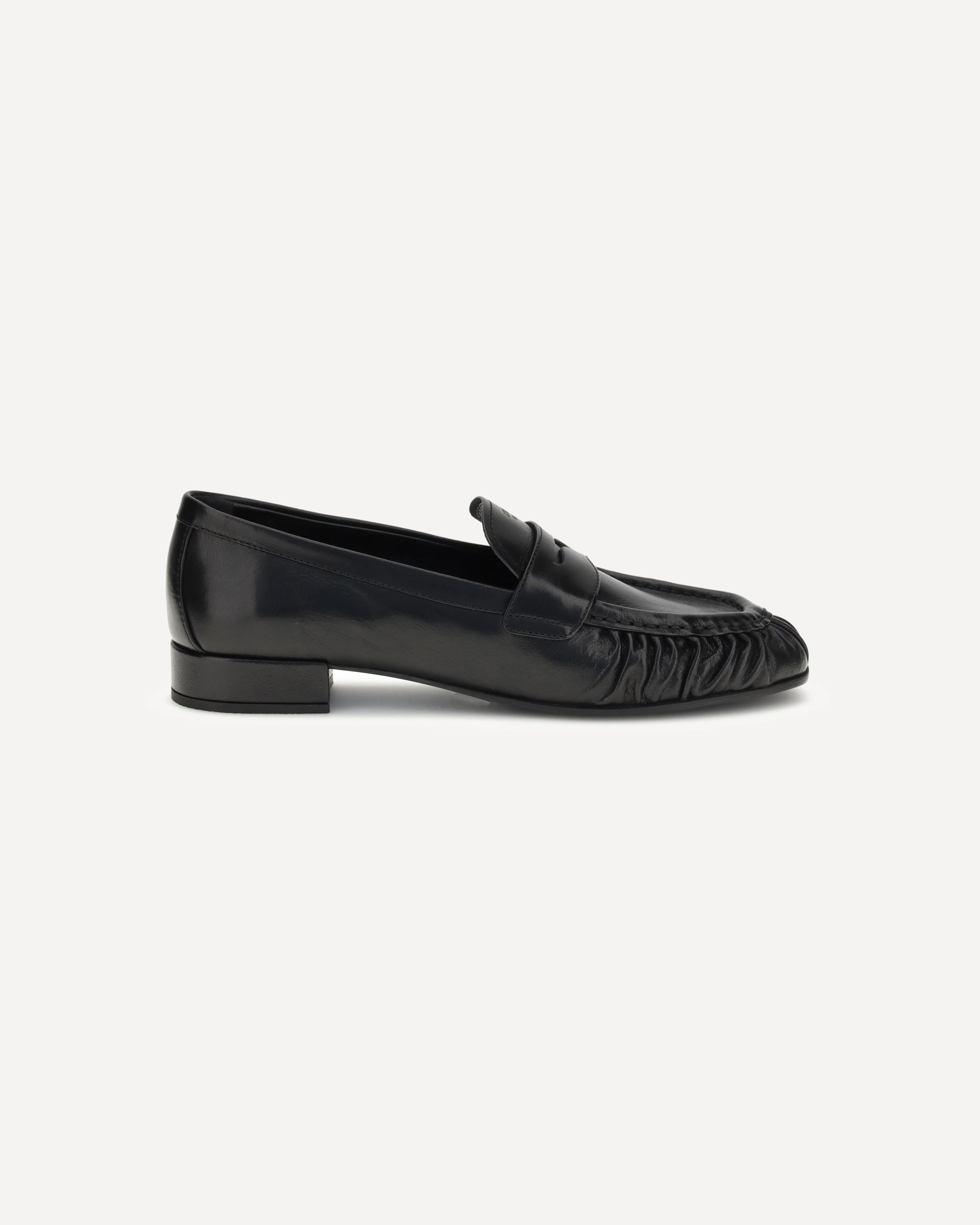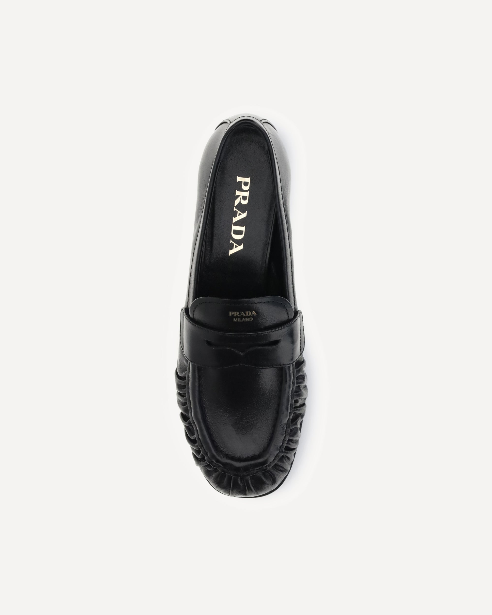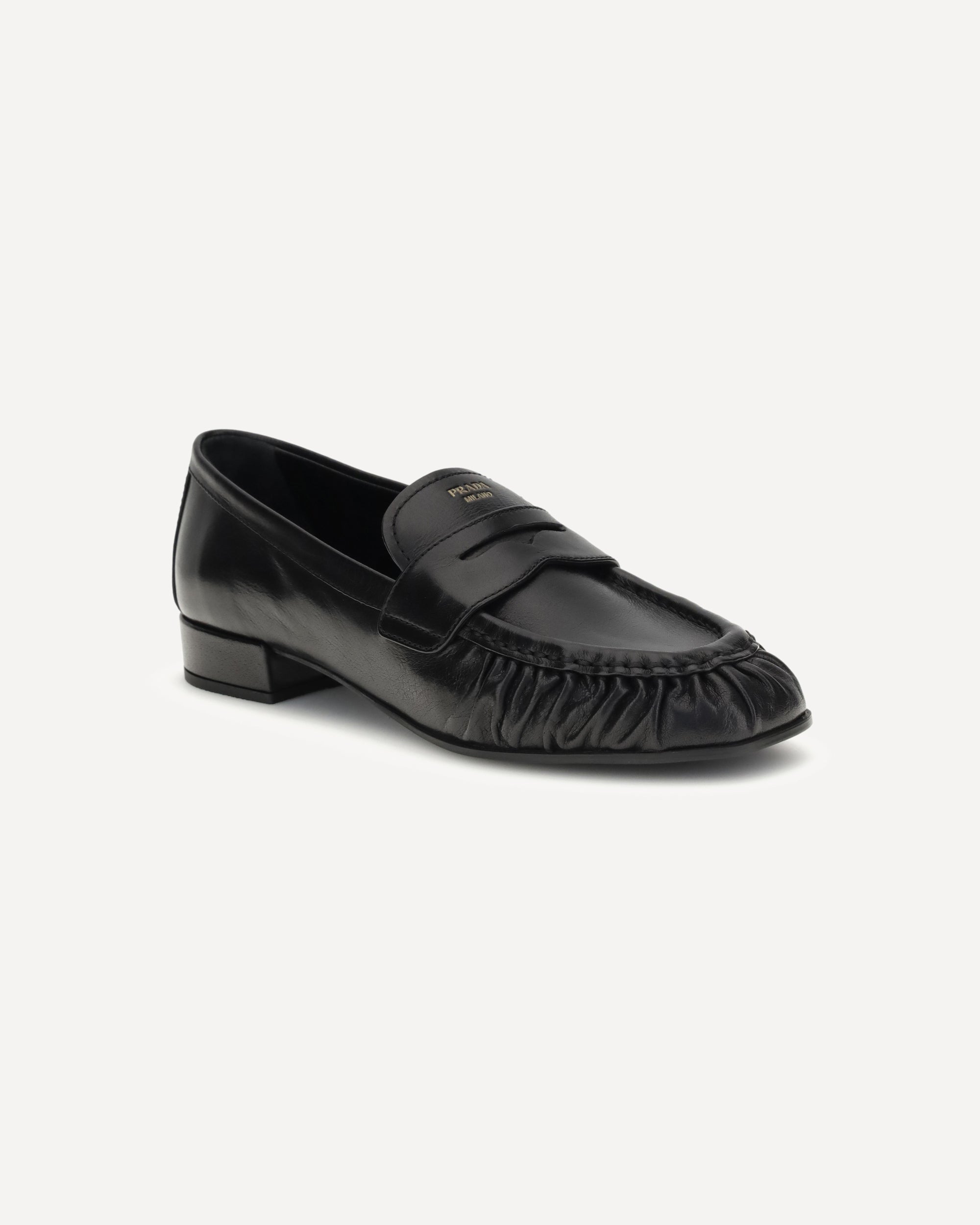 Prada's leather Loafers combine classic elegance with a contemporary spirit. Crafted in smoky brushed leather, they feature a tapered, lightweight silhouette that enhances the handcrafted construction. The essential design is complemented by the lettering logo and block heel for the perfect balance of sophistication and modernity.