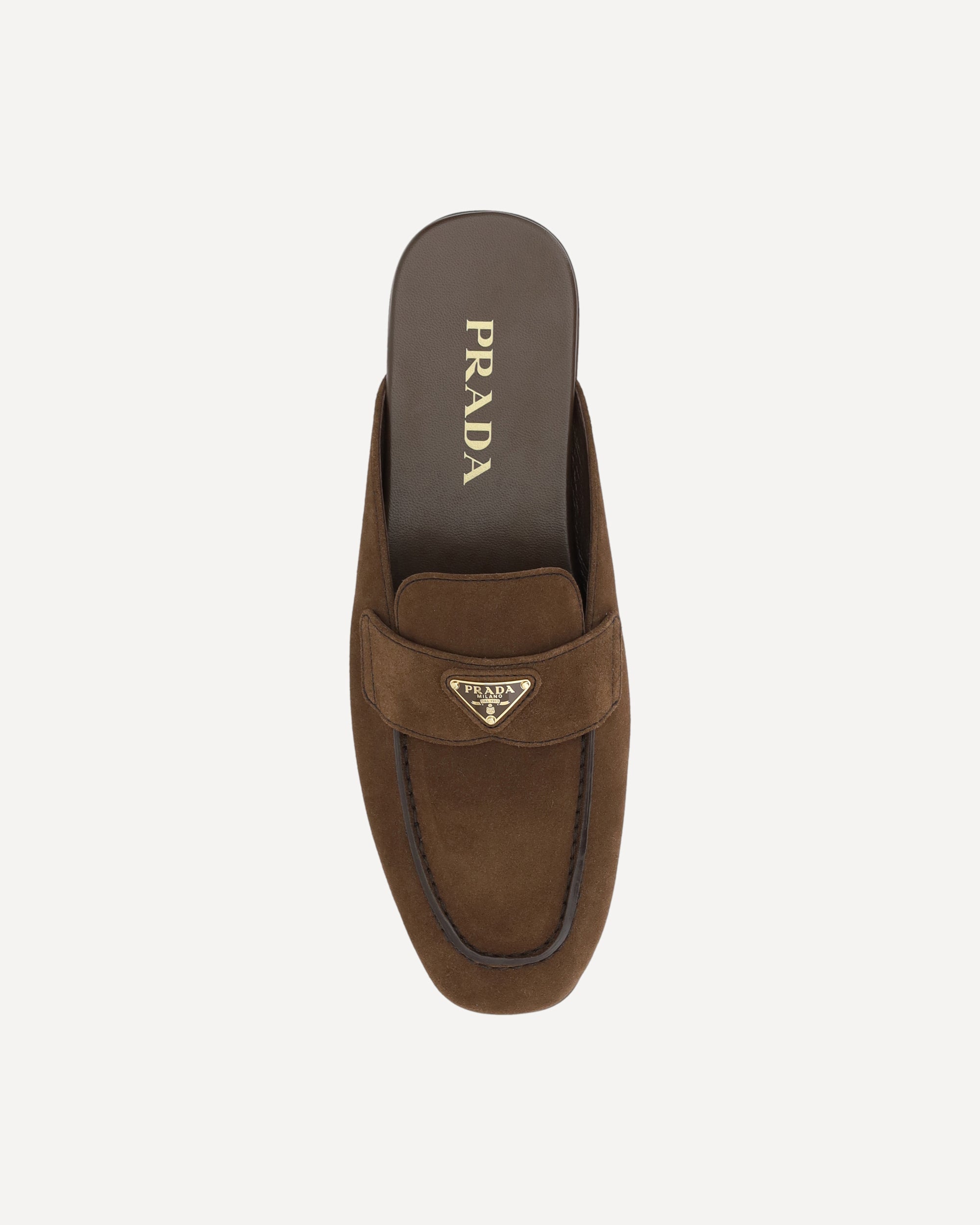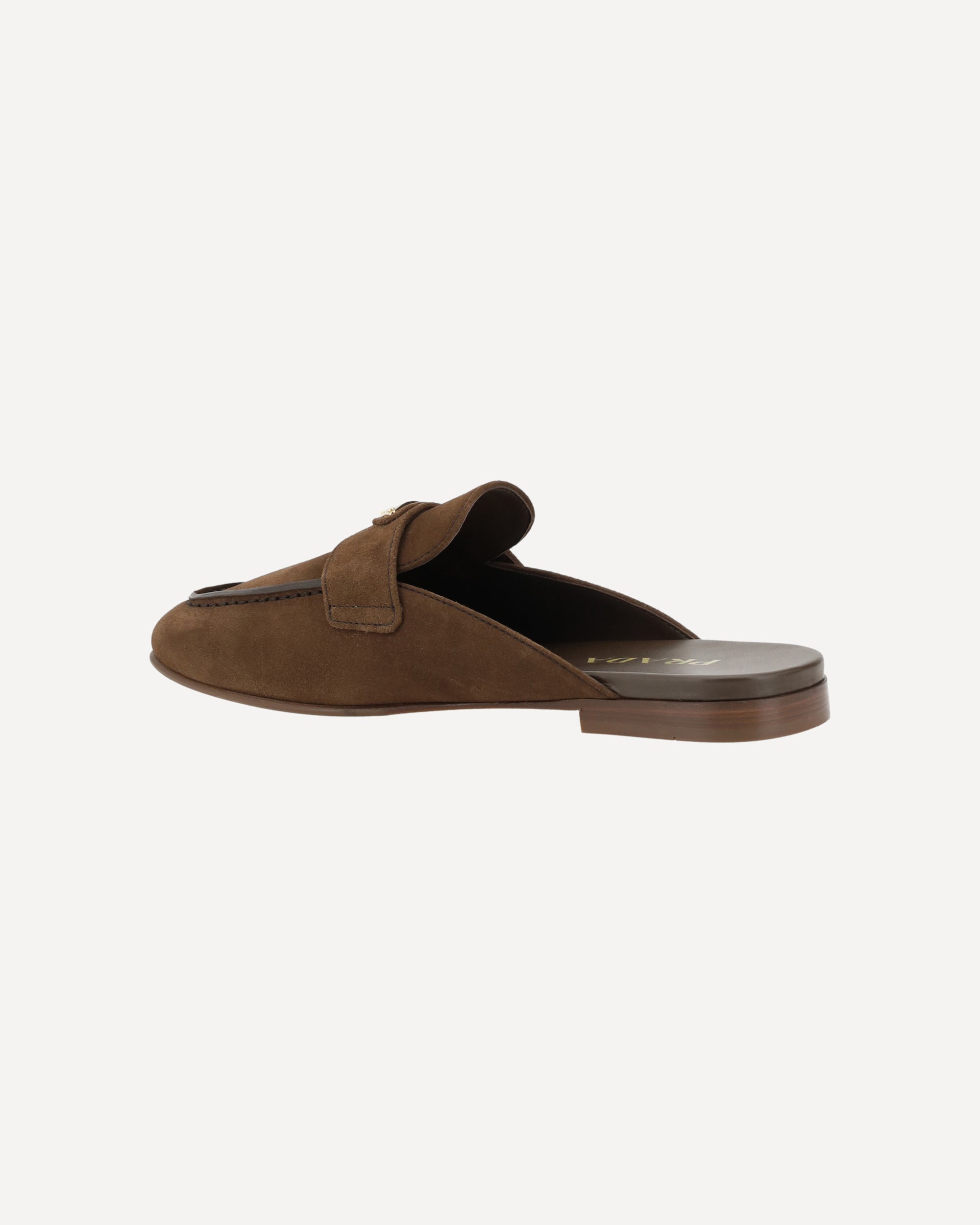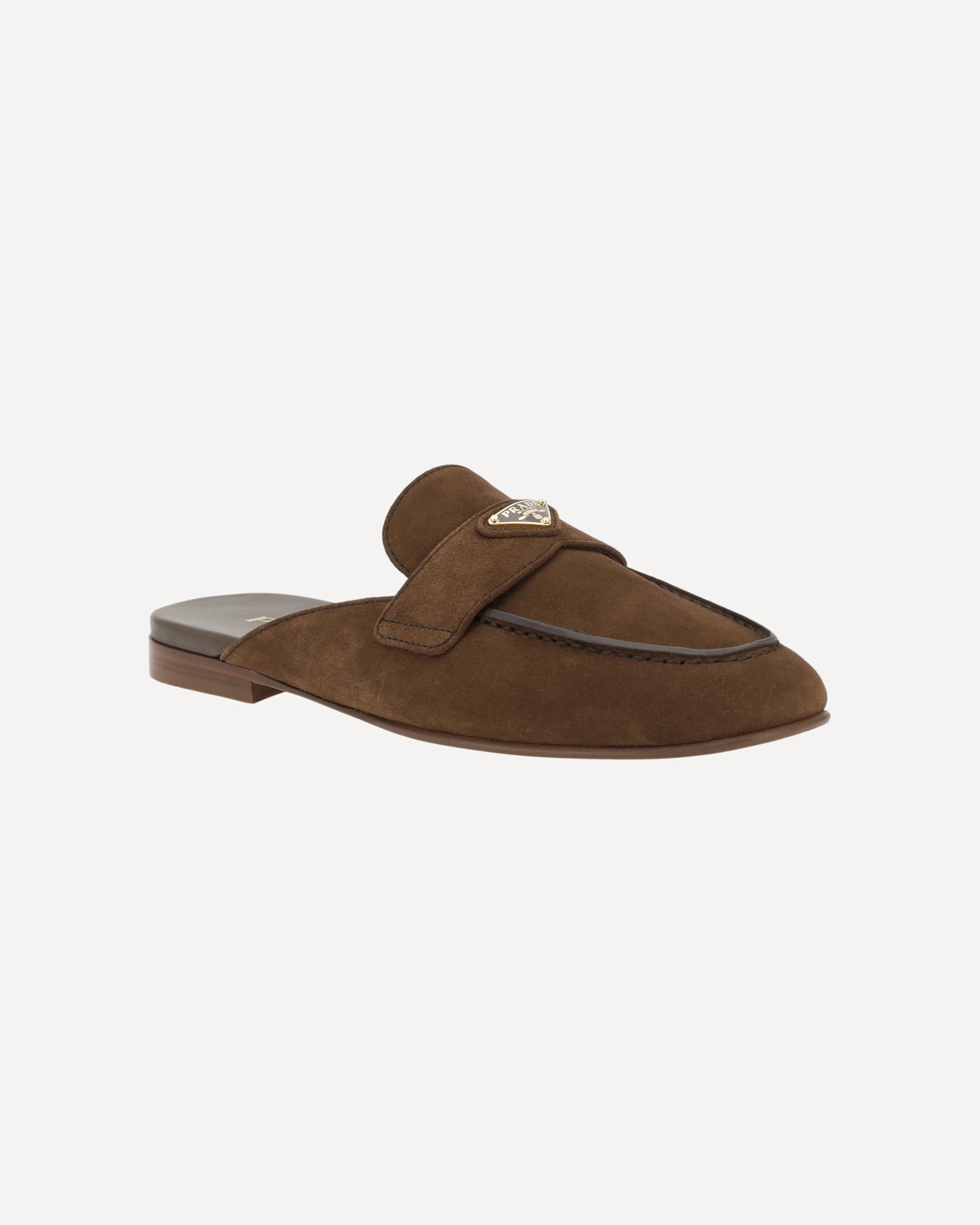 Prada's suede Mules is an elegant loafer style open at the heel with a round toe. The iconic triangular logoed plaque is applied to the front, adding a distinctive detail. The slight block heel and logoed insole complete the design, combining comfort and style in a sophisticated and versatile accessory.