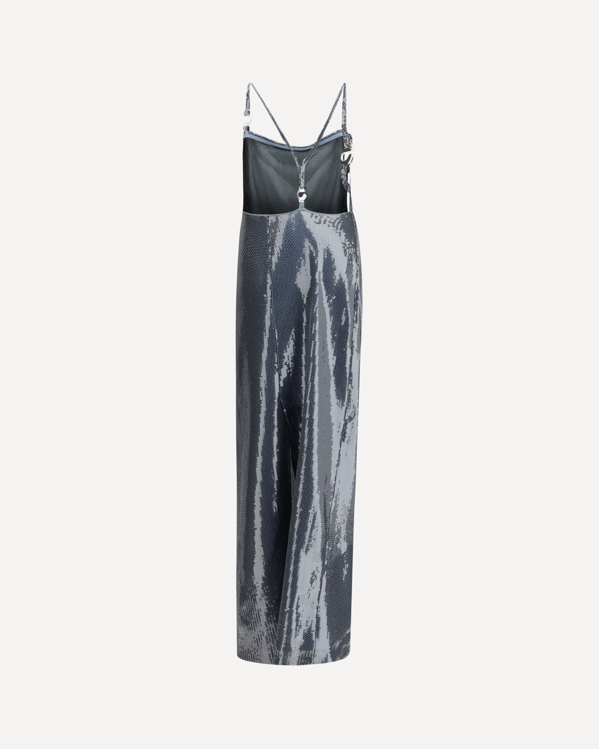 The Ruched Sequin-Embellished Gown by Coperni showcases the French label’s signature talent for reworking complex constructions into sleek, minimal silhouettes. Cut from fully sequined fabric for a shimmering finish, the close-fitting design features an open back with asymmetric straps, connected by silver-tone logo charms. A concealed back zip fastening ensures a refined and flawless fit, making this gown the ultimate party statement.