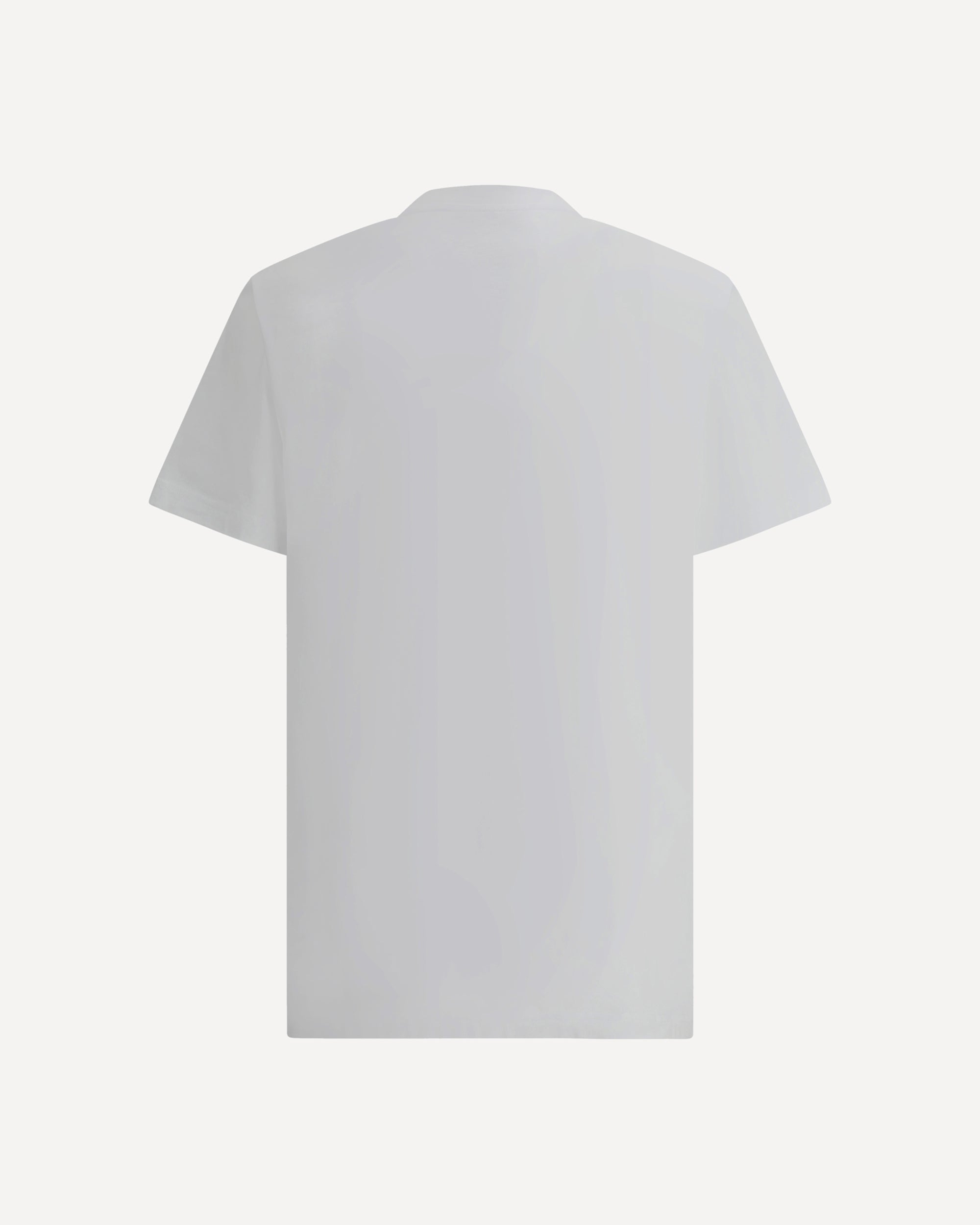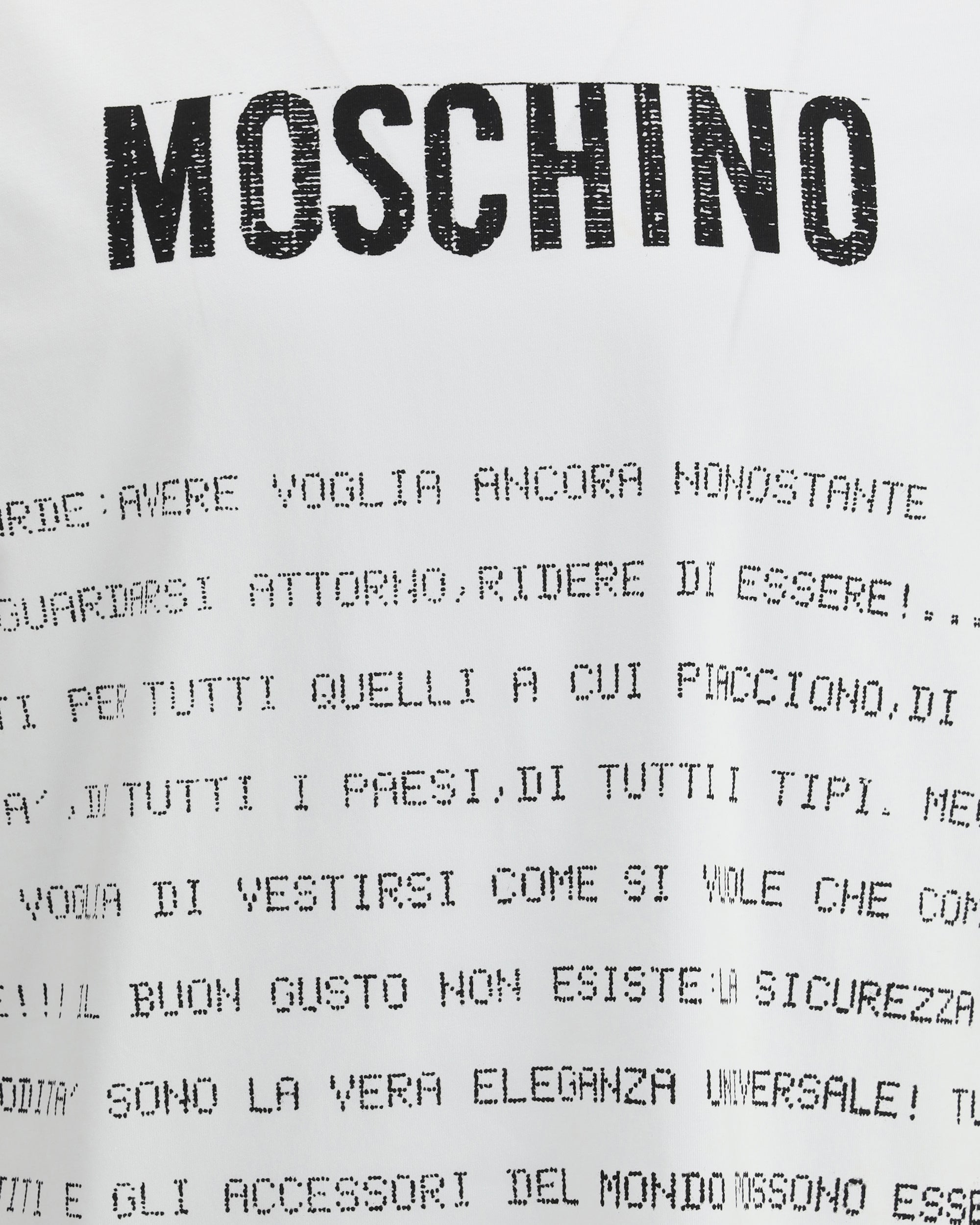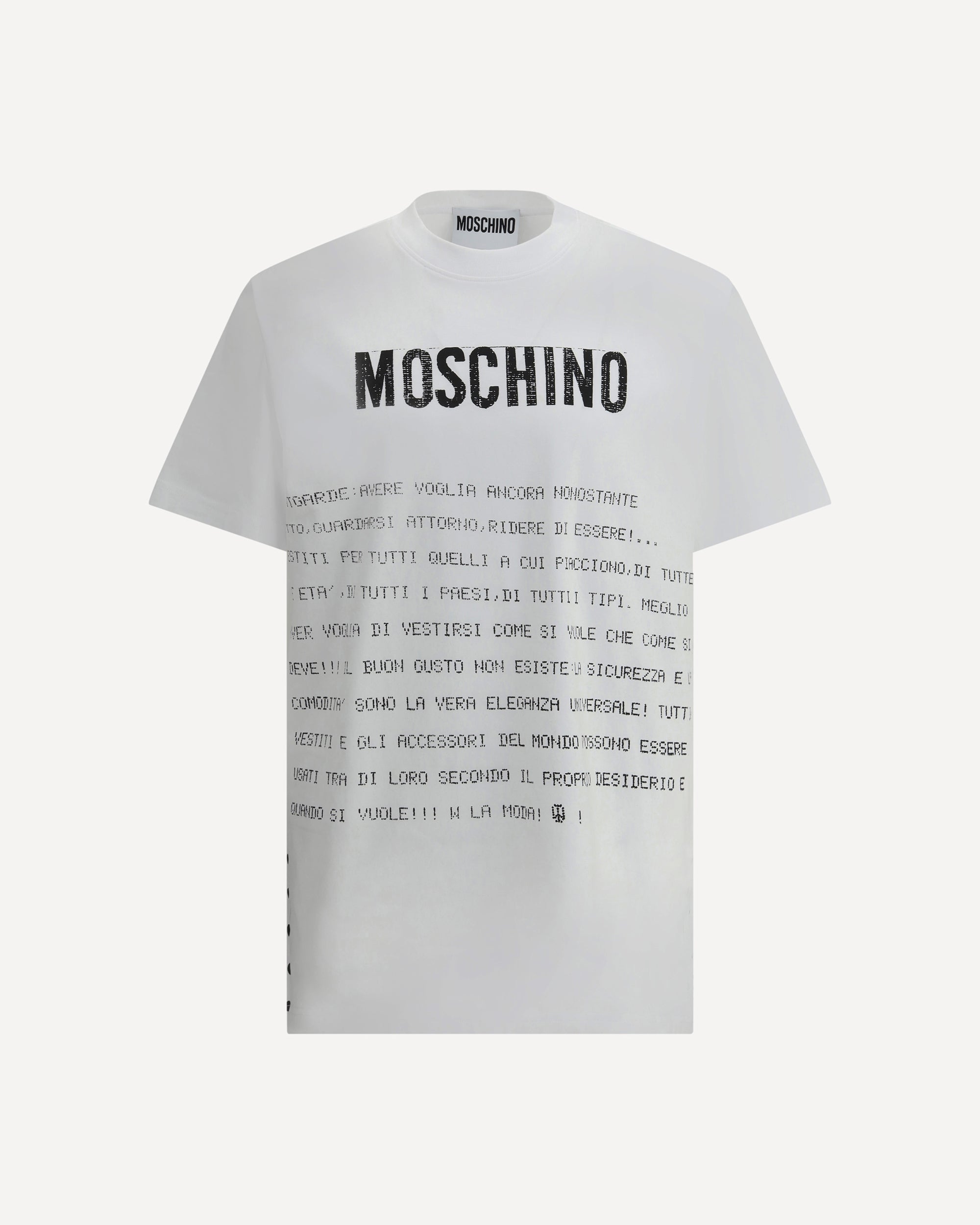 Moschino's cotton logo T-Shirt features a ribbed crew neck. The brand's iconic monogram and a text are contrastingly printed on the front, creating a bold and distinctive detail. A simple yet impactful garment, perfect for a casual, modern look that elegantly expresses Moschino's signature character and irony.