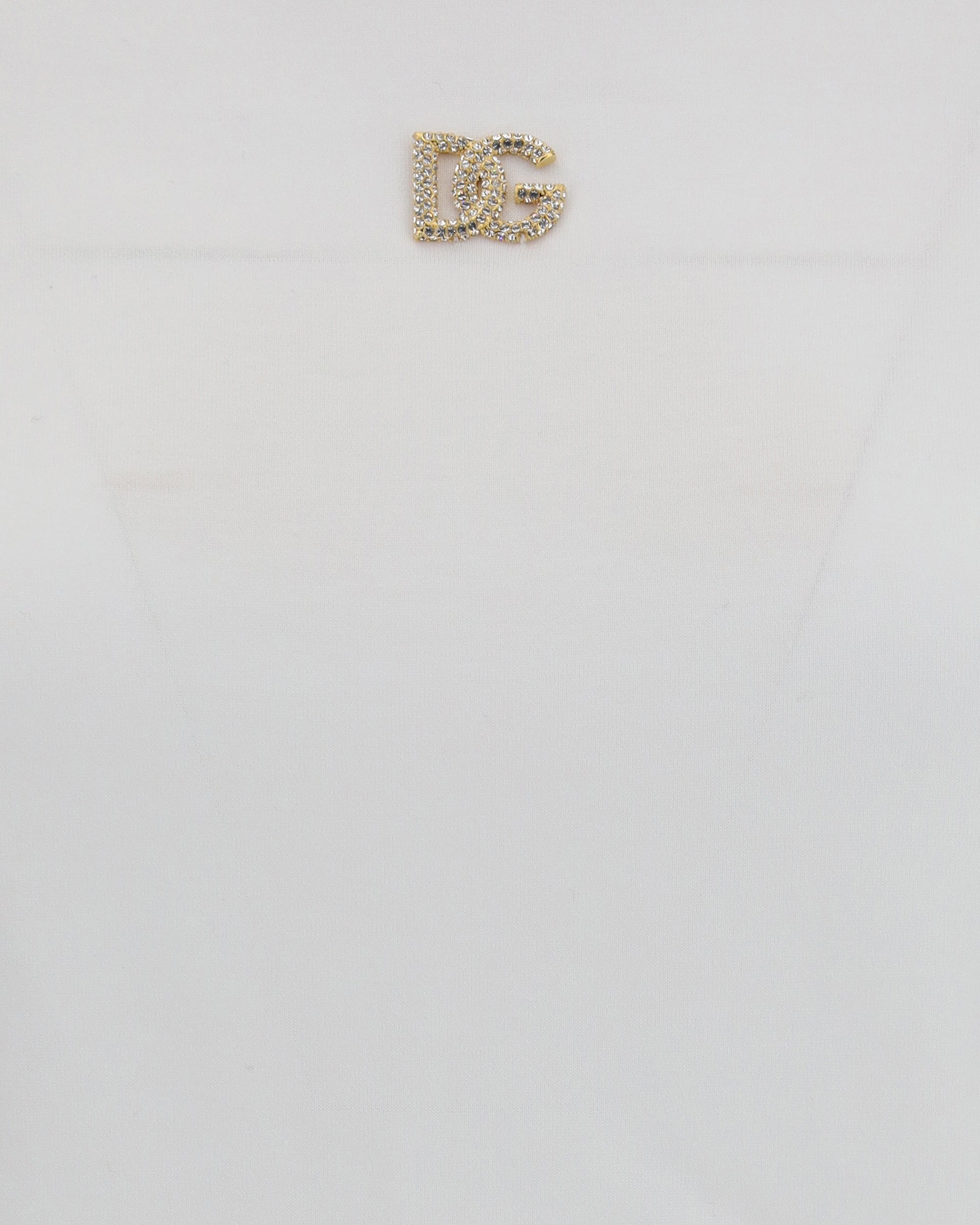 Dolce&Gabbana's T-shirt is an item that blends the comfort of casual design with a touch of luxury. The ribbed crew neck offers a snug and comfortable fit, while the brand's iconic logo, applied with rhinestones on the front, adds a glamorous and sophisticated accent. This shimmering detail gives an elegant and modern twist to an otherwise simple silhouette, making it perfect for those seeking a casual look but with a touch of sophistication.
