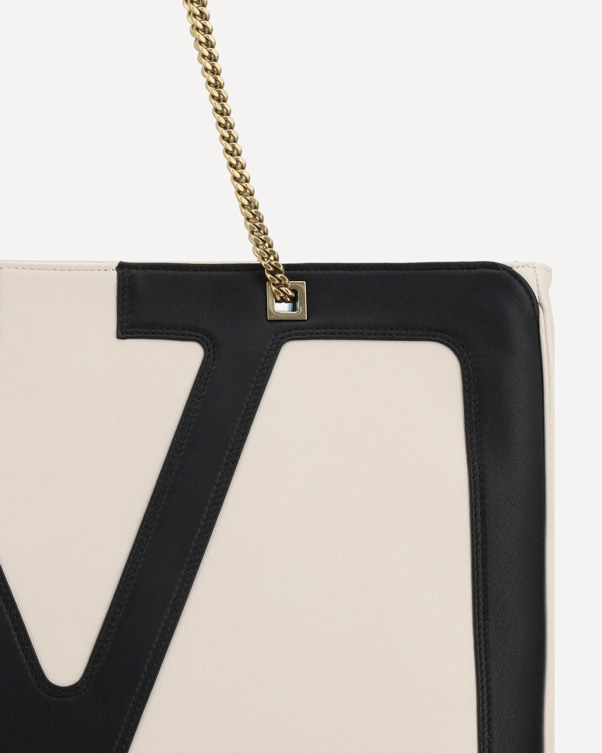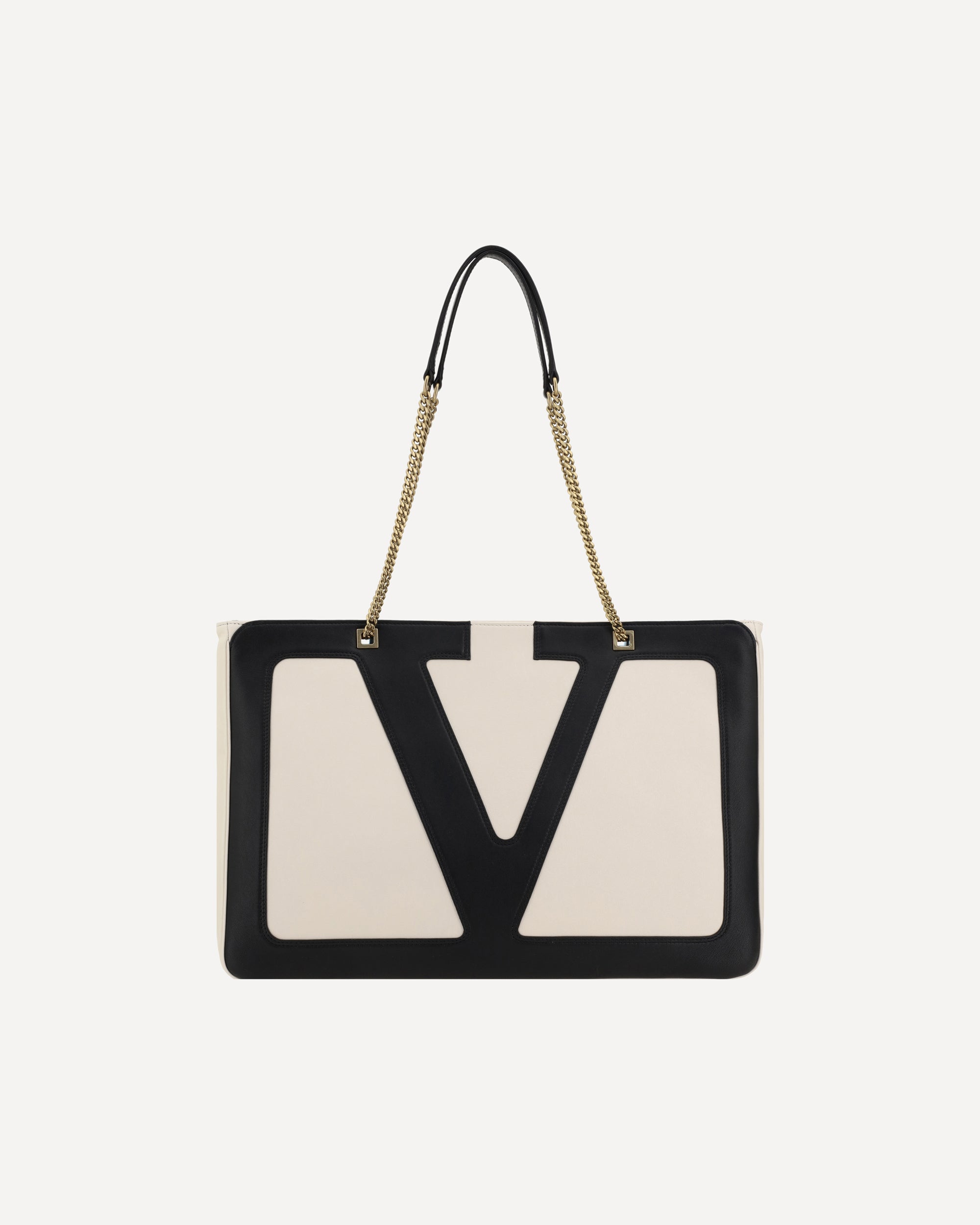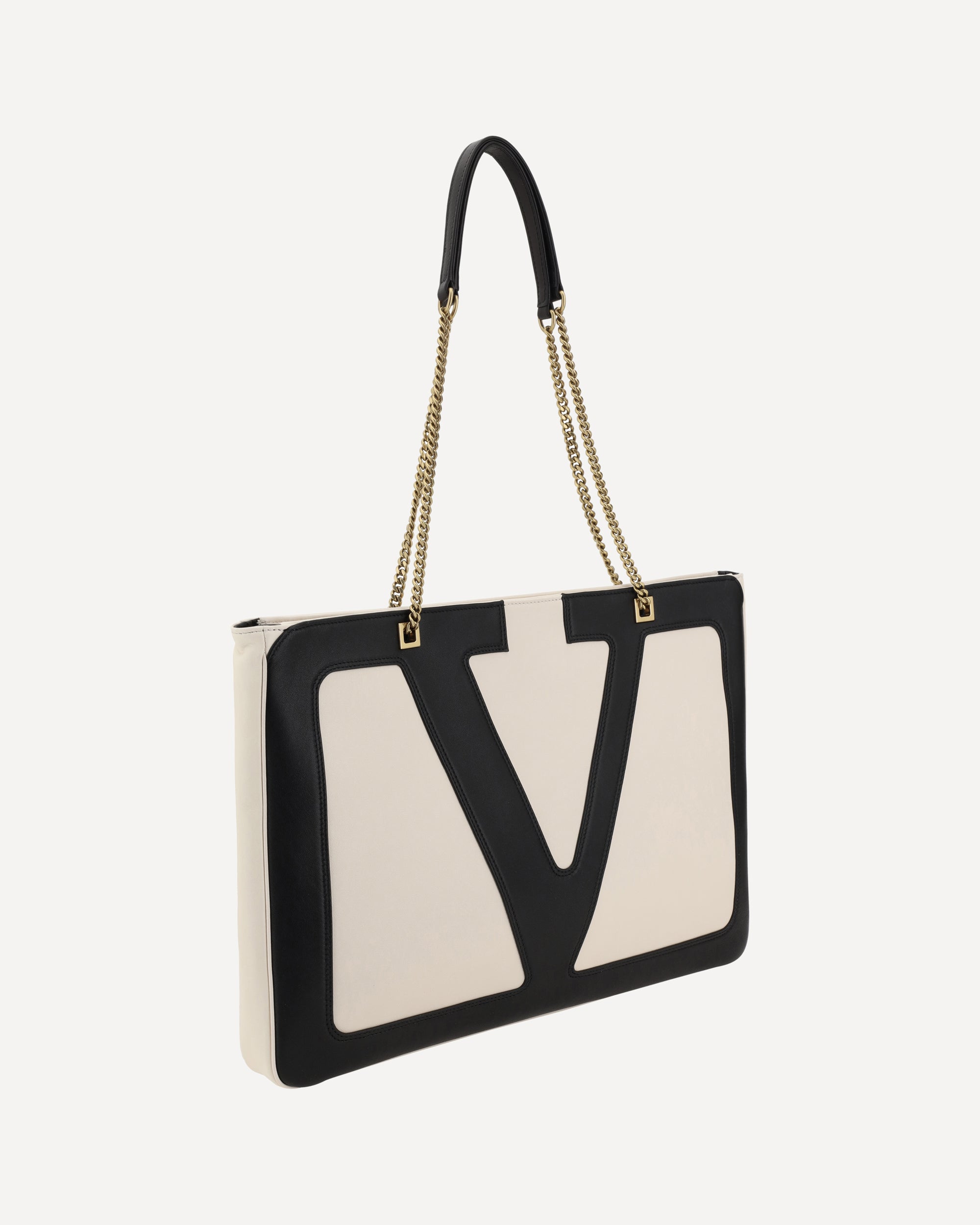 Valentino Garavani's leather Shoulder Bag features chain handles with flat leather insert, combining elegance and practicality. The contrasting oversize VLogo on the front adds a distinctive, modern touch. The zippered welt pocket on the back offers extra space for smaller items, while the interior features a single compartment, combining functionality and refined style.