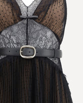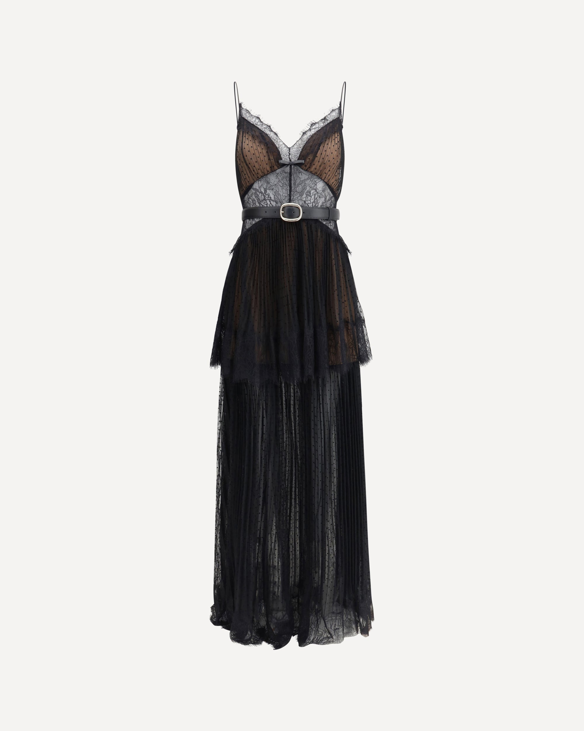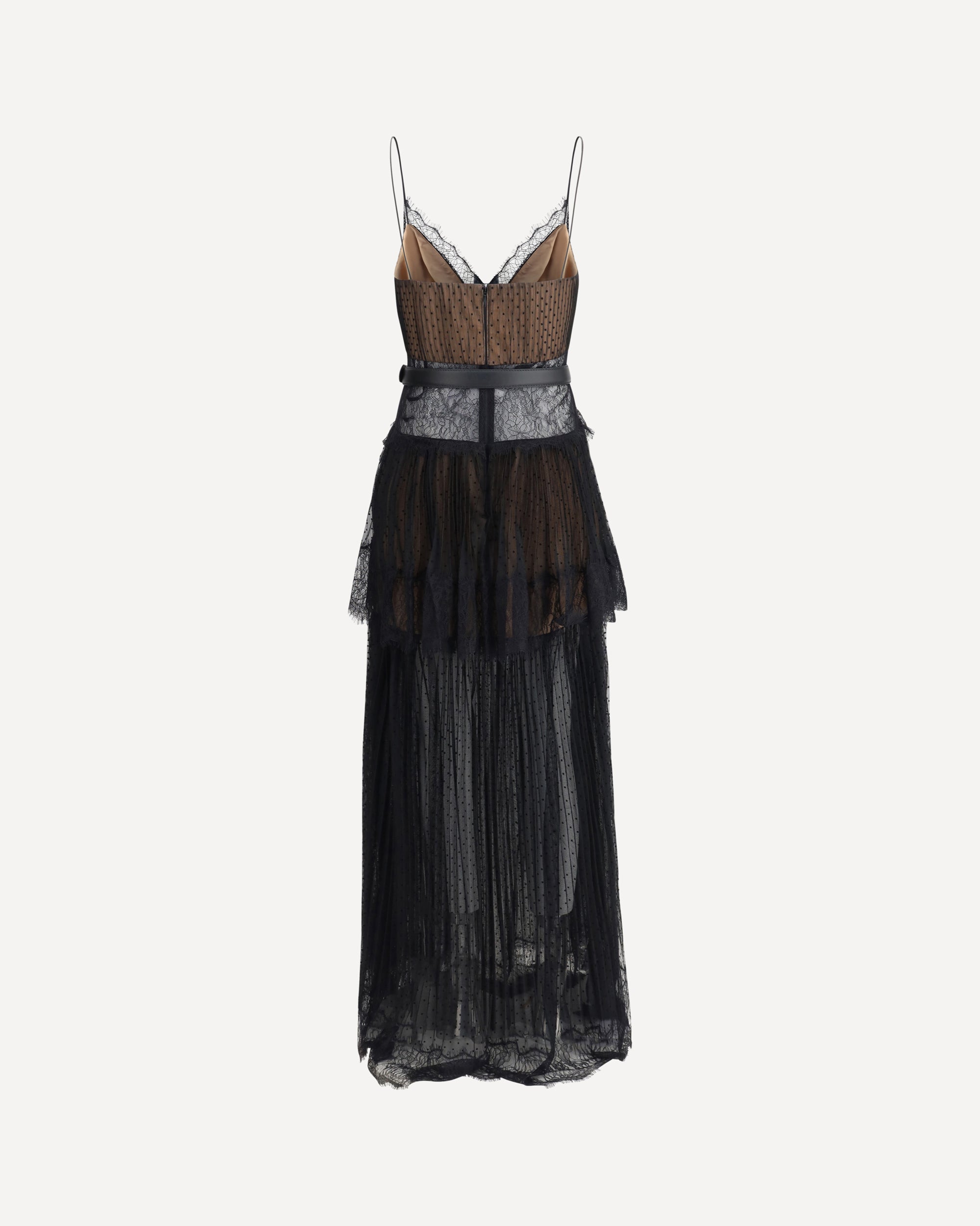 Long Dress by Self-Portrait has a romantic and feminine design. Featuring thin straps and a sweetheart neckline at the front, it features an elegant semi-sheer lace bodice that gives a delicate and sophisticated touch. The back zipper closure ensures a clean line, while the removable belt allows you to define the silhouette with versatility. Complemented by a ruffle skirt, which adds movement and lightness. Perfect for elegant events and ceremonies.