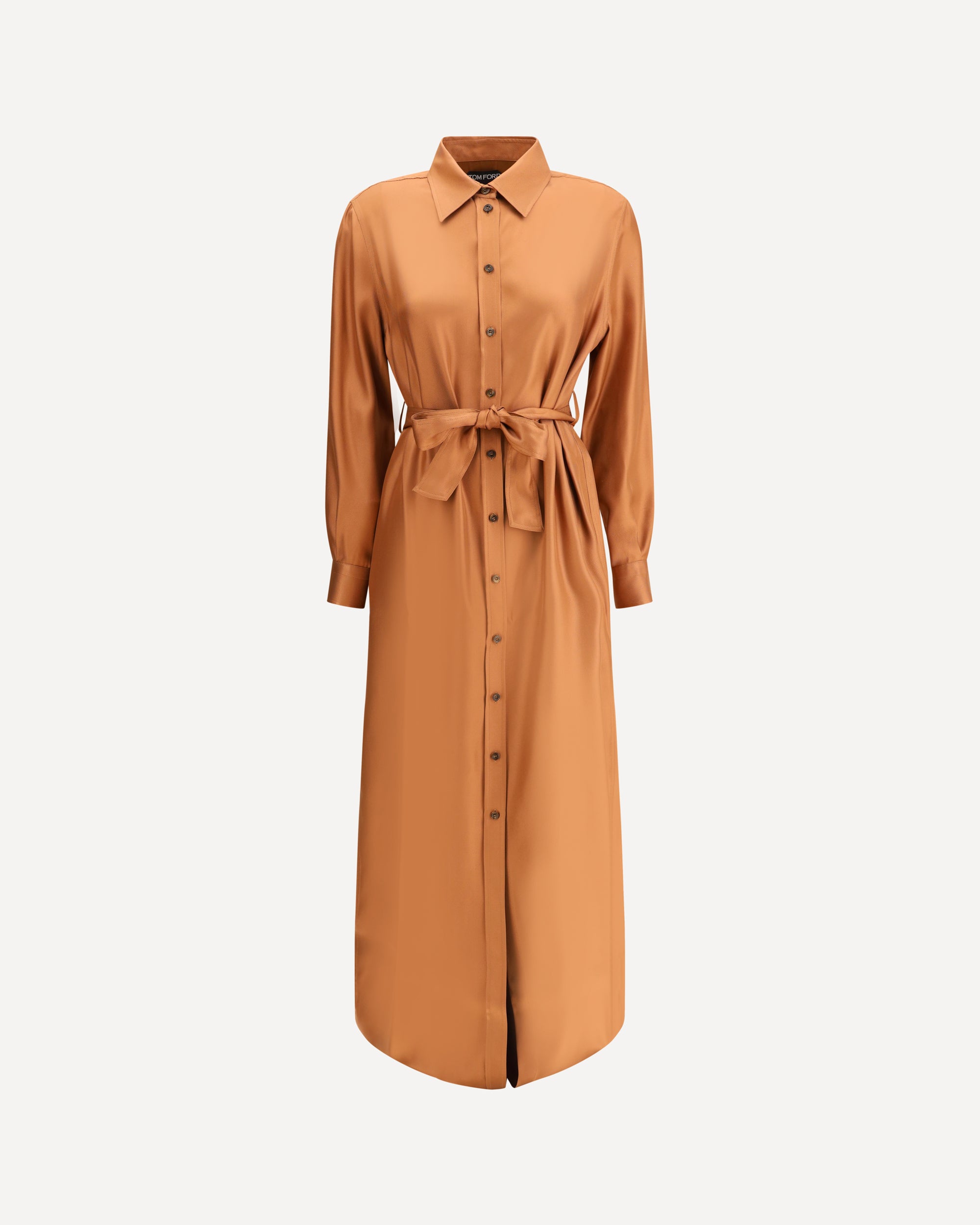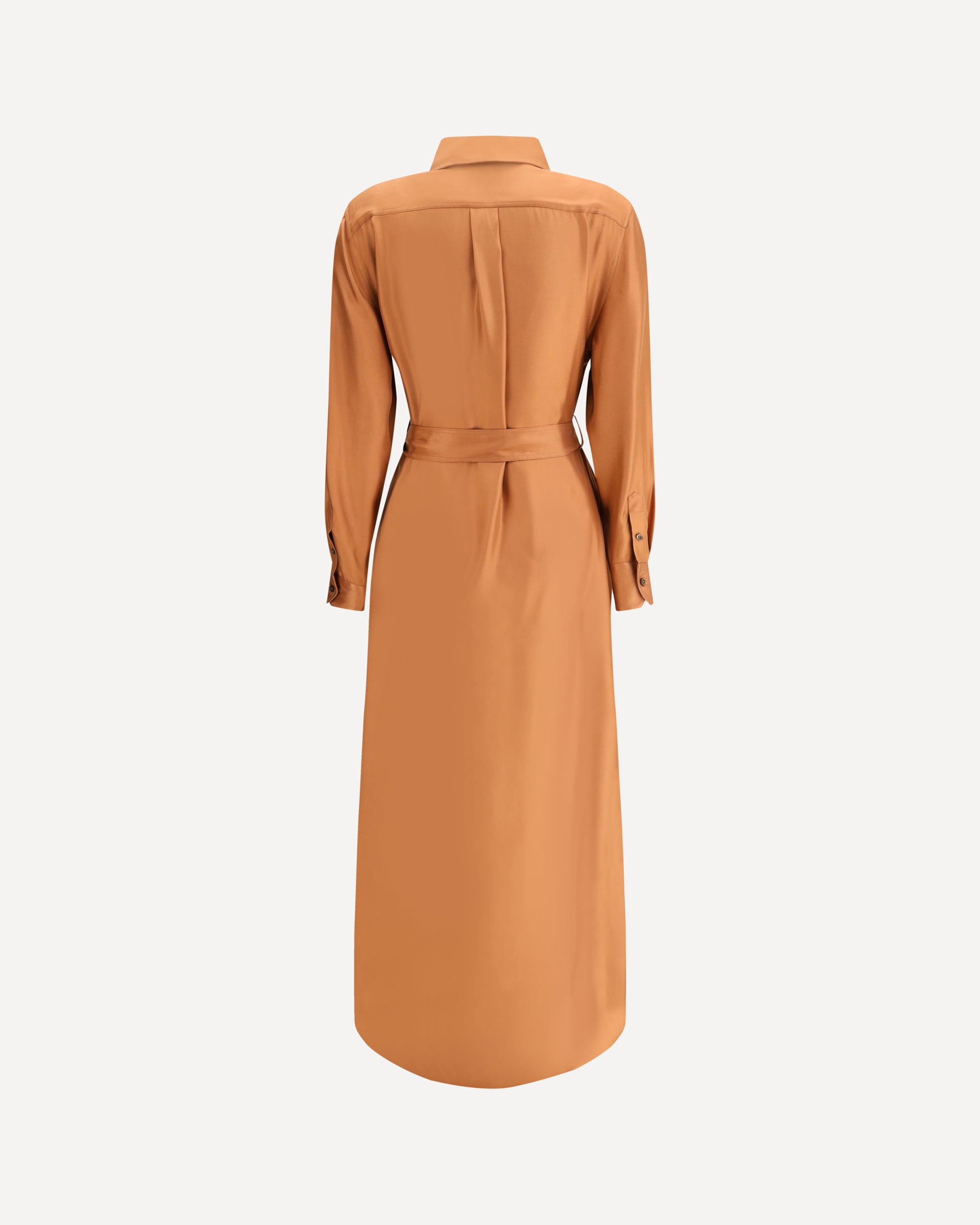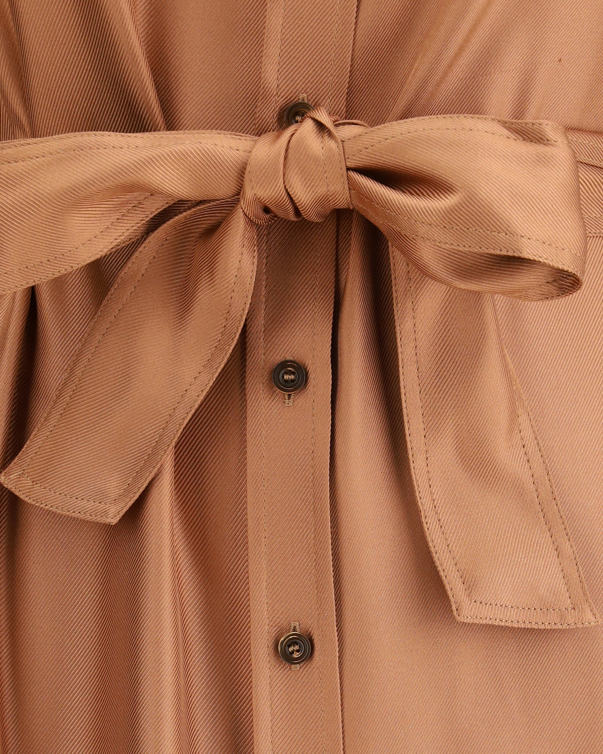 Tom Ford's silk Dress is an elegant chemisier style with a classic collar and deep slits on the side panels, adding a bold and sophisticated touch. Adjustable buttoned cuffs offer a customizable fit, while the matching, knotted sash at the waist emphasizes the silhouette with a classy detail. A dress that combines sophistication and modernity, perfect for special occasions.