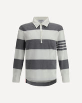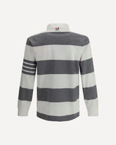 Thom Browne's cotton Polo Shirt long-sleeved design features a classic button-down collar on the front. Ribbed cuffs and adjustable side slits with buttons, decorated with the iconic colored stripes, add a distinctive touch. The patch with the brand's iconic monogram applied on the front and the two-tone striped pattern complete the design, making this polo shirt an elegant garment with a recognizable style, perfect for a sophisticated and modern look.