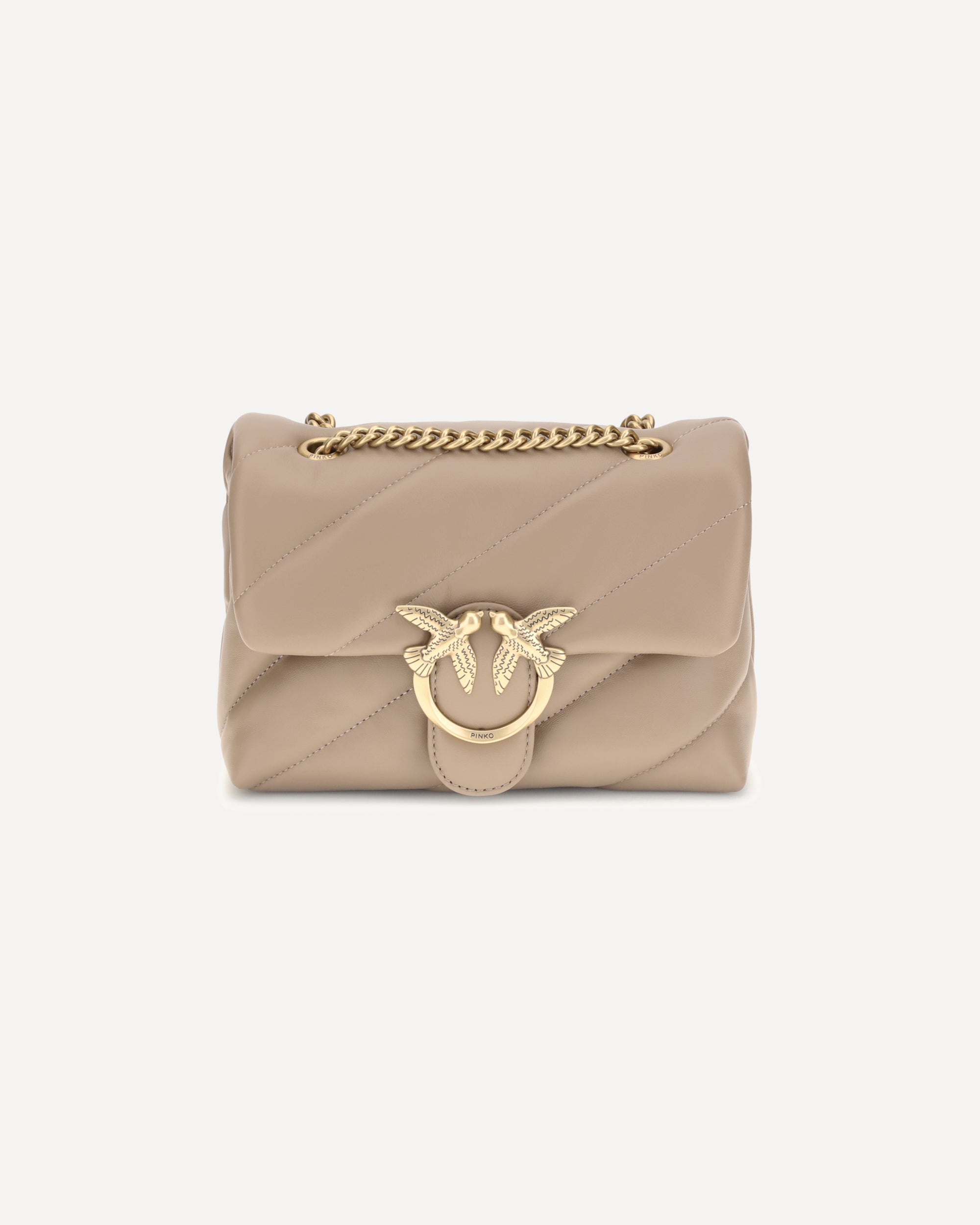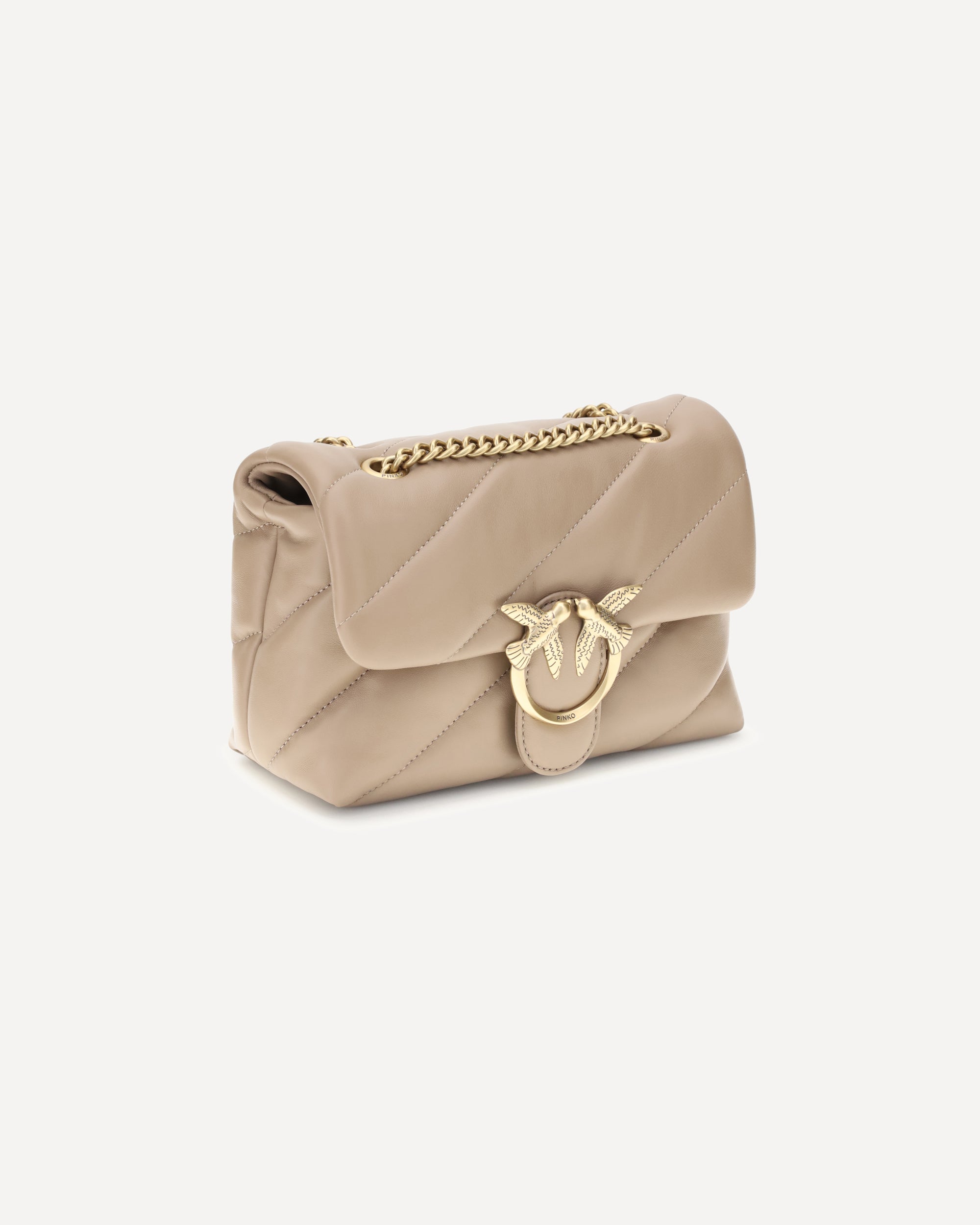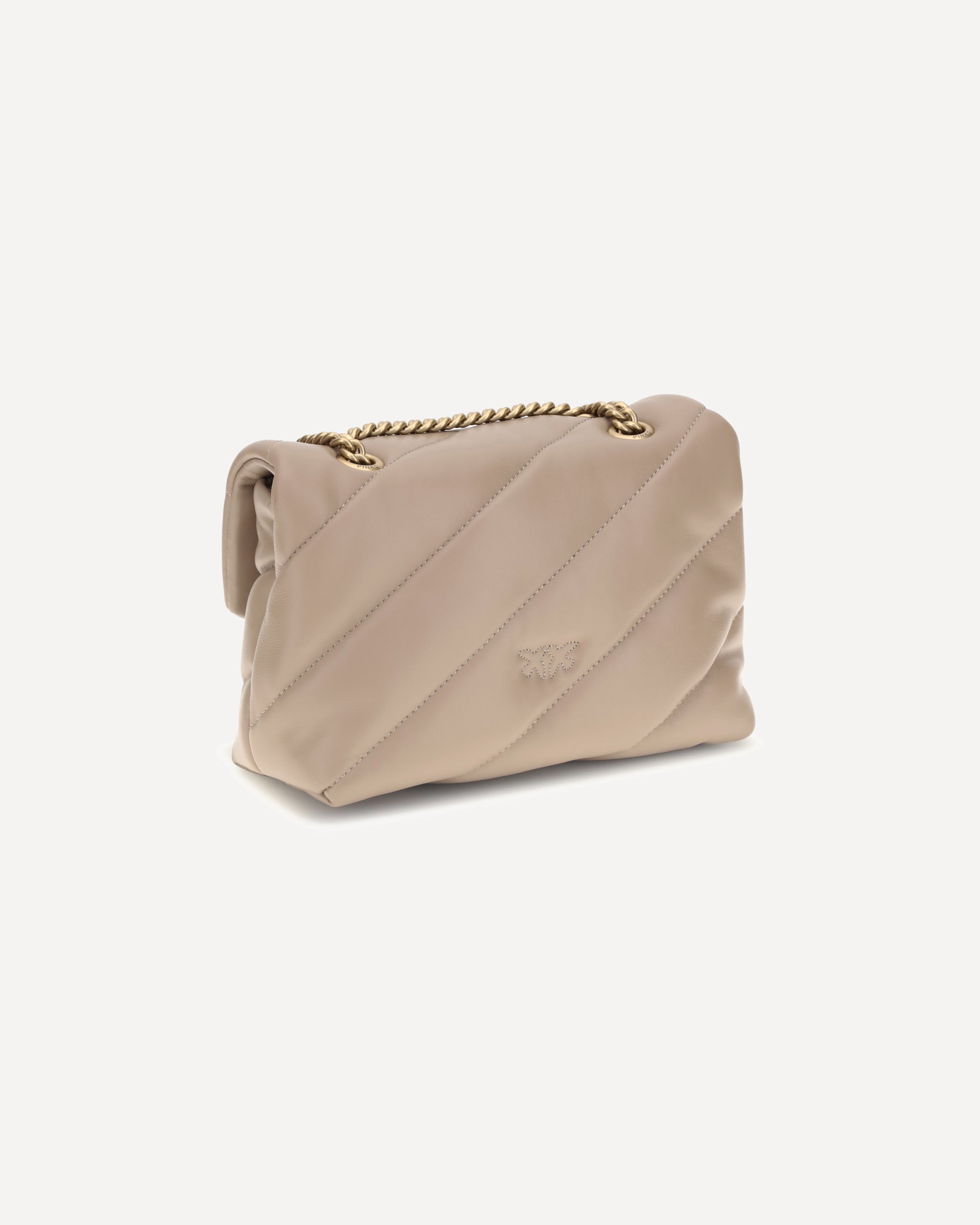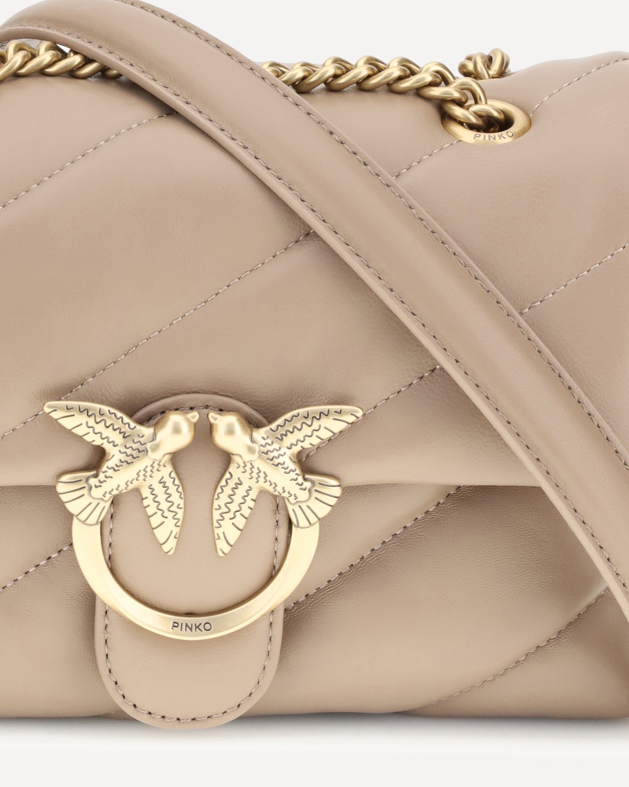 The Love Mini Puff leather Shoulder Bag by Pinko is a stylish and fashionable accessory. The front closure with magnetic button ensures practicality and security, while the iconic Love Birds logo, gold-plated and embossed on the front, adds a touch of luxury. The quilted and padded design gives the bag a rich and sophisticated texture. Inside, there is single interior compartment for excellent organization. The sliding chain strap offers versatility, allowing it to be worn on the shoulder or crossbody. On the back, the brand's iconic tone-on-tone embroidered monogram adds a discreet and refined detail.