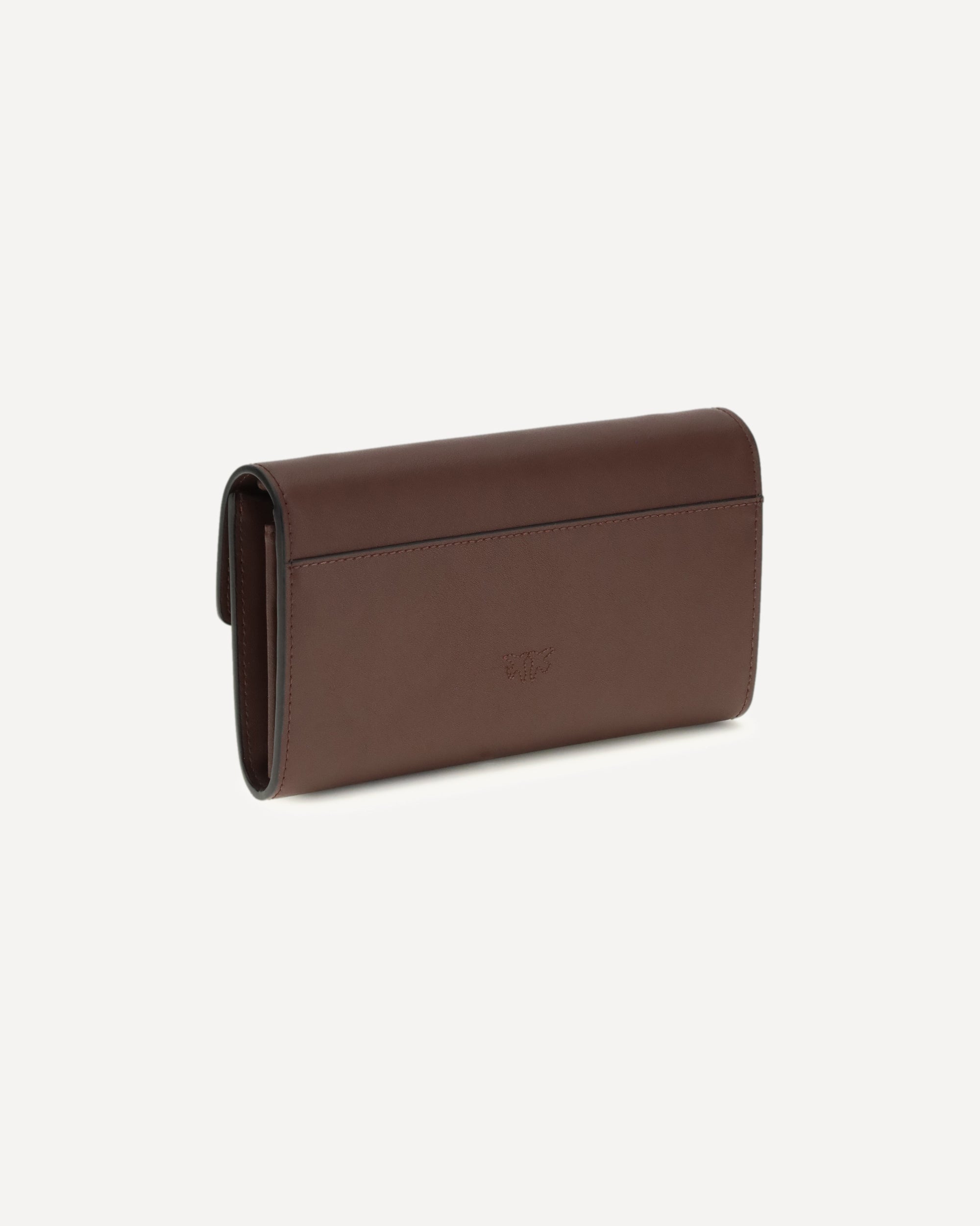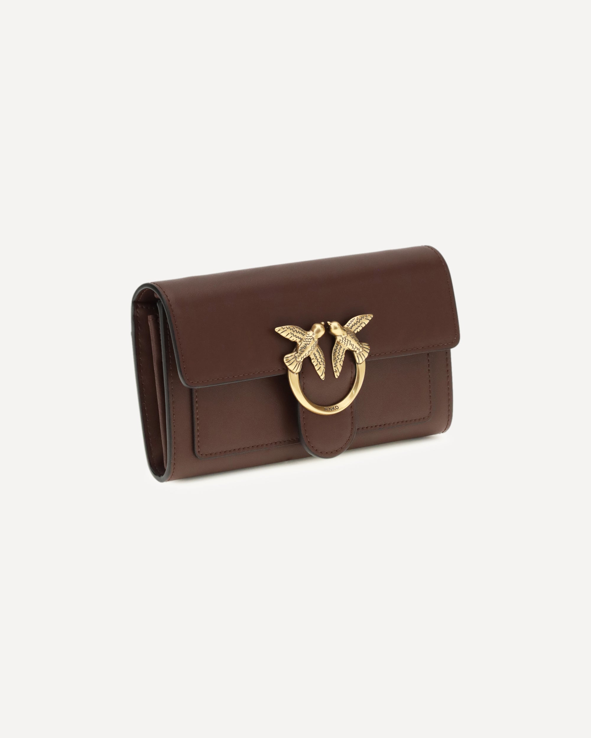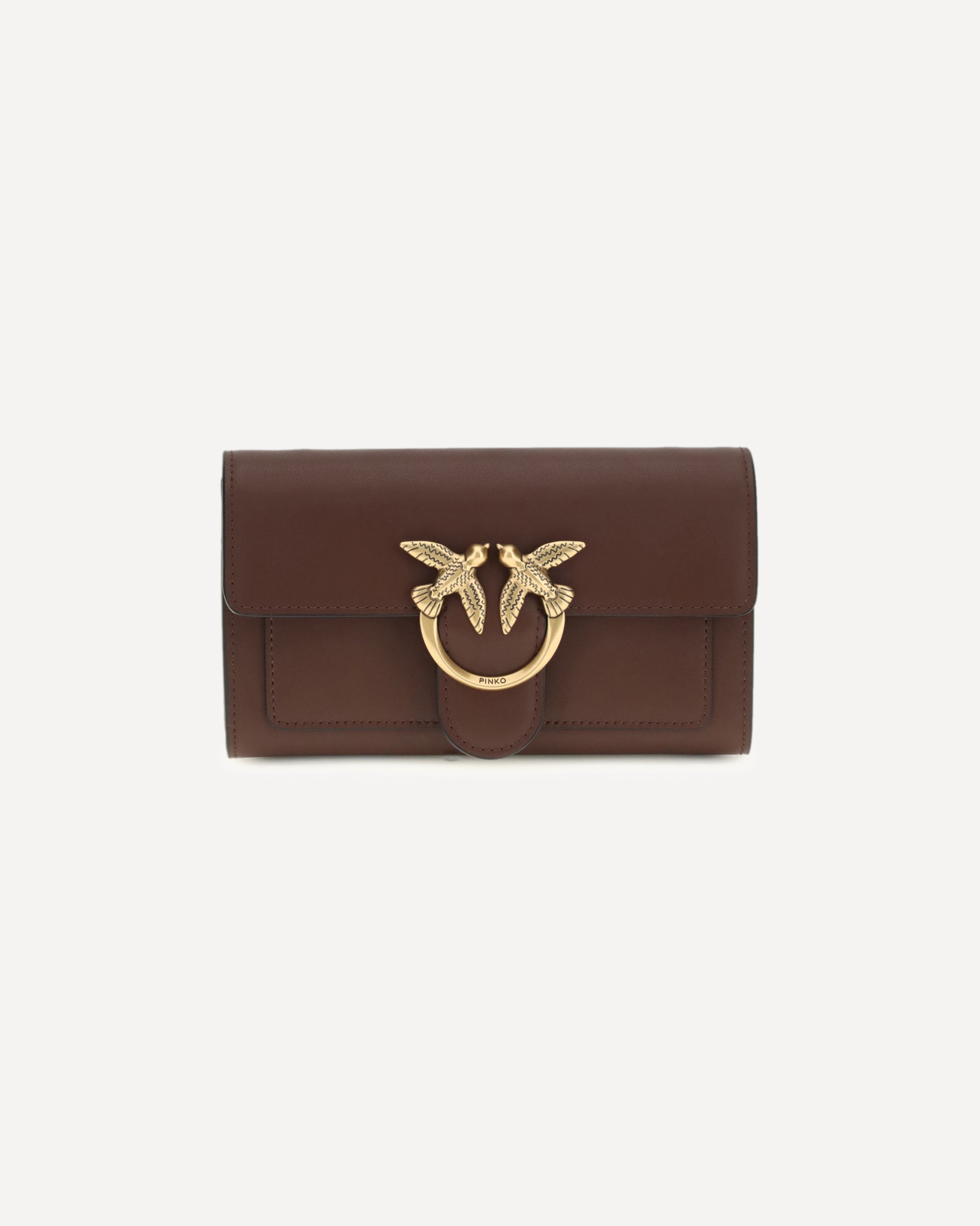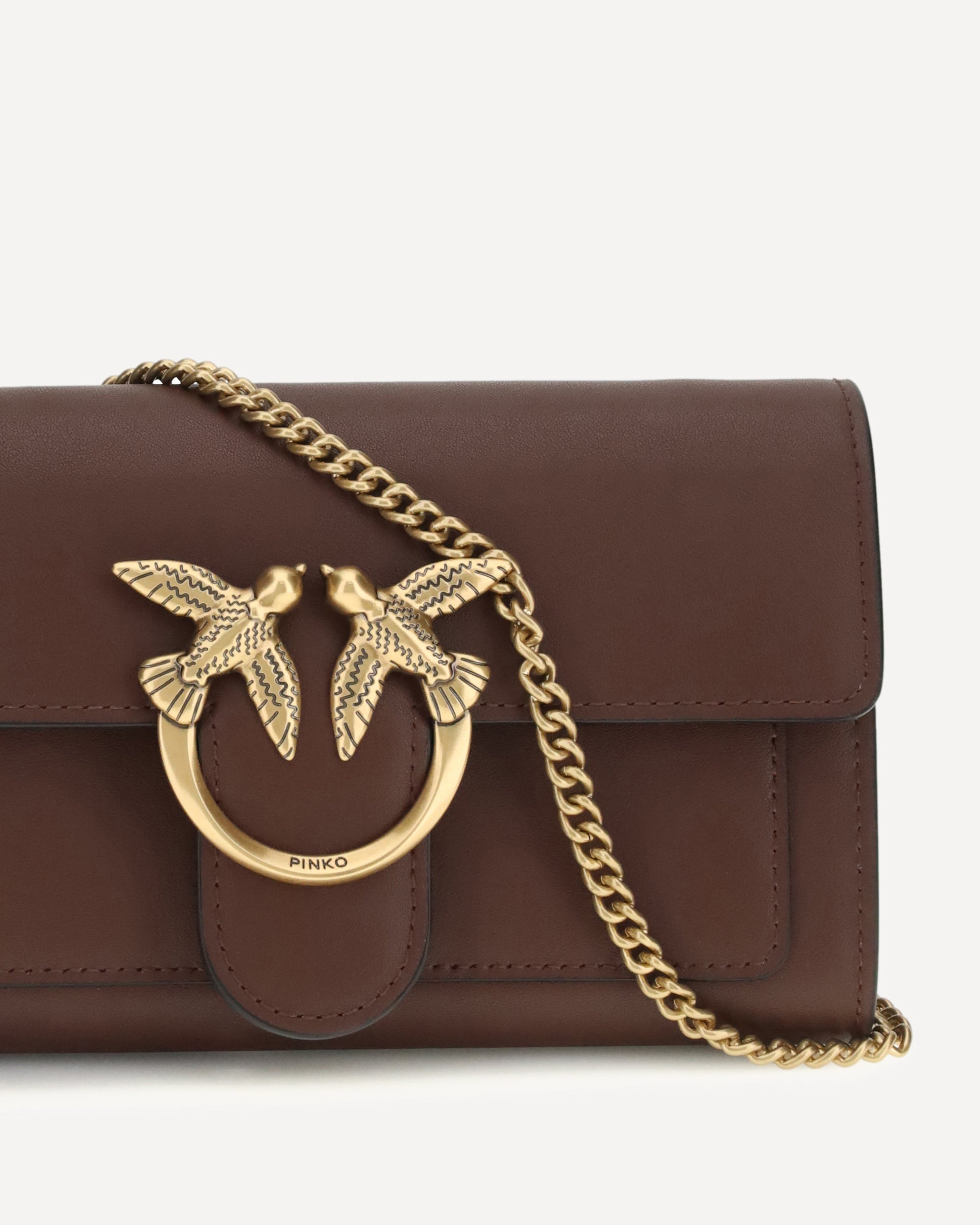 Calfskin One Love Wallet by Pinko, front magnetic button closure, adjustable and sliding chain shoulder strap, iconic Love Birds buckle embossed on the front, internal card slots, banknote compartment, zippered coin compartment for closure, internal zippered pocket, flat card pocket, iconic brand monogram embroidered tone on tone on the back.