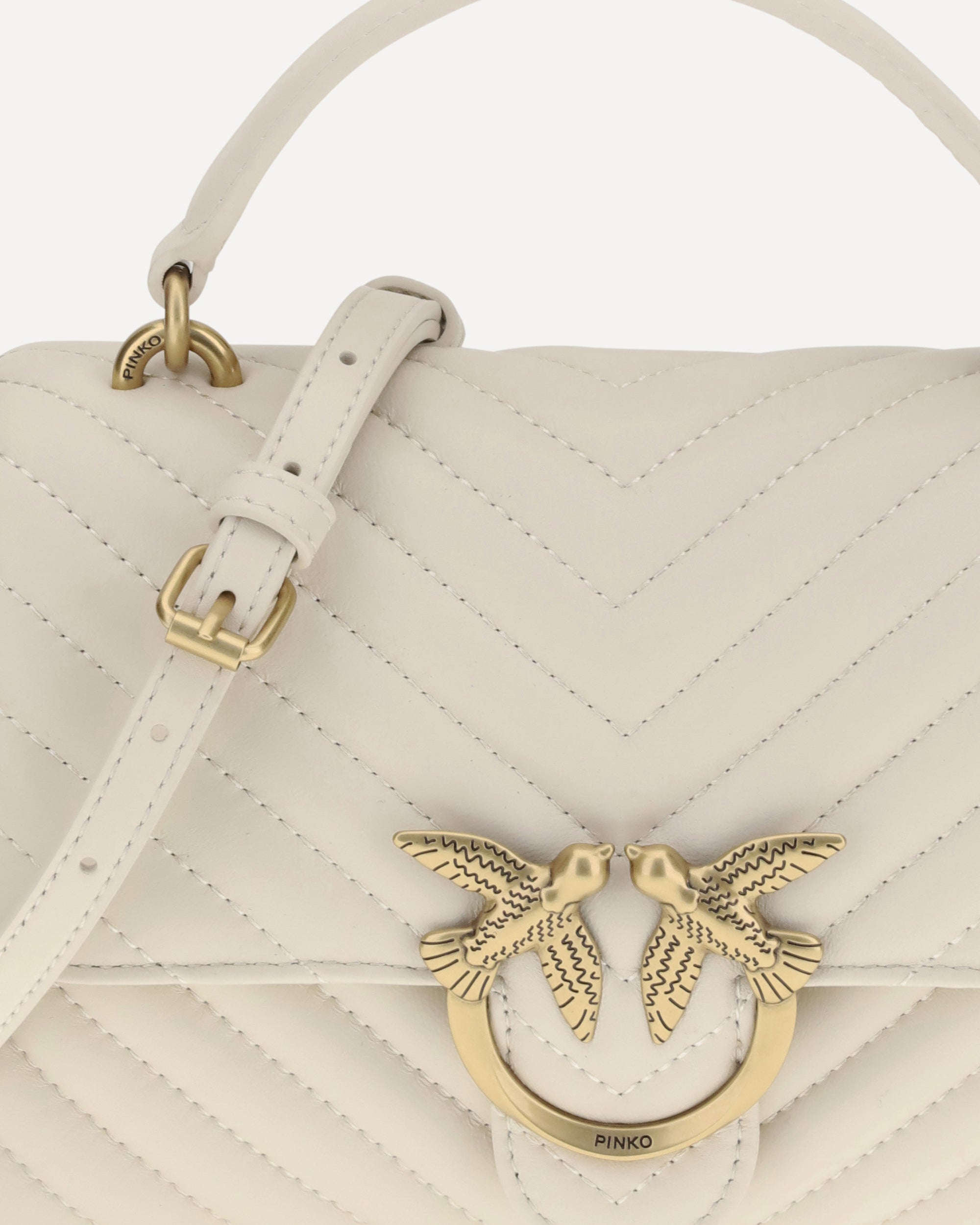 The Calfskin Love Lady Mini Handbag by Pinko, front magnetic flap closure, iconic gold-plated Love Birds logo embossed on the front, quilted and padded design, double interior compartment, removable chain shoulder strap with smooth leather insert, flat rigid top handle, interior flat pocket with zipper, iconic tone-on-tone embroidered brand monogram on the back.