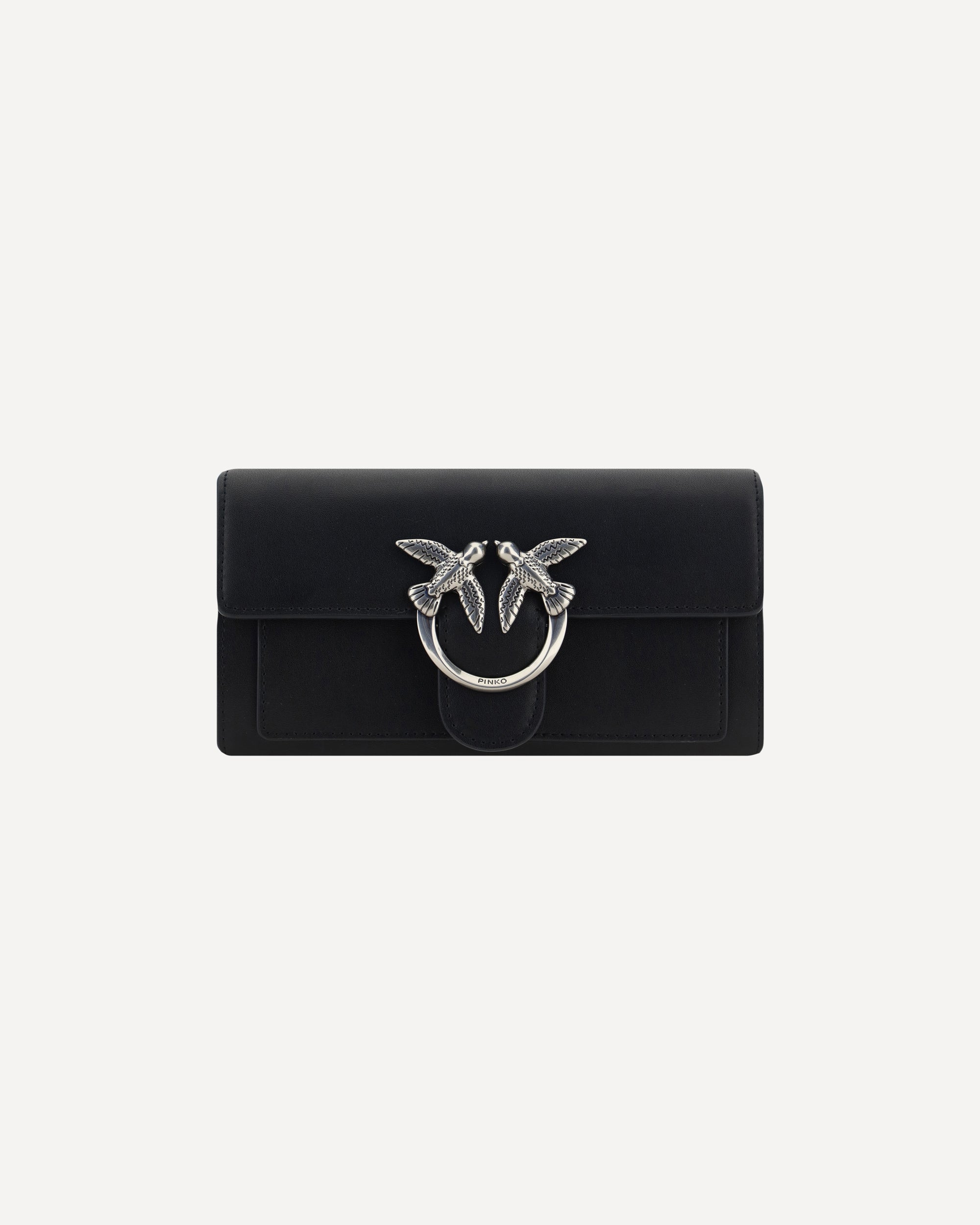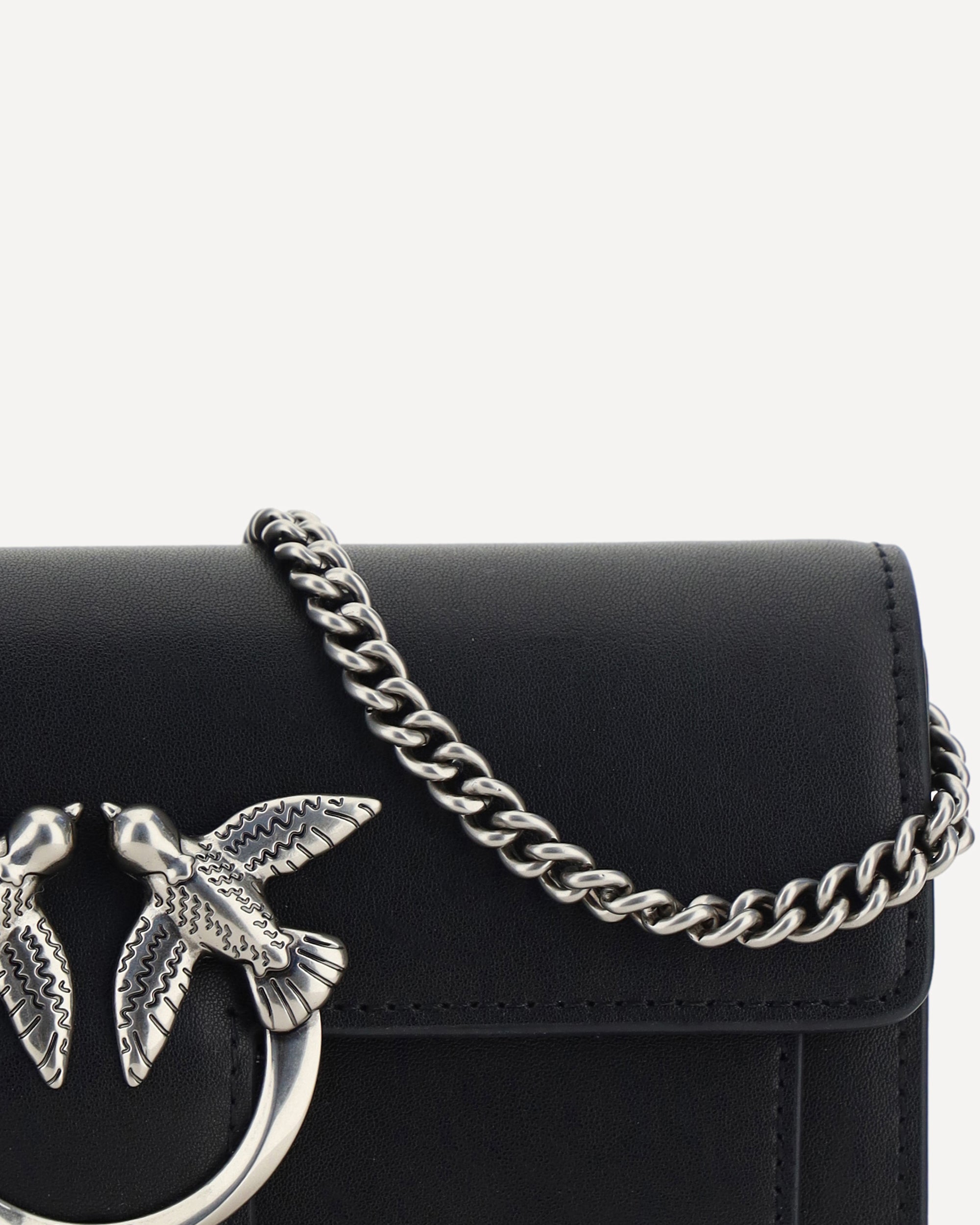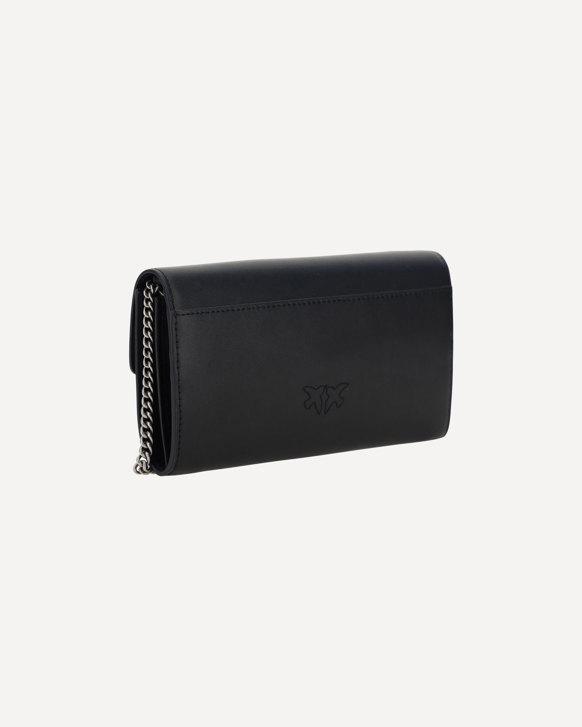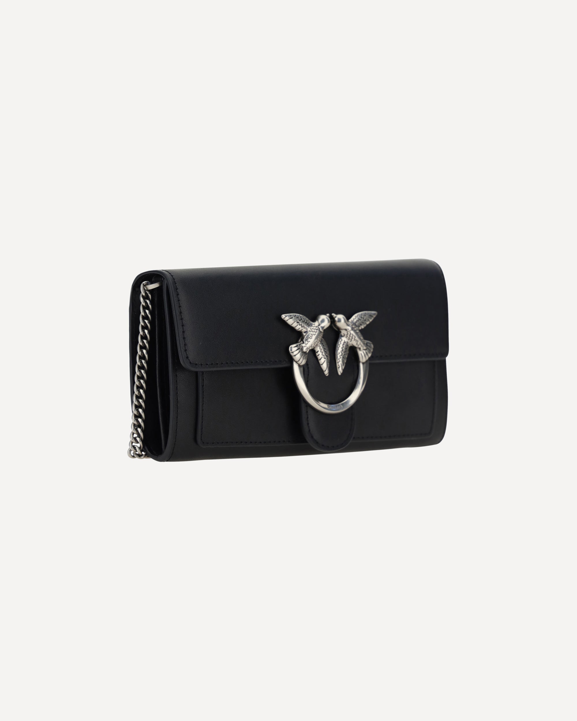 Calfskin One Love Wallet by Pinko, front magnetic button closure, adjustable and sliding chain shoulder strap, iconic Love Birds buckle embossed on the front, internal card slots, banknote compartment, zippered coin compartment for closure, internal zippered pocket, flat card pocket, iconic brand monogram embroidered tone on tone on the back.