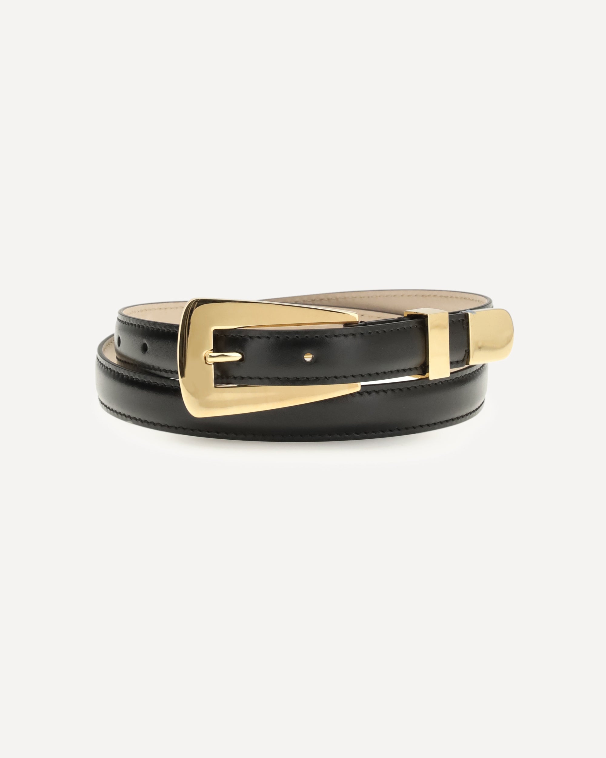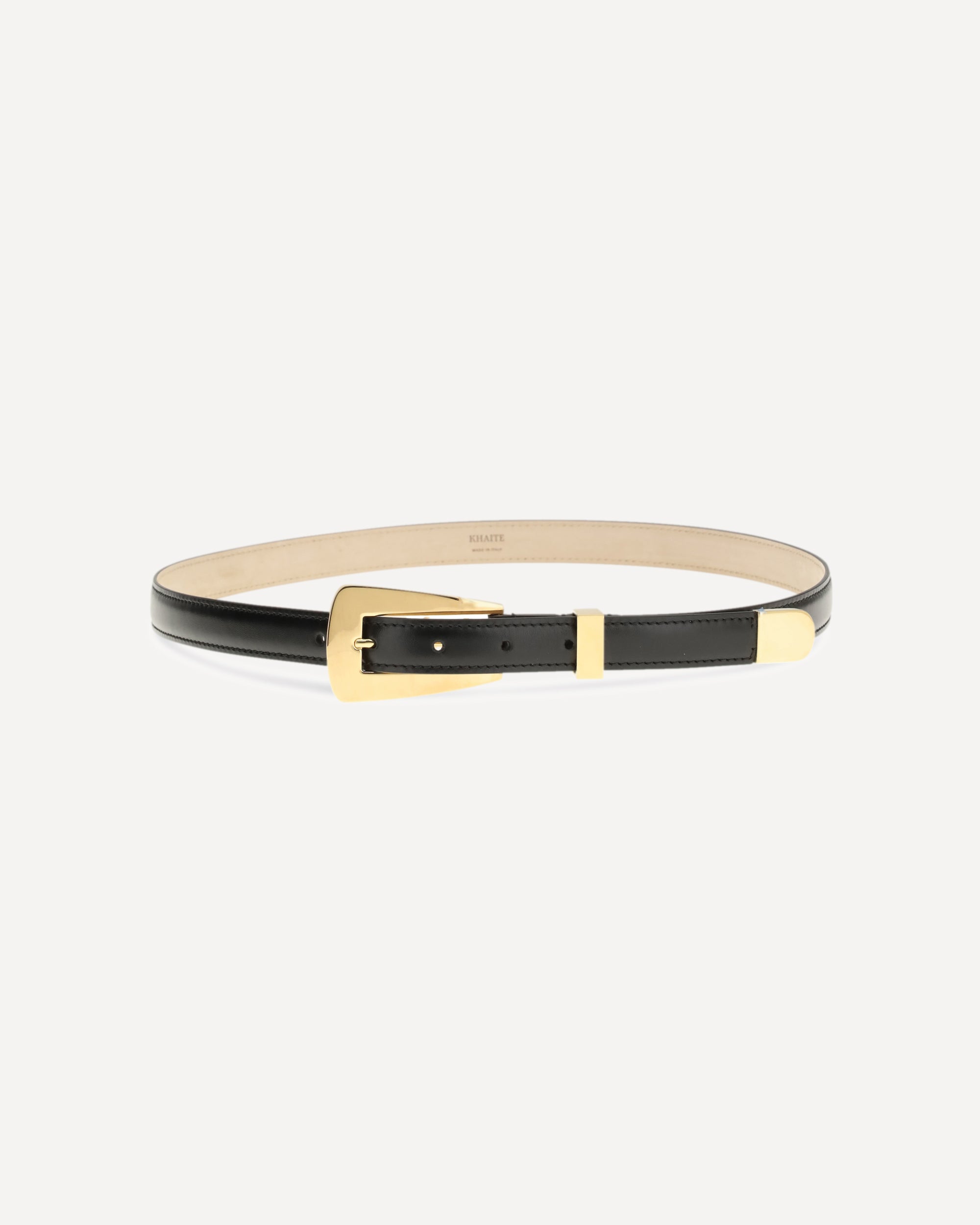 The Lucca leather Belt by Khaite is an elegant accessory in soft calfskin leather, defined by an elongated trapezoidal buckle and compact dimensions that enhance its versatility. Polished metal hardware, made in Italy from 18-karat gold-plated brass, adds a precious and refined touch.