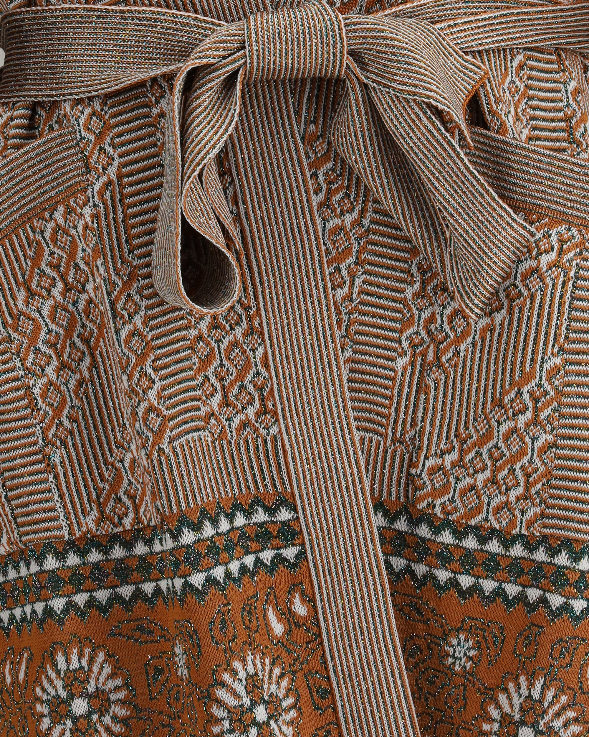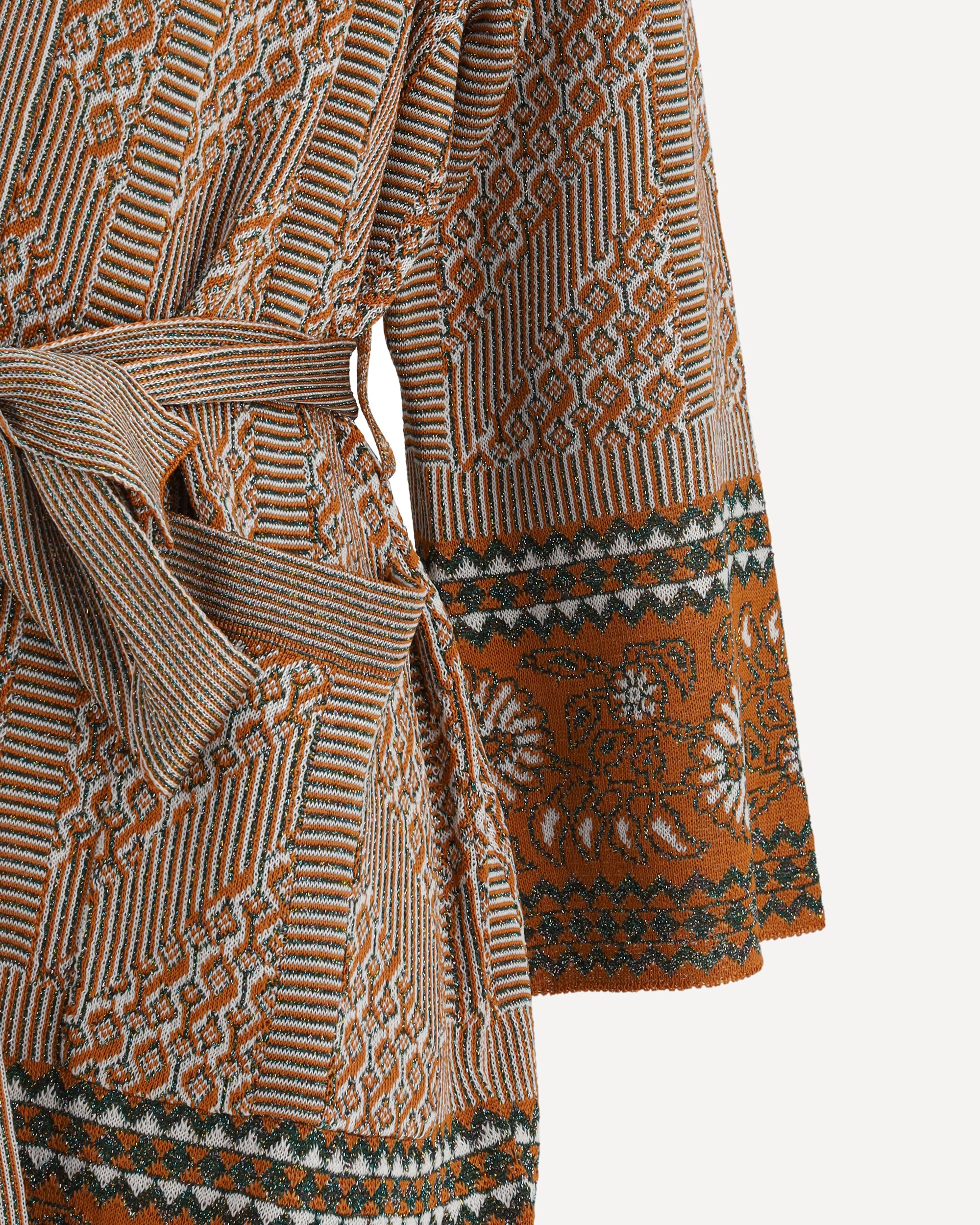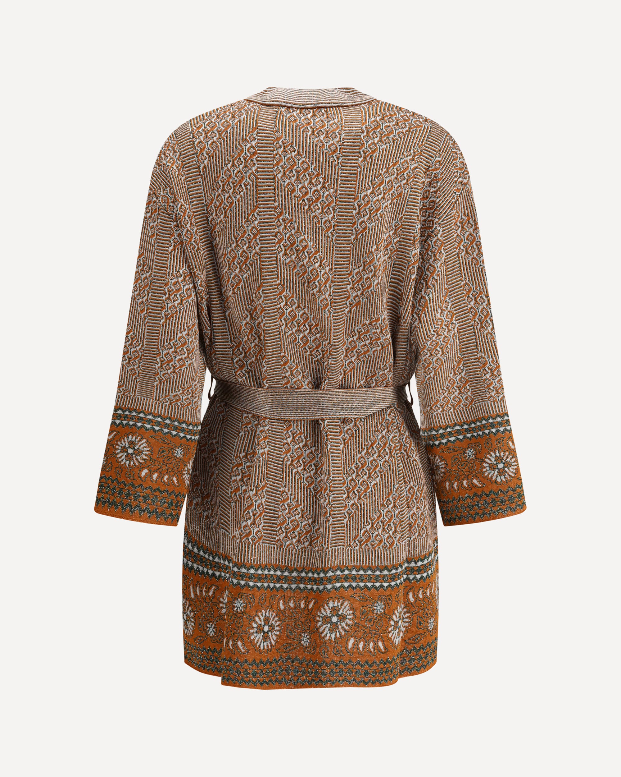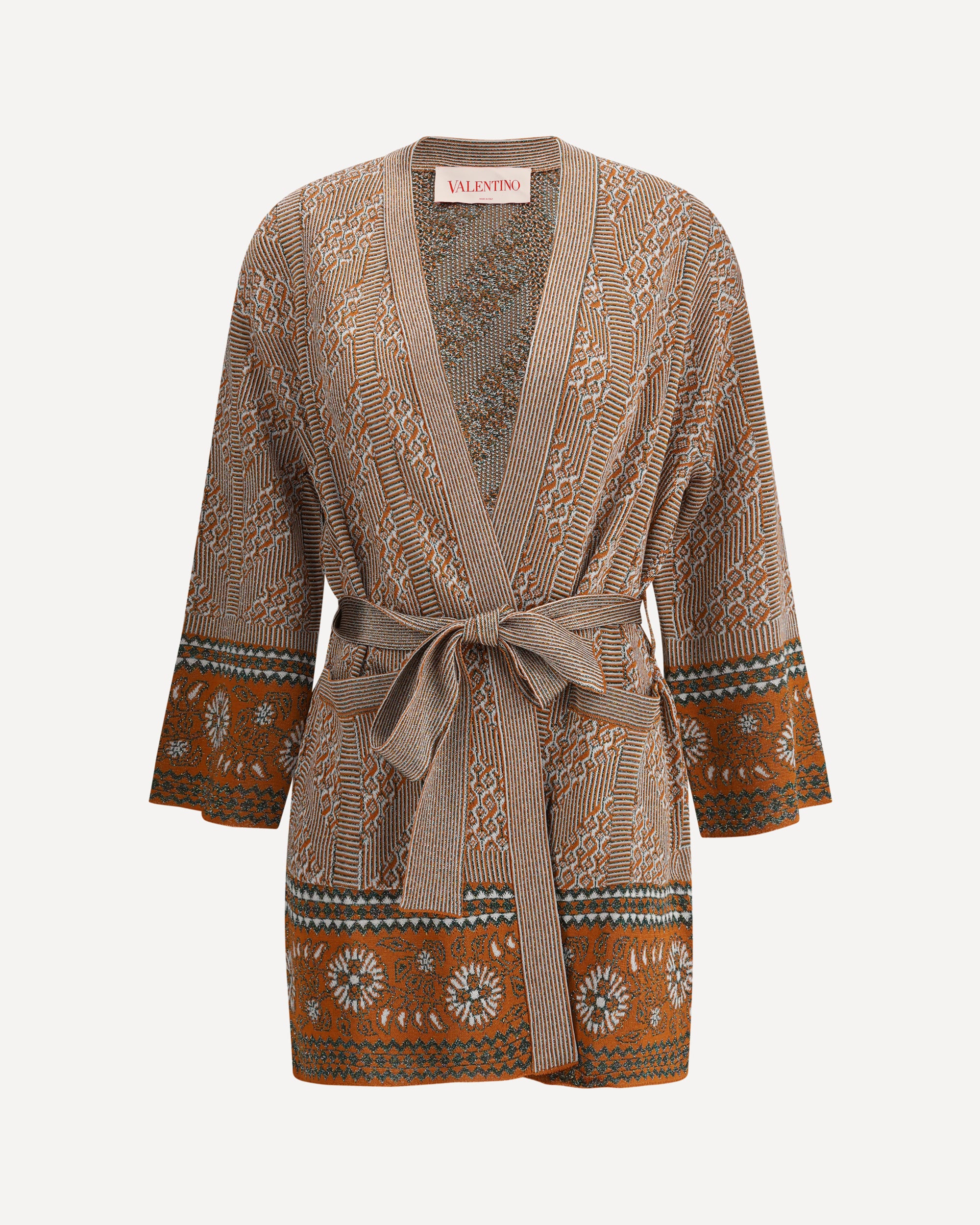 Valentino's Lurex Cardigan is a sleek, modern piece featuring a geometric lurex jacquard print that embellishes the entire surface. The tonal belt with self-adjusting knot at the waist adds a touch of sophistication, allowing you to define the silhouette. Long sleeves and a straight hem complete the design, making this cardigan perfect for a sophisticated, contemporary look.