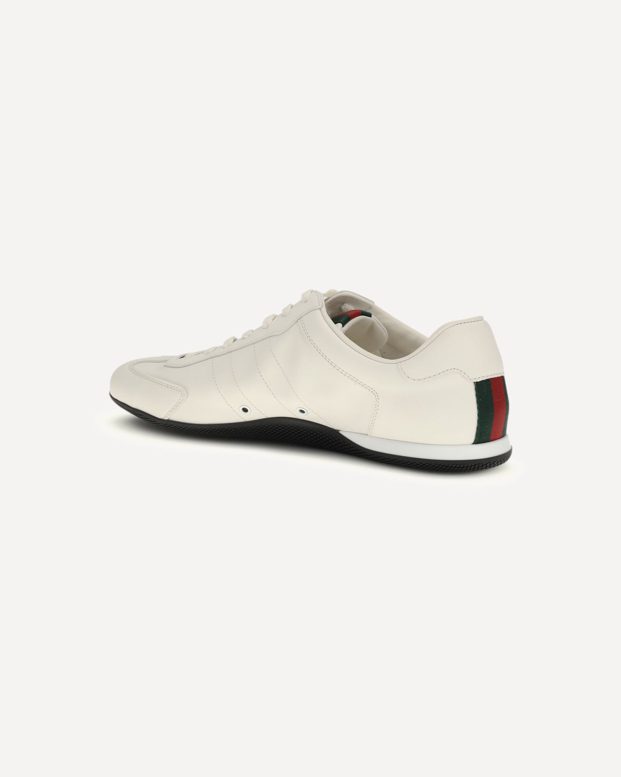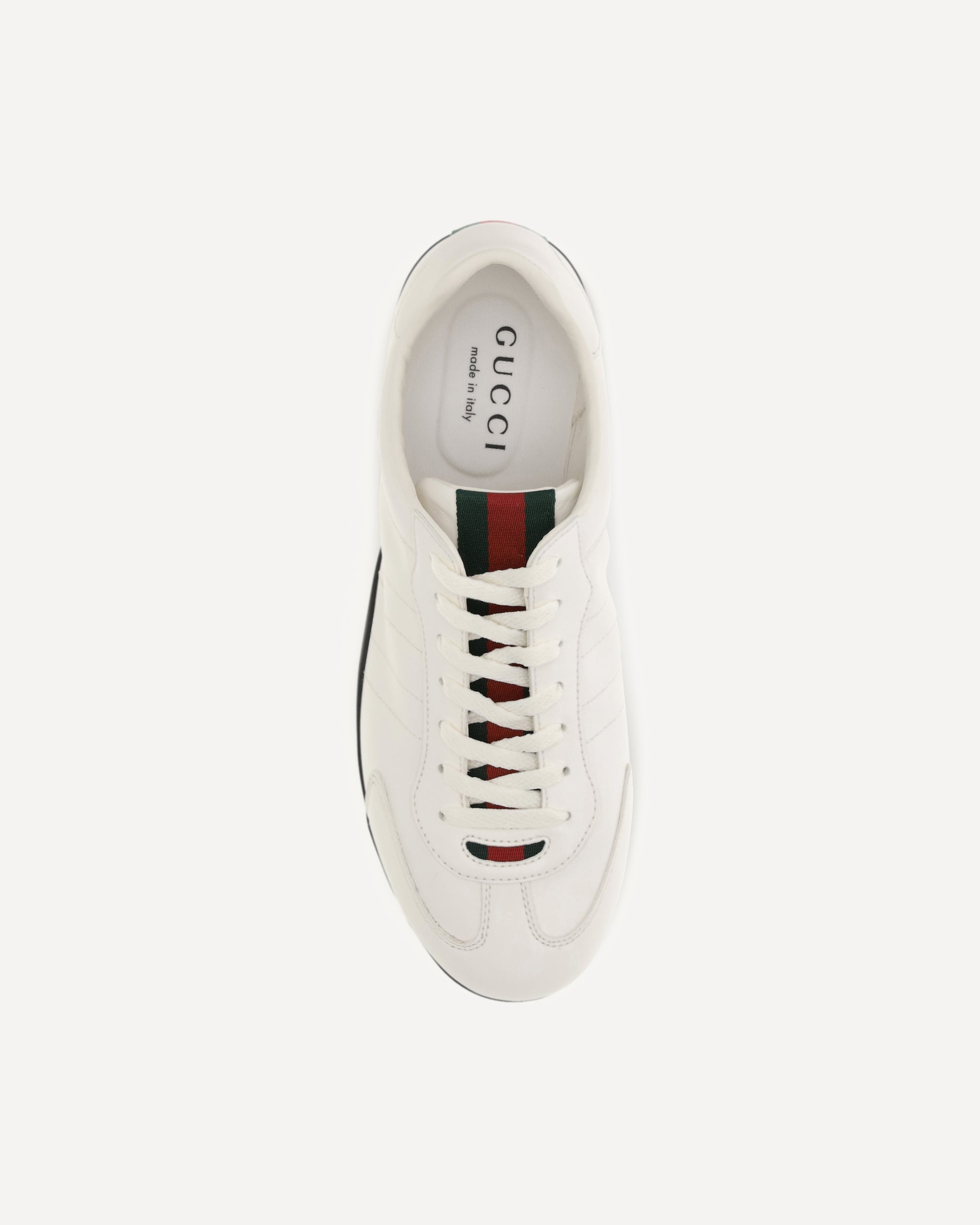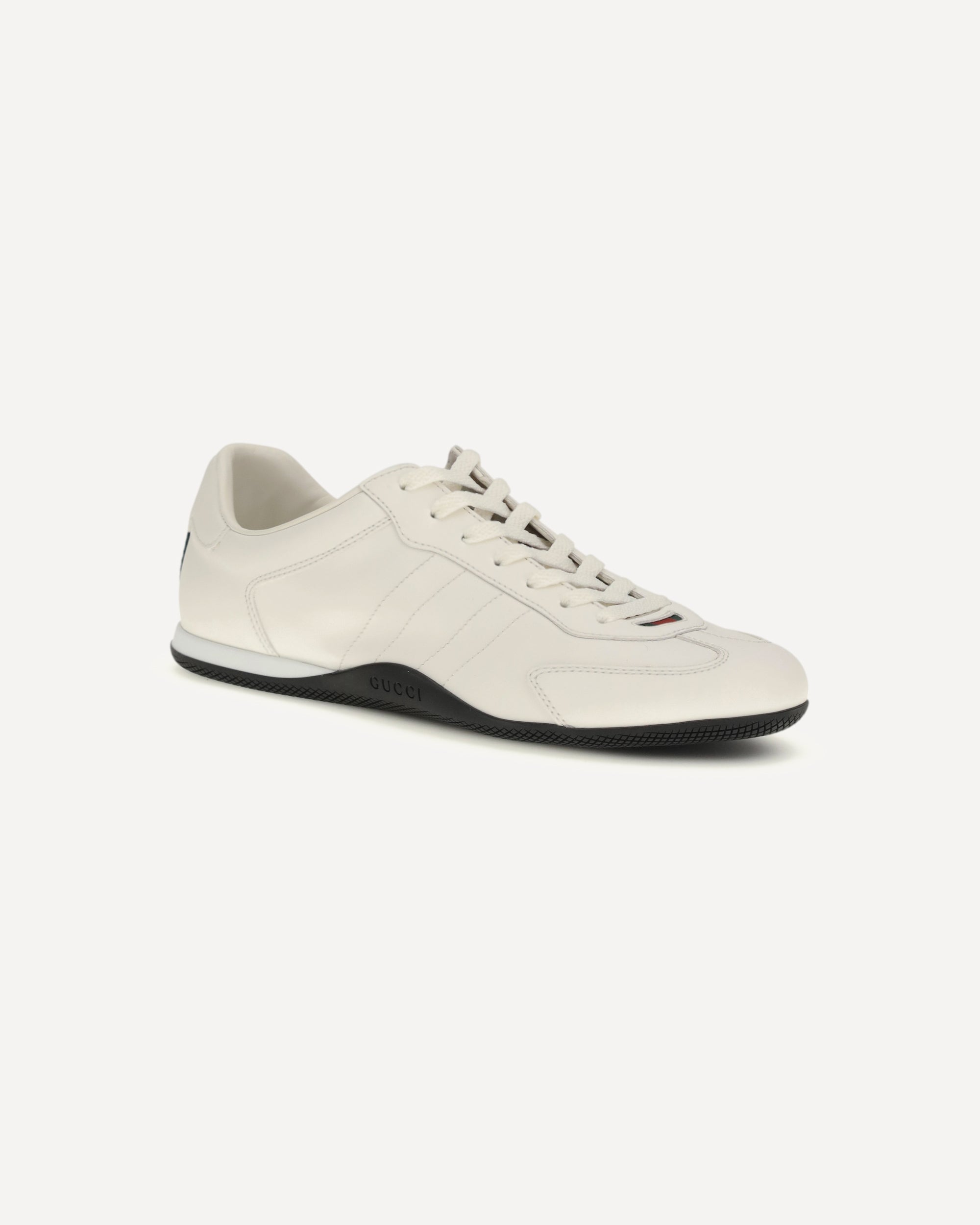 The Shift Sneakers by Gucci feature a low-top design with a lace-up closure, enhanced by a red and green Web tab and back detail. The two-tone rubber sole features the Gucci logo, combining iconic style and functional design.