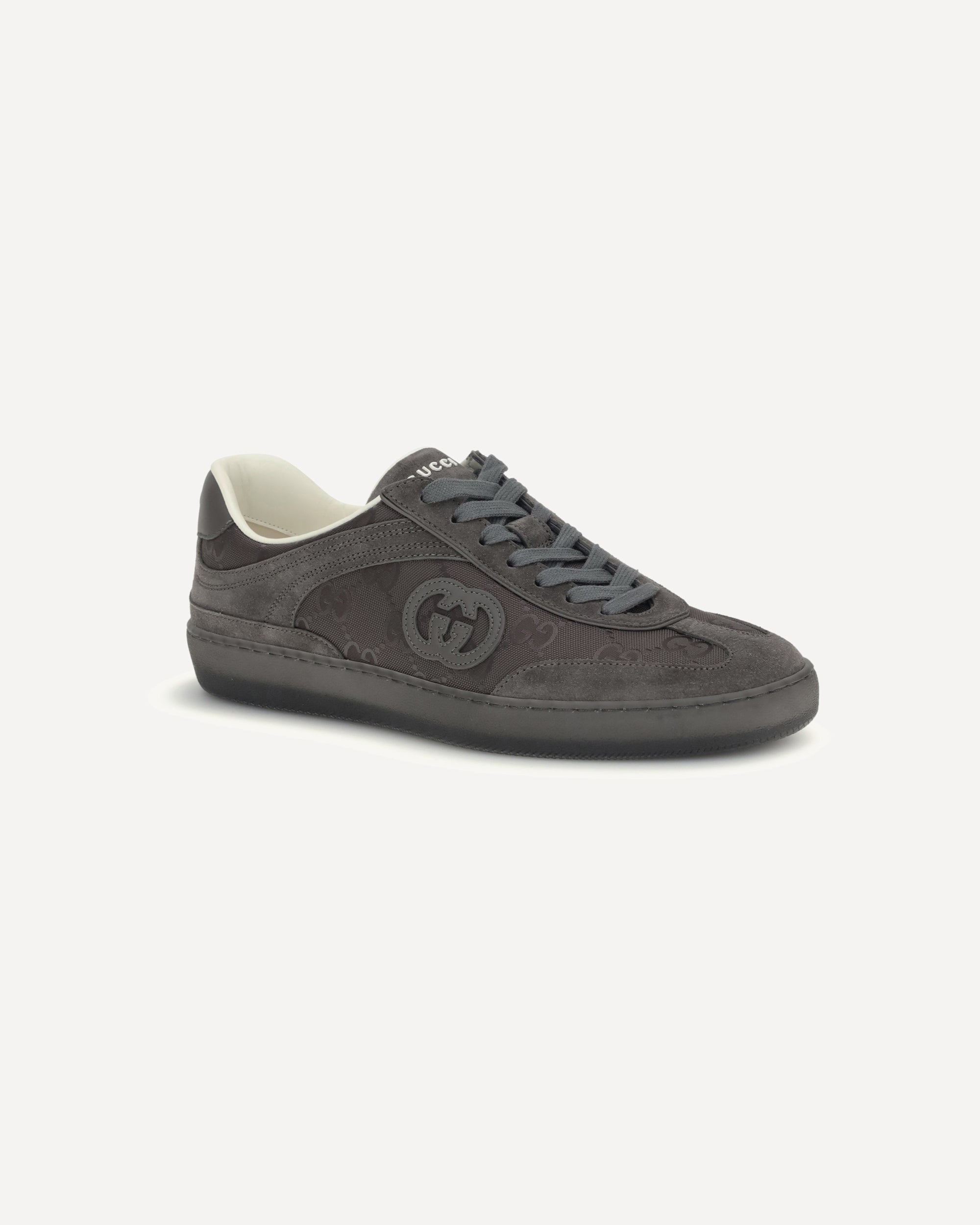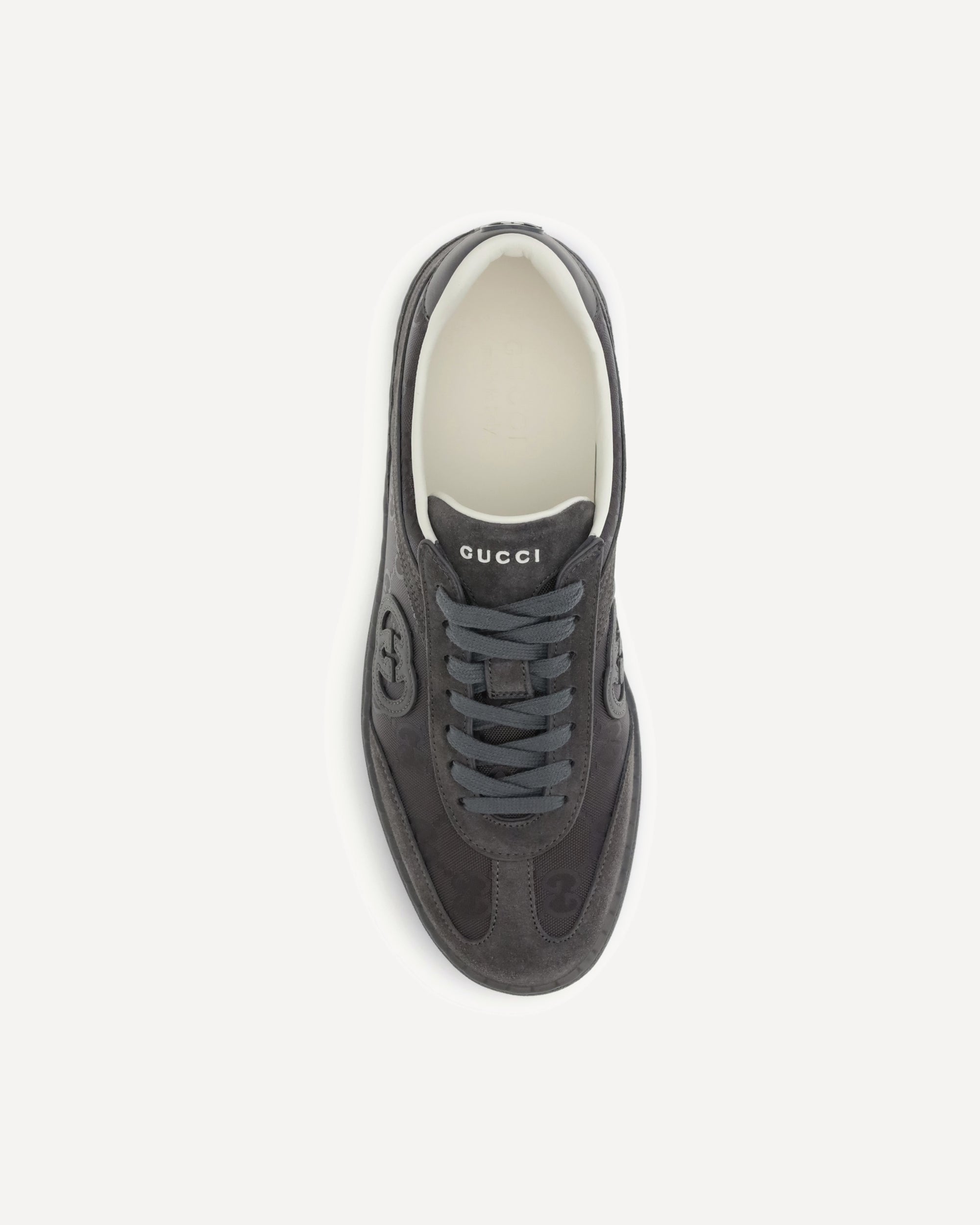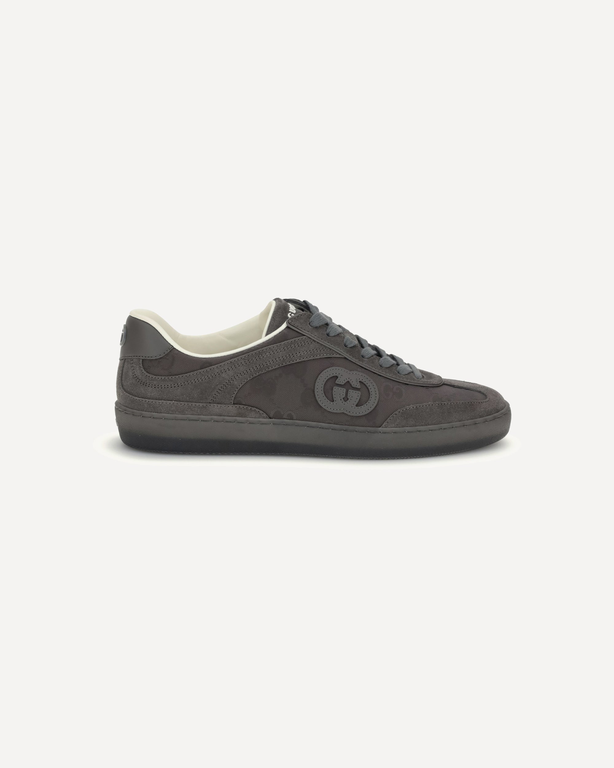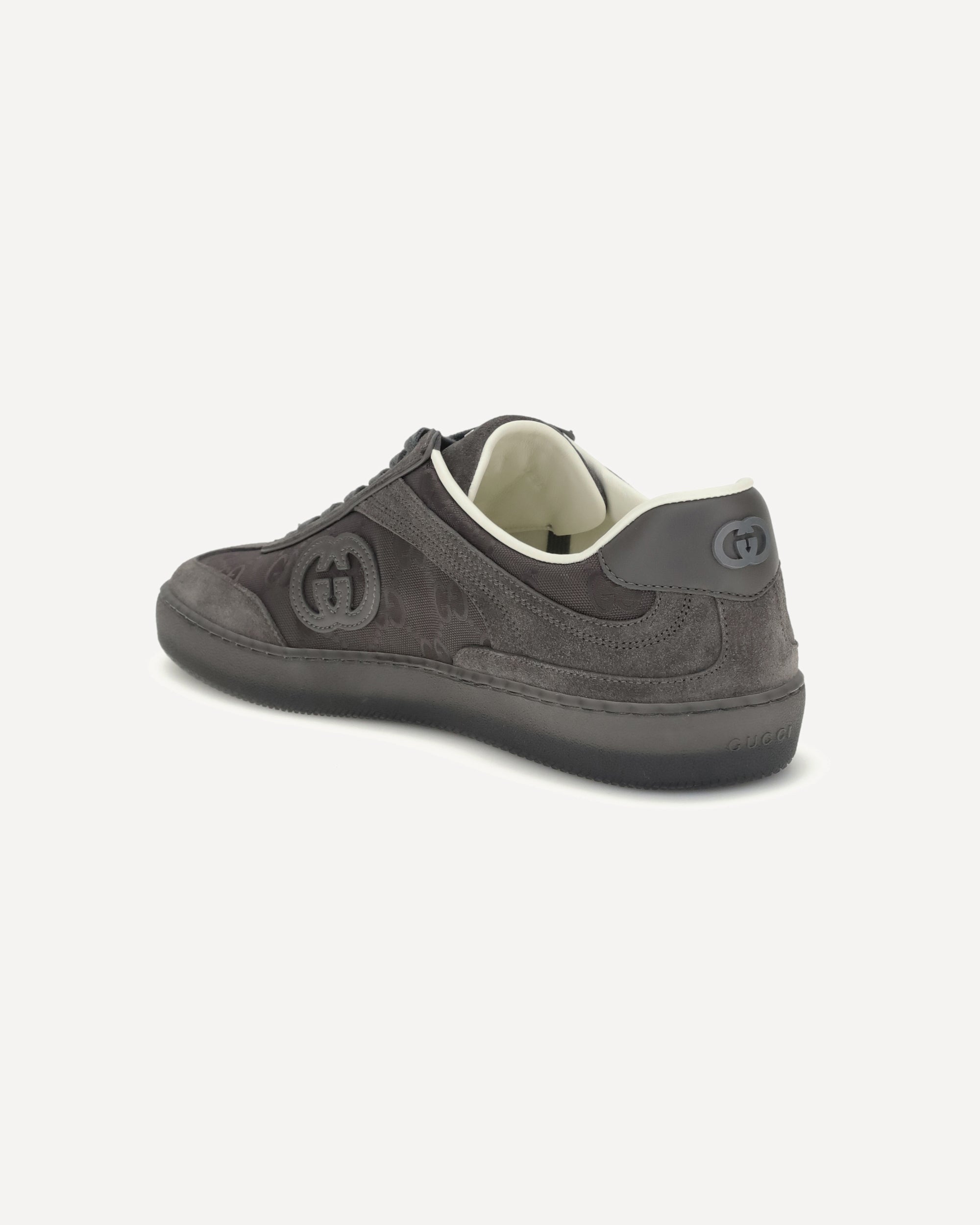 Gucci's G75 Sneakers reinterpret the retro sports aesthetic with premium materials and iconic details. Made of gray suede with GG nylon inserts, they feature a low-slung silhouette and a classic lace-up closure. The leather lining ensures comfort, while the GG crossover logo adds a distinctive touch. An additional pair of laces completes the style, for a customizable style that's always polished.