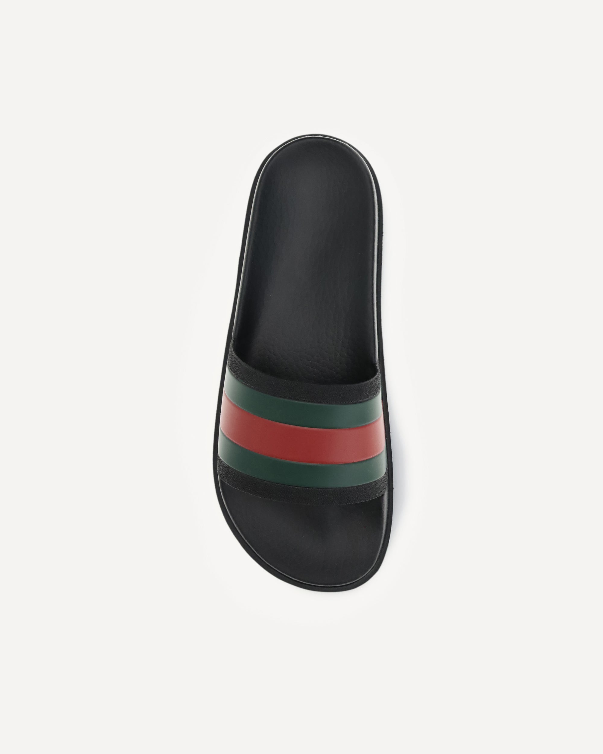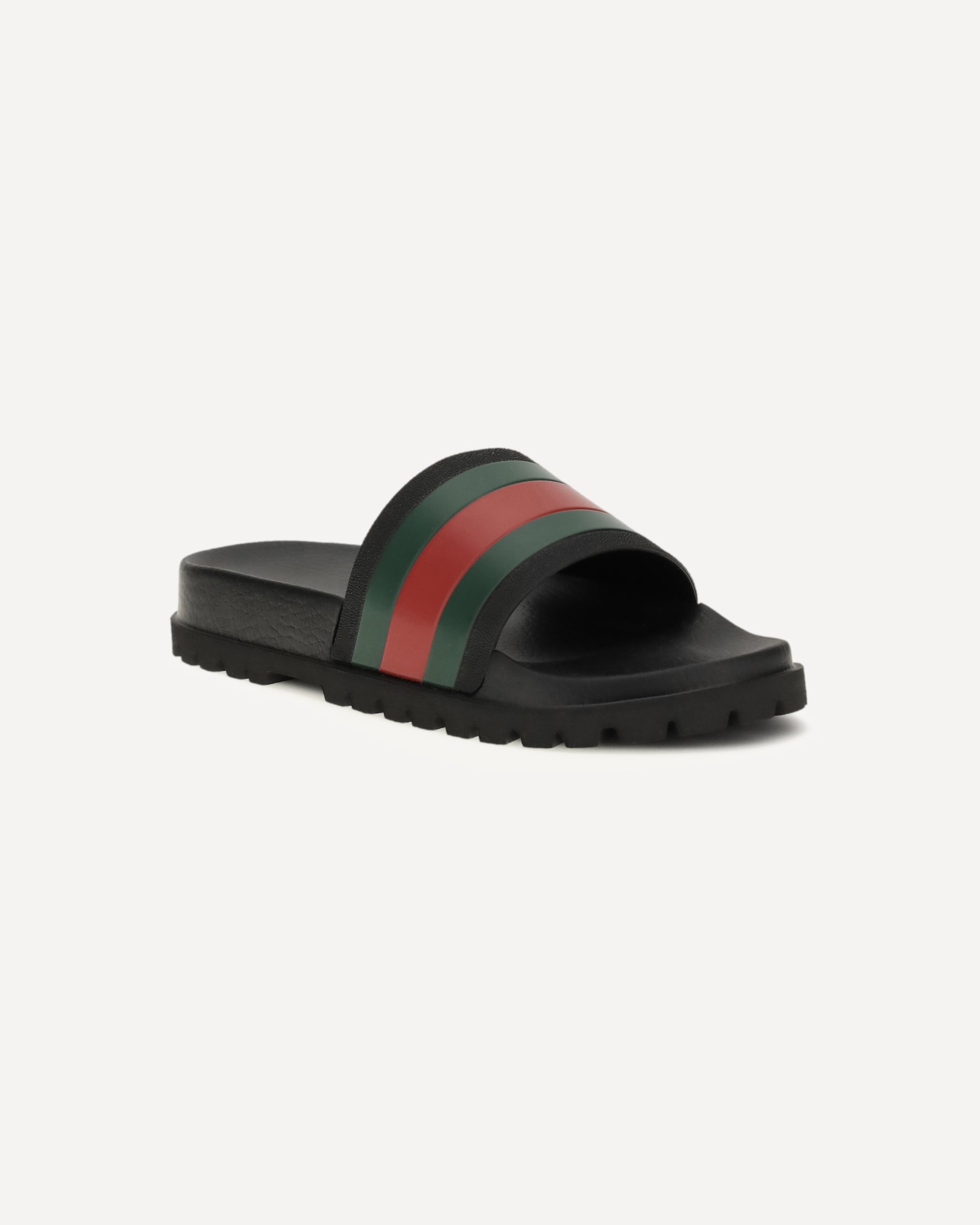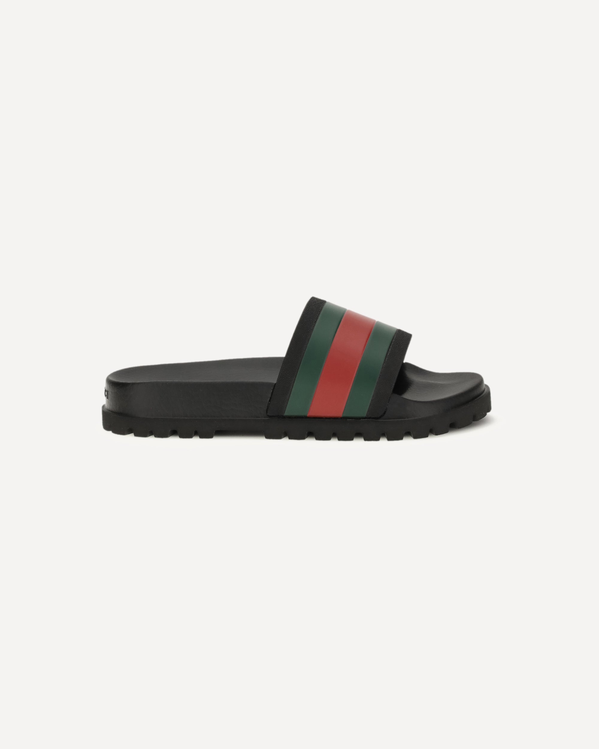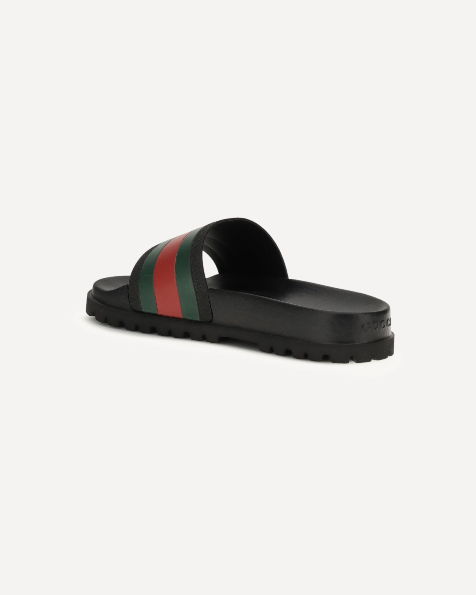 The rubber Slippers by Gucci are part of the Gucci Lido line and reinterpret one of the Maison's most iconic symbols in a pop twist: the green and red Web ribbon. Made of black rubber and featuring a slip-on design, they combine comfort and style in a modern and distinctive version of the classic low sandal.