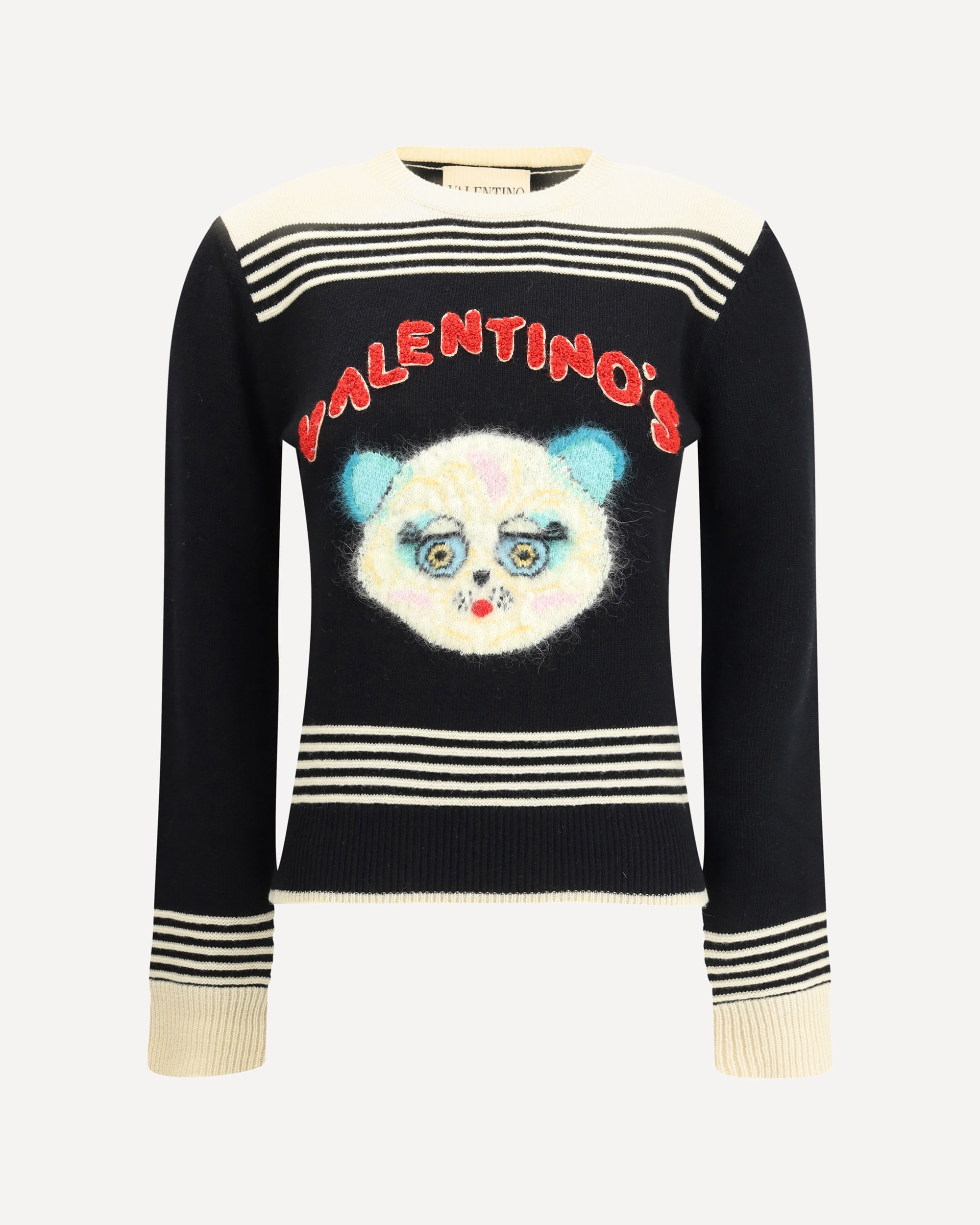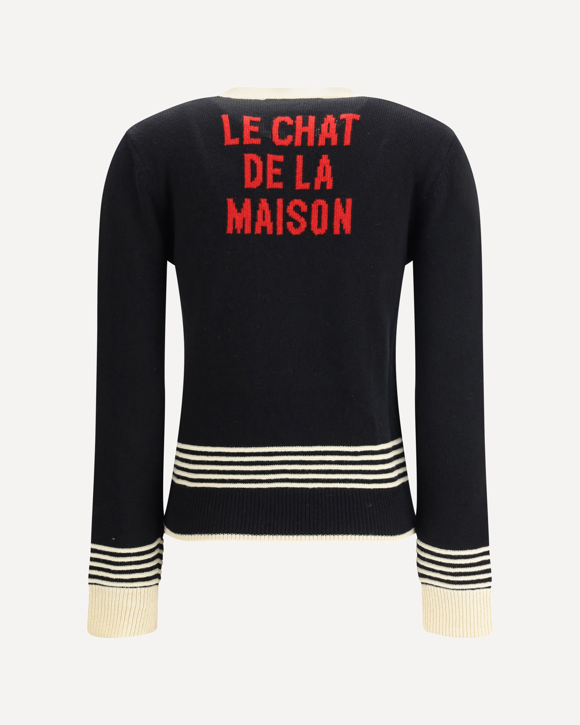 Valentino's Le Chat De La Maison Sweater is made of soft knit with a ribbed crew neck that emphasizes the line. It features frontal embroidery with the words "Le Chat de la Maison" that gives it a distinctive and refined touch. The cuffs and hem, also ribbed, ensure a snug and comfortable fit, perfect for a casual yet elegant look.