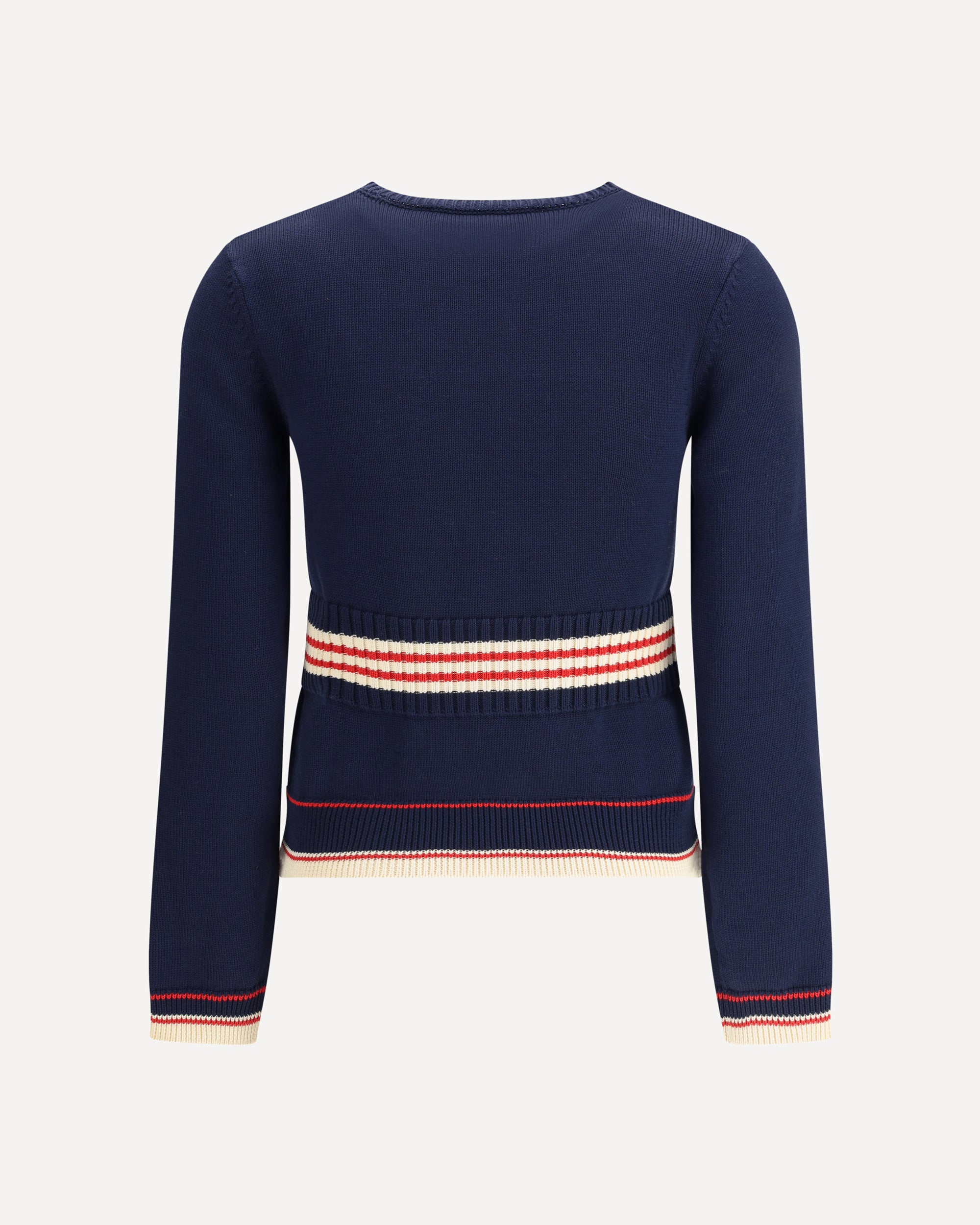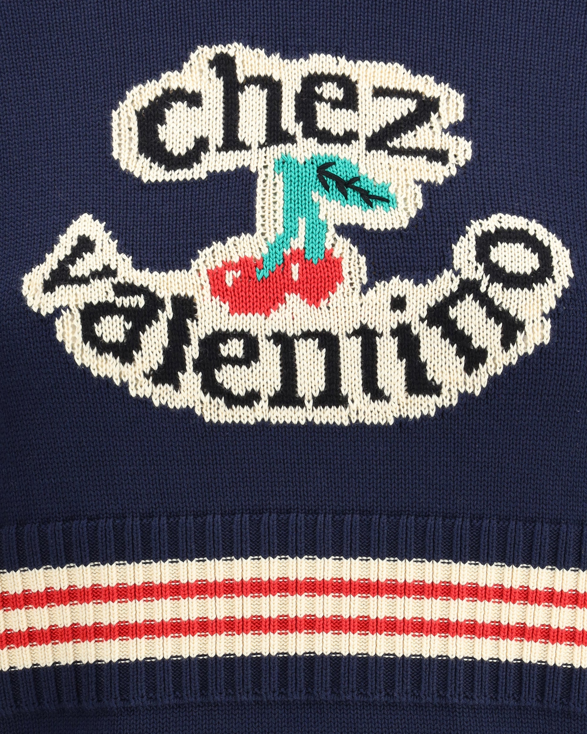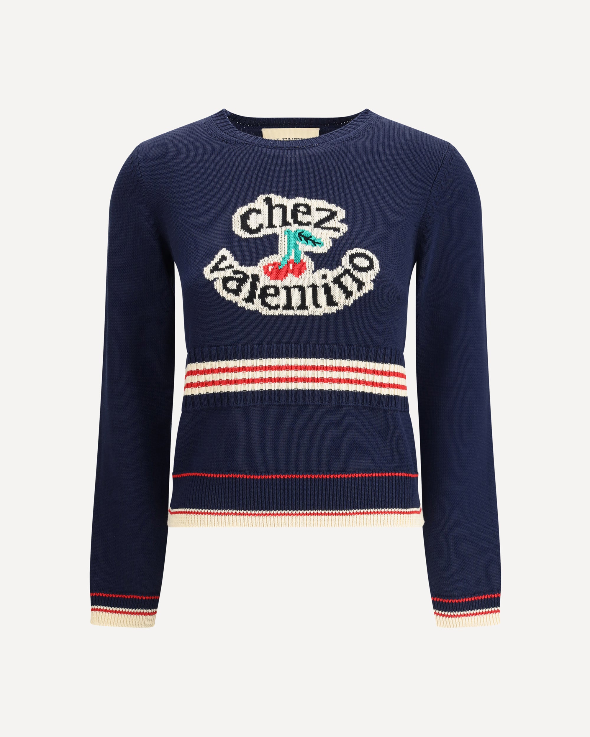 The Chez Valentino Sweater by Valentino, made of pure cotton, features Cherryfic embroidery on the chest that adds a playful and distinctive touch. The design features a ribbed crew neck, cuffs and hem, ensuring a comfortable and carefully finished fit.