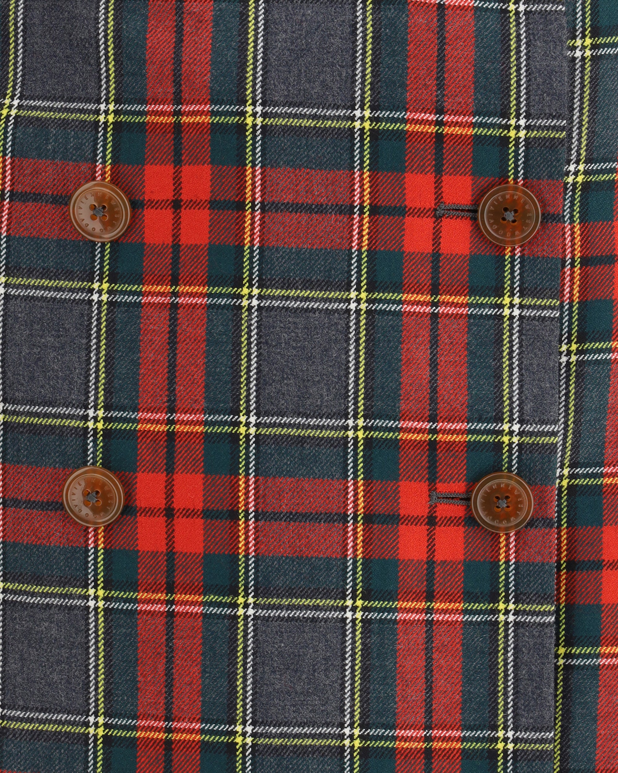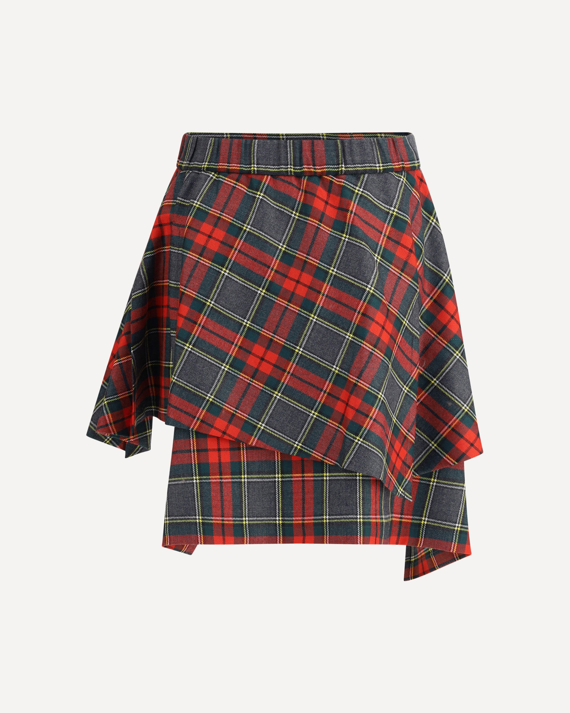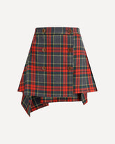 Virgin wool Marta Mini Skirt by Vivienne Westwood features an elegant wrap style with front button closure. The design features an elasticized waistband on the back panel for a comfortable fit, while the asymmetrical hem with longer back panel adds a dynamic and original touch. Complemented by a vibrant check pattern, it is a garment with an iconic and distinctive style.