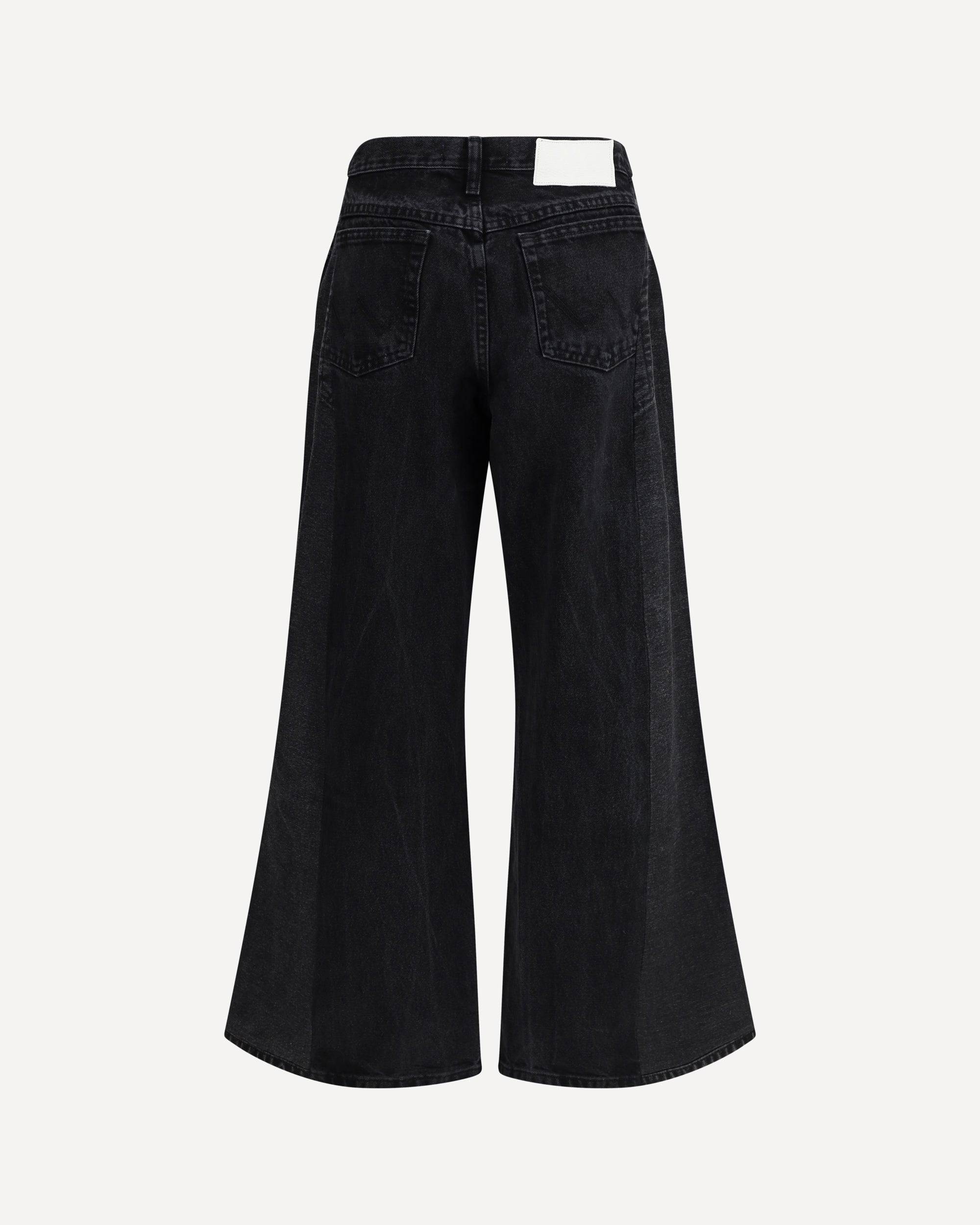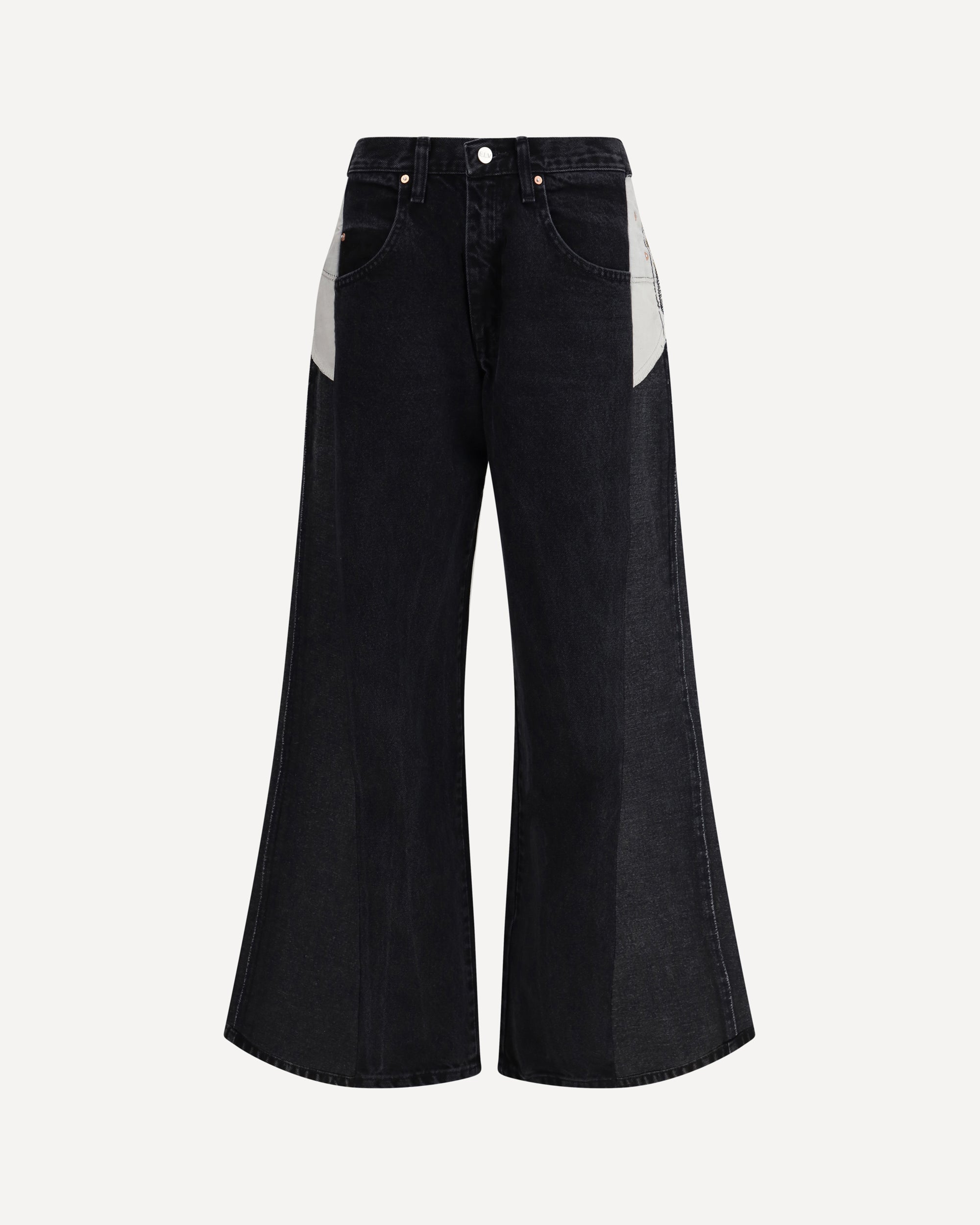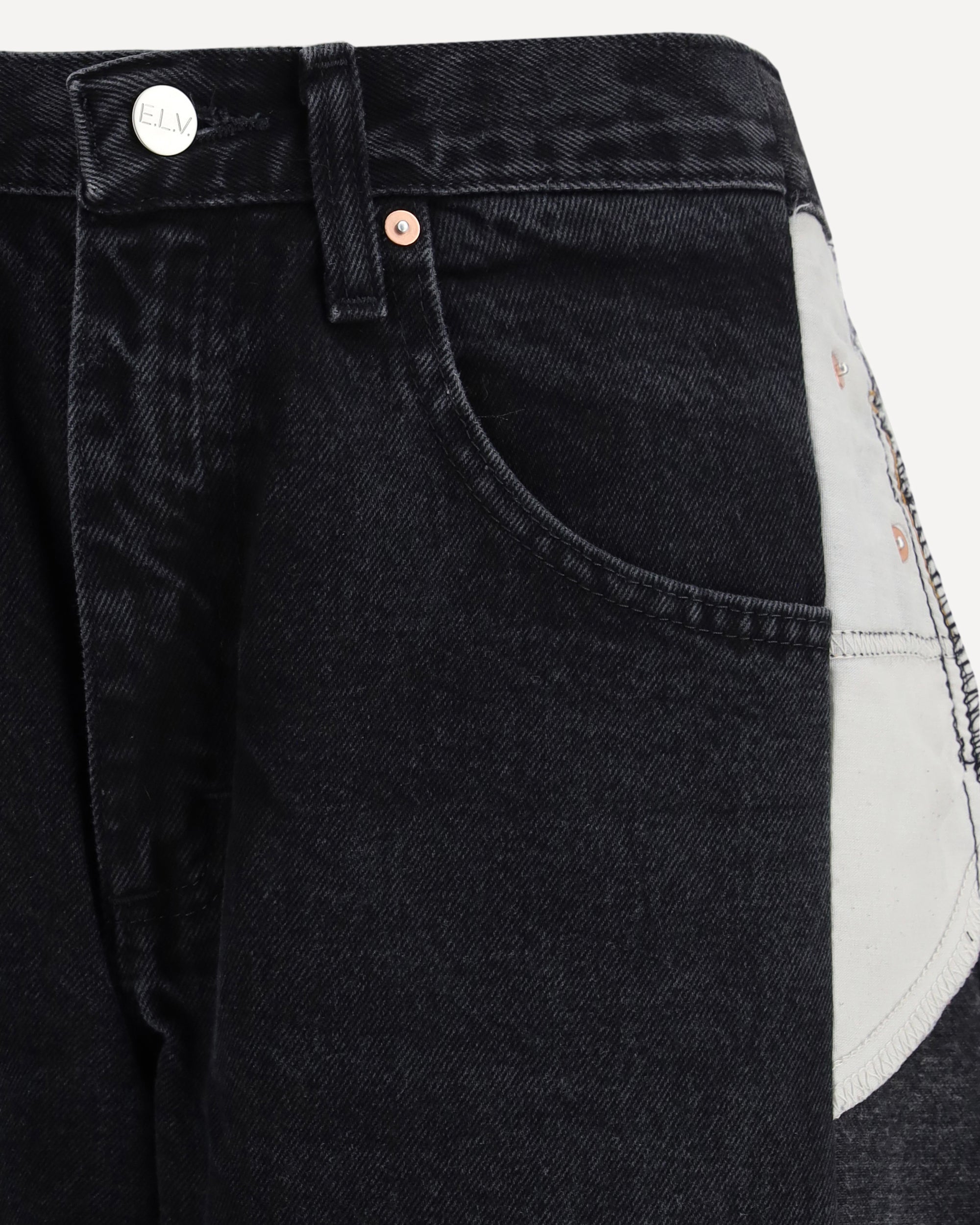 The Maya Denim Jeans by E.L.V. Denim embody the brand’s creative and sustainable spirit through the signature contrast cut and cool inside-out details. Handcrafted from two pairs of vintage jeans, they are designed with a low waist, slouchy fit at the hips, and a true wide leg. The rigid Denim fabric, softened with a lived-in feel, gives the piece an authentic and contemporary character.