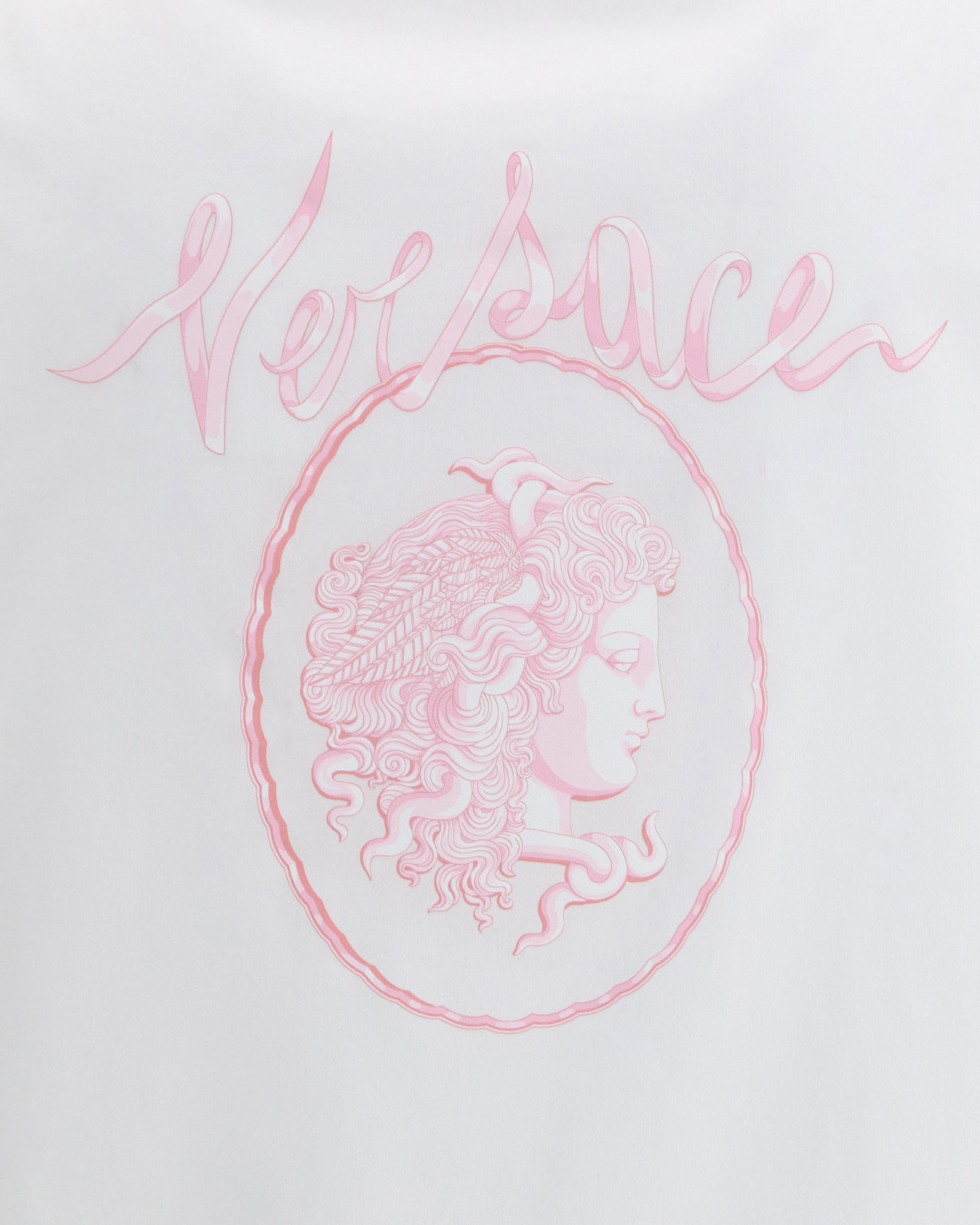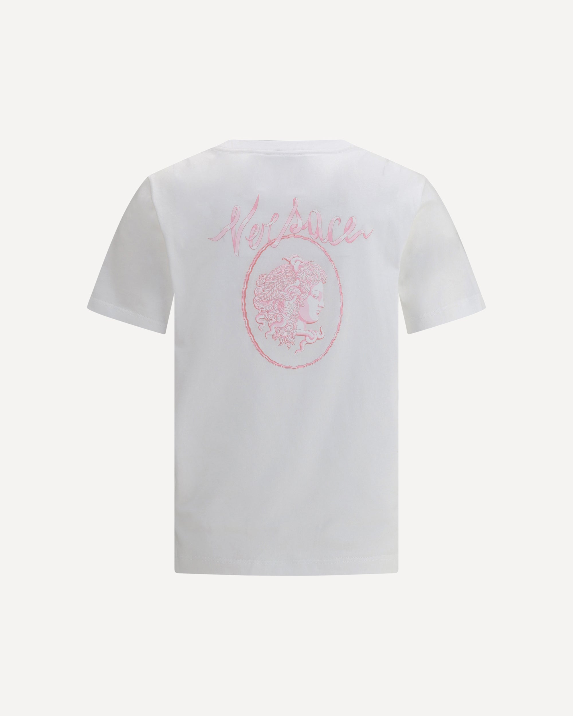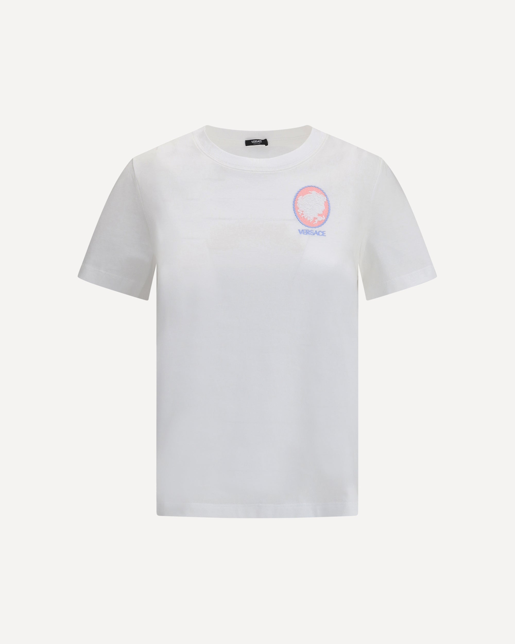 Versace's cotton Medusa T-Shirt features a ribbed crew neck that adds a touch of sophistication to the design. The real star of the garment is the iconic Medusa logo monogram embroidered in contrast on the front, giving it a distinctive and bold accent. This garment is perfect for those seeking a casual look but with a strong stylistic impact, representing the luxury and personality typical of the Versace brand.