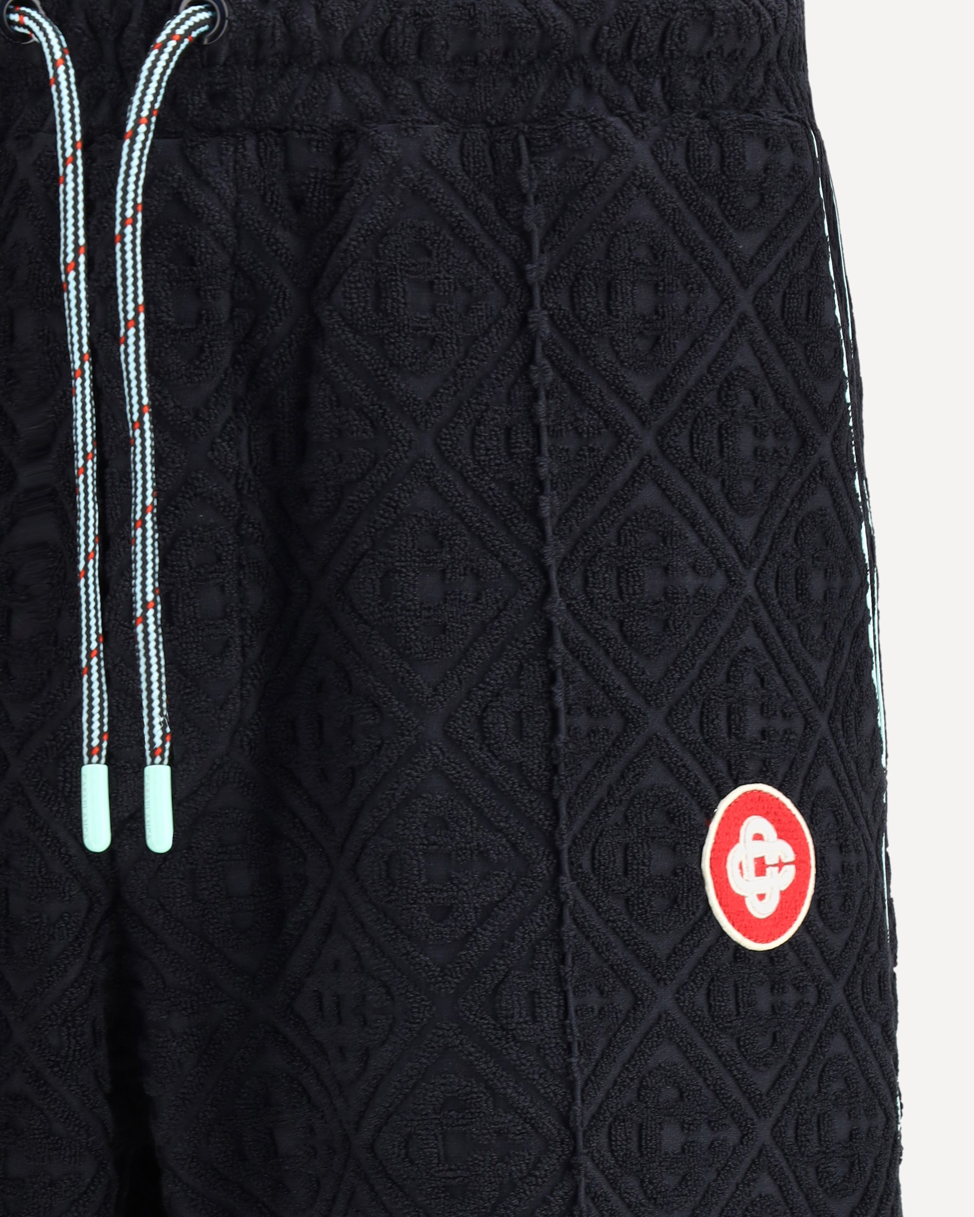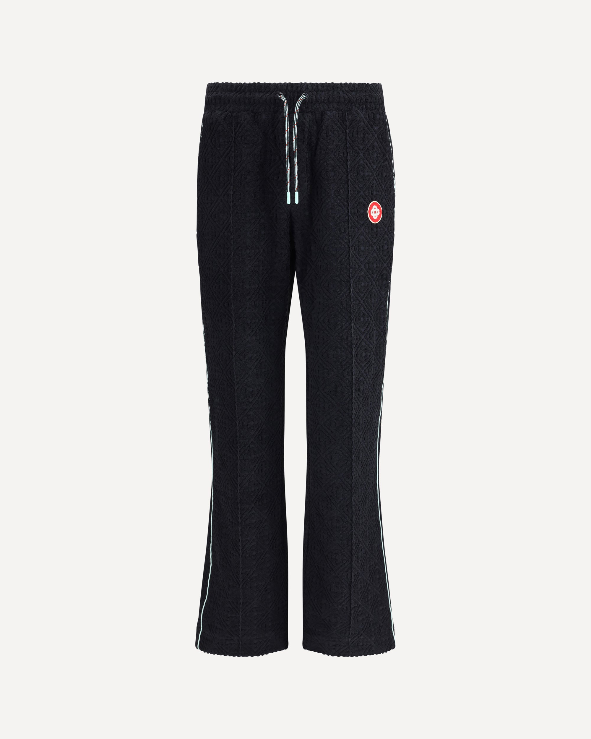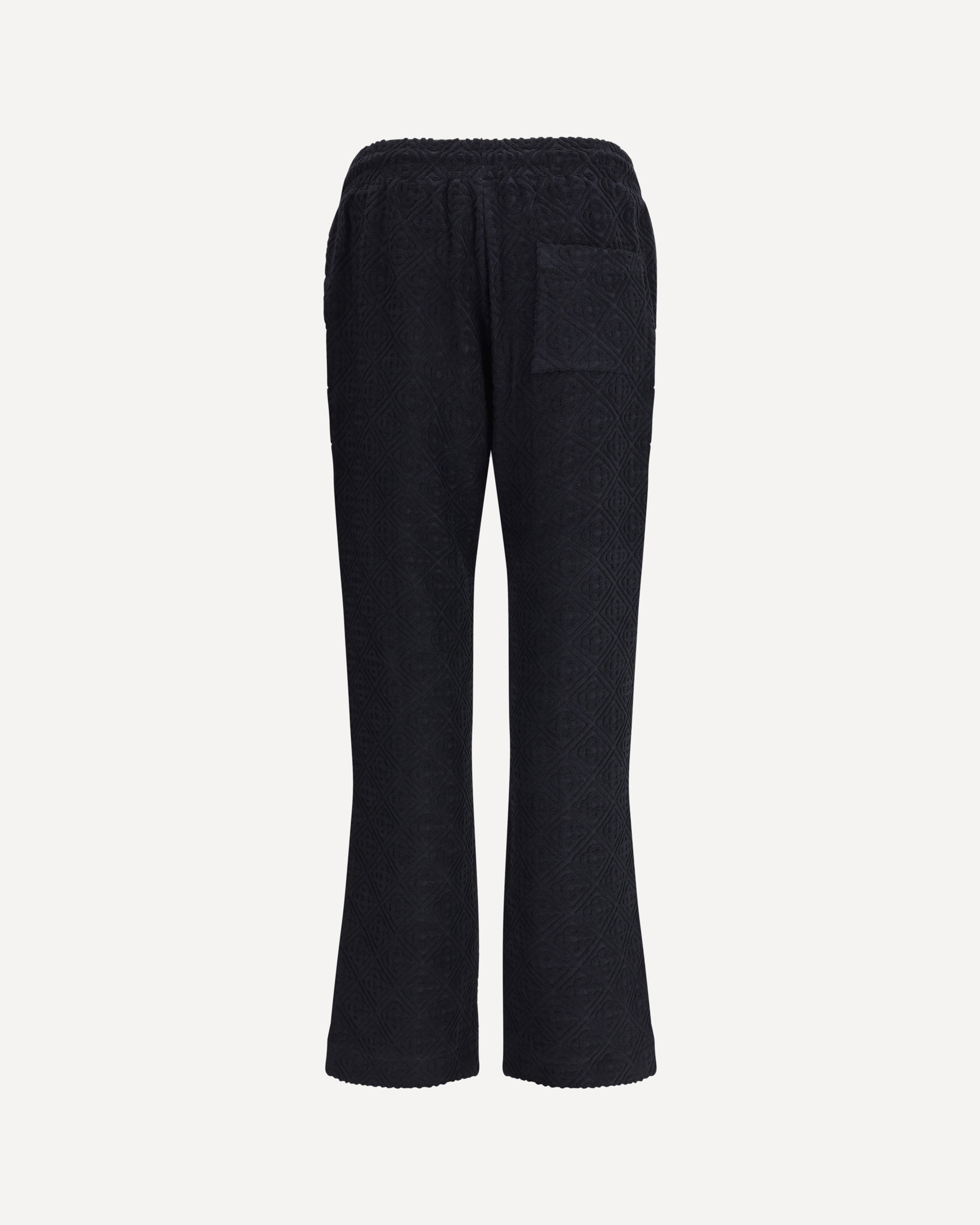Soft cotton Sweatpants by Casablanca feature terry-effect texture and all-over embossed logo that echoes the brand's distinctive aesthetic. The elastic waistband is adjustable with drawstrings for a comfortable and customizable fit. The style features two side welt pockets, a slit patch pocket on the back and a logo patch on the front. The wide leg gives a relaxed and contemporary look, perfect for completing casual luxe outfits.