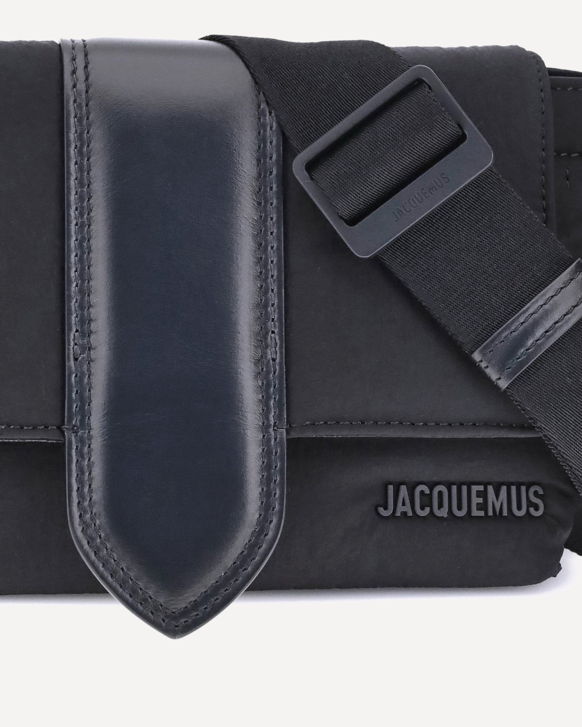 The Jacquemus Nylon Bambino Shoulder Bag reinterprets the messenger style with a contemporary and functional twist. Crafted from soft nylon, it features a leather handle and a magnetic flap with a leather tab, which hides a zip closure for added security. Inside, it offers a padded laptop pocket and a leather card slot, while the back features a patch pocket and a zip pocket. The adjustable and removable technical grosgrain shoulder strap and matte black metal hardware complete the design, making it ideal for everyday use with a bold, urban style.