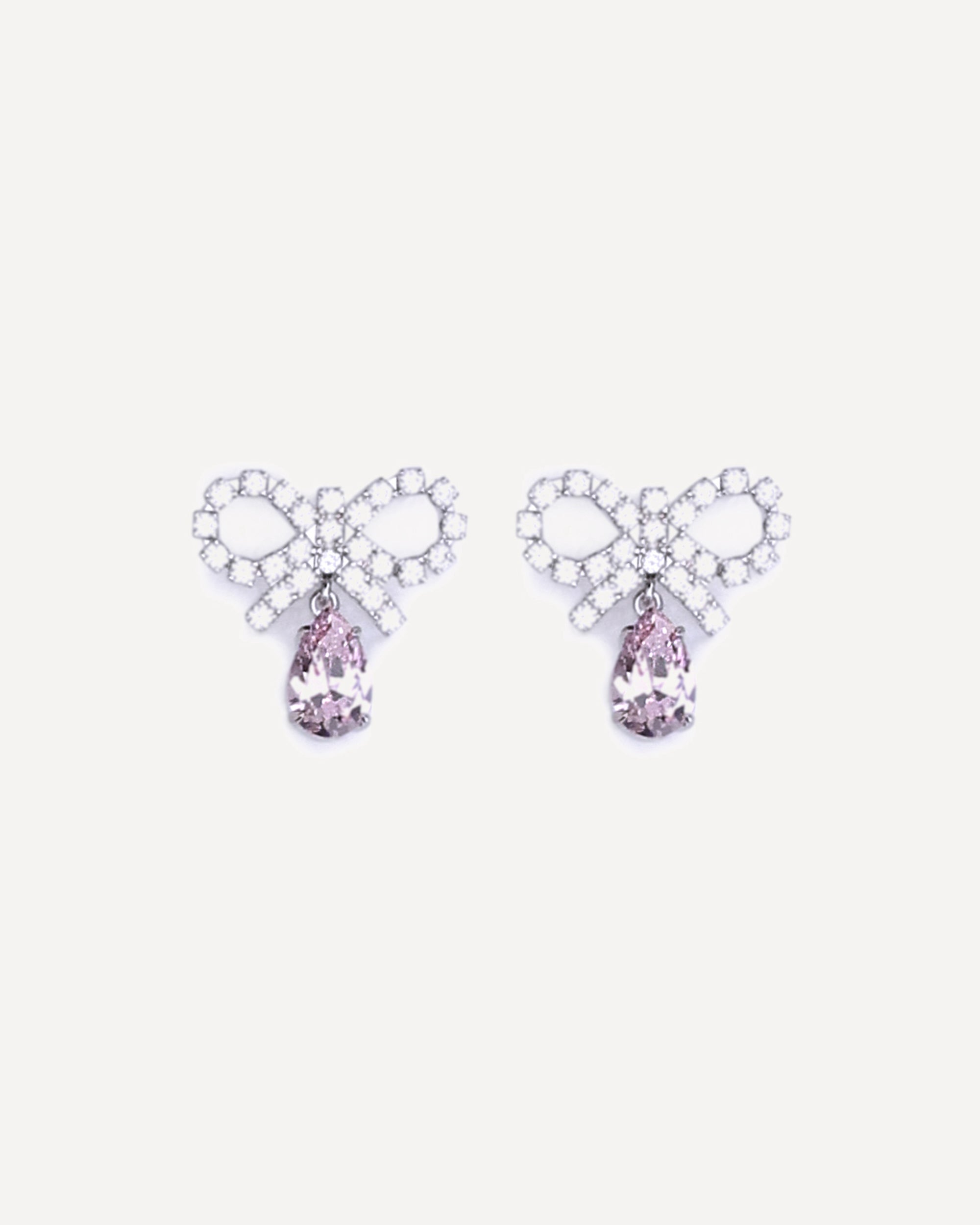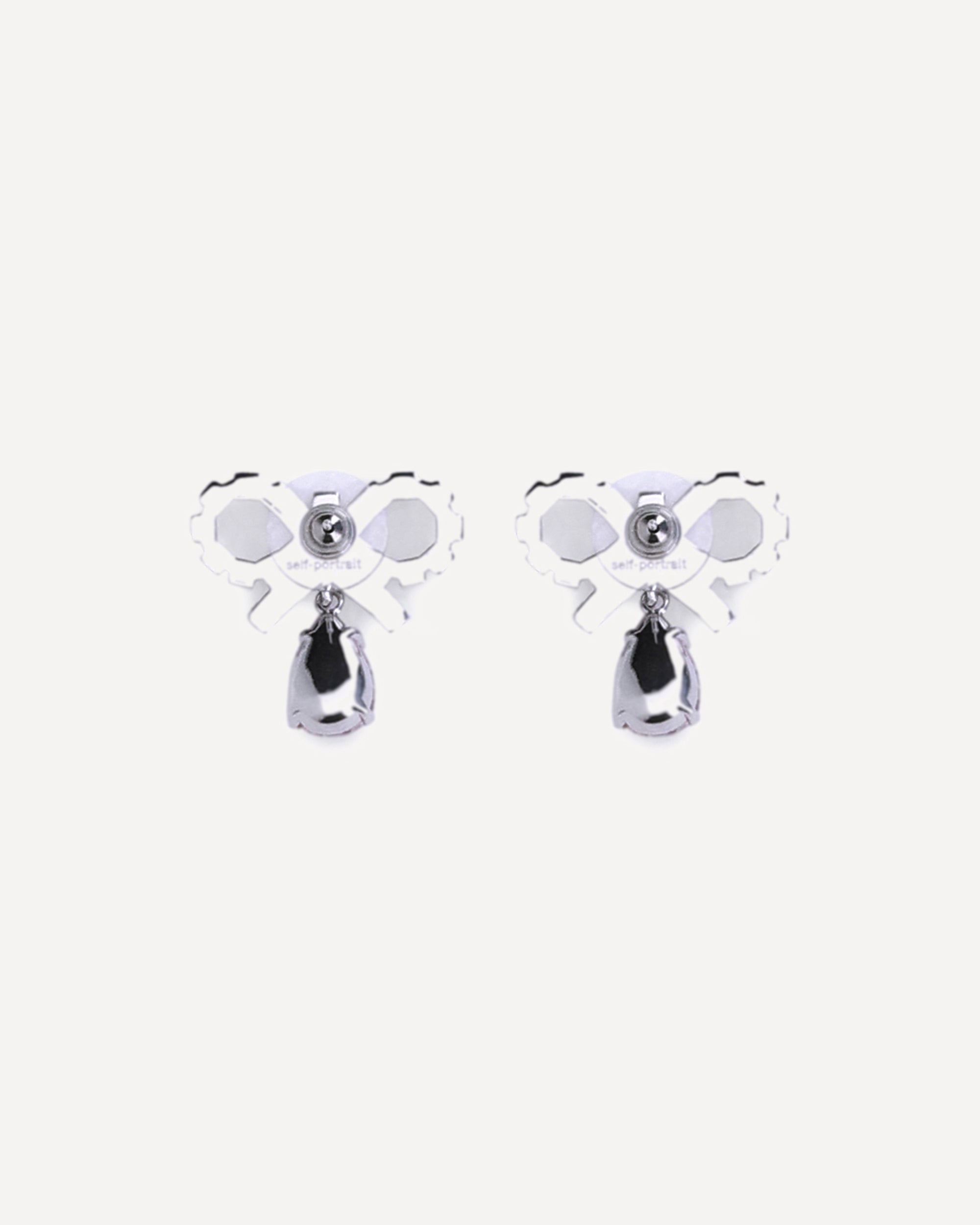 Earrings by Self-Portrait with an elegant and feminine design, featuring a classic butterfly clasp. The model features a bow embellished with shiny jewels and a drop-shaped pendant with pink crystal, giving light and sophistication to the face. Ideal for completing evening looks or special occasions with a romantic and sophisticated touch.