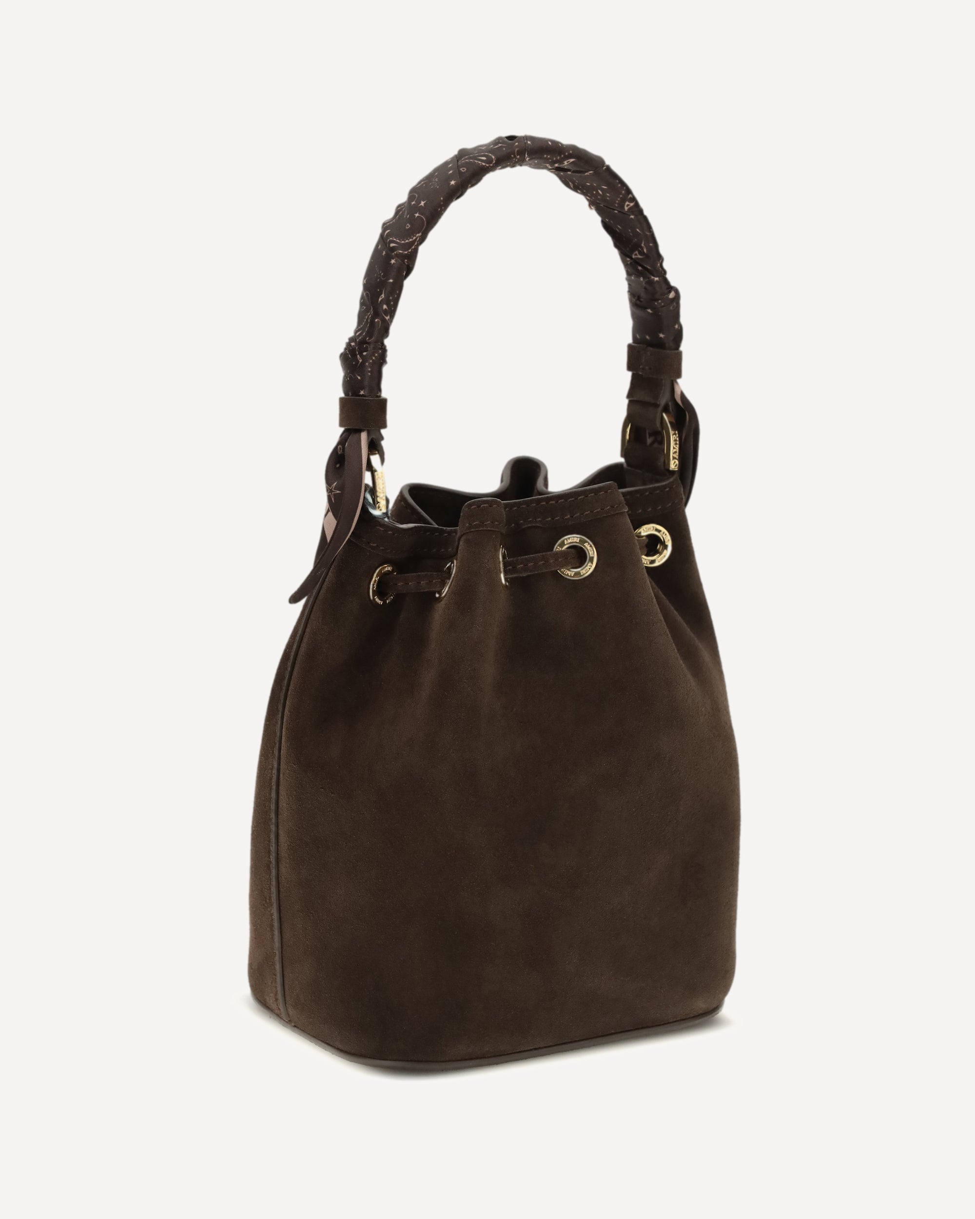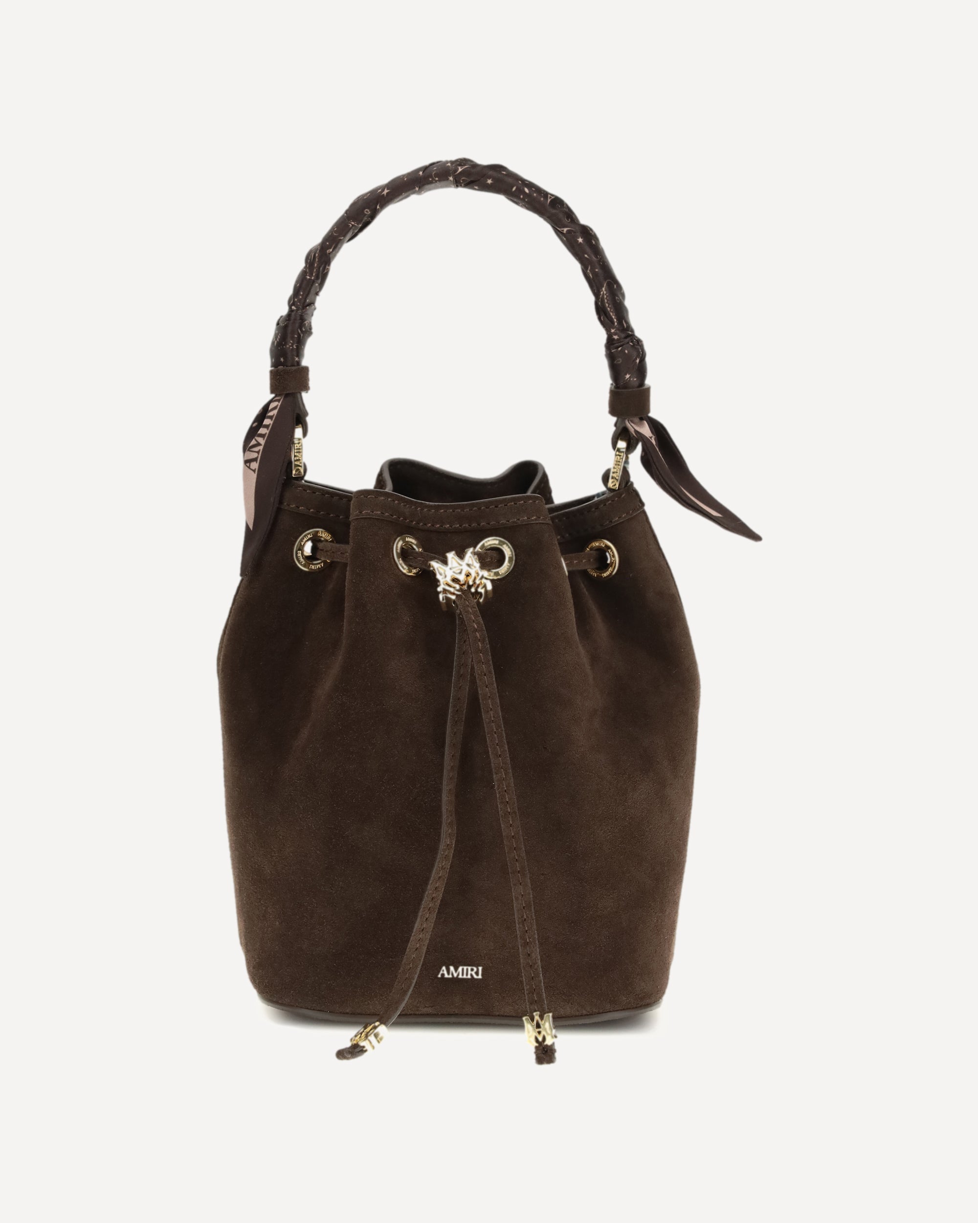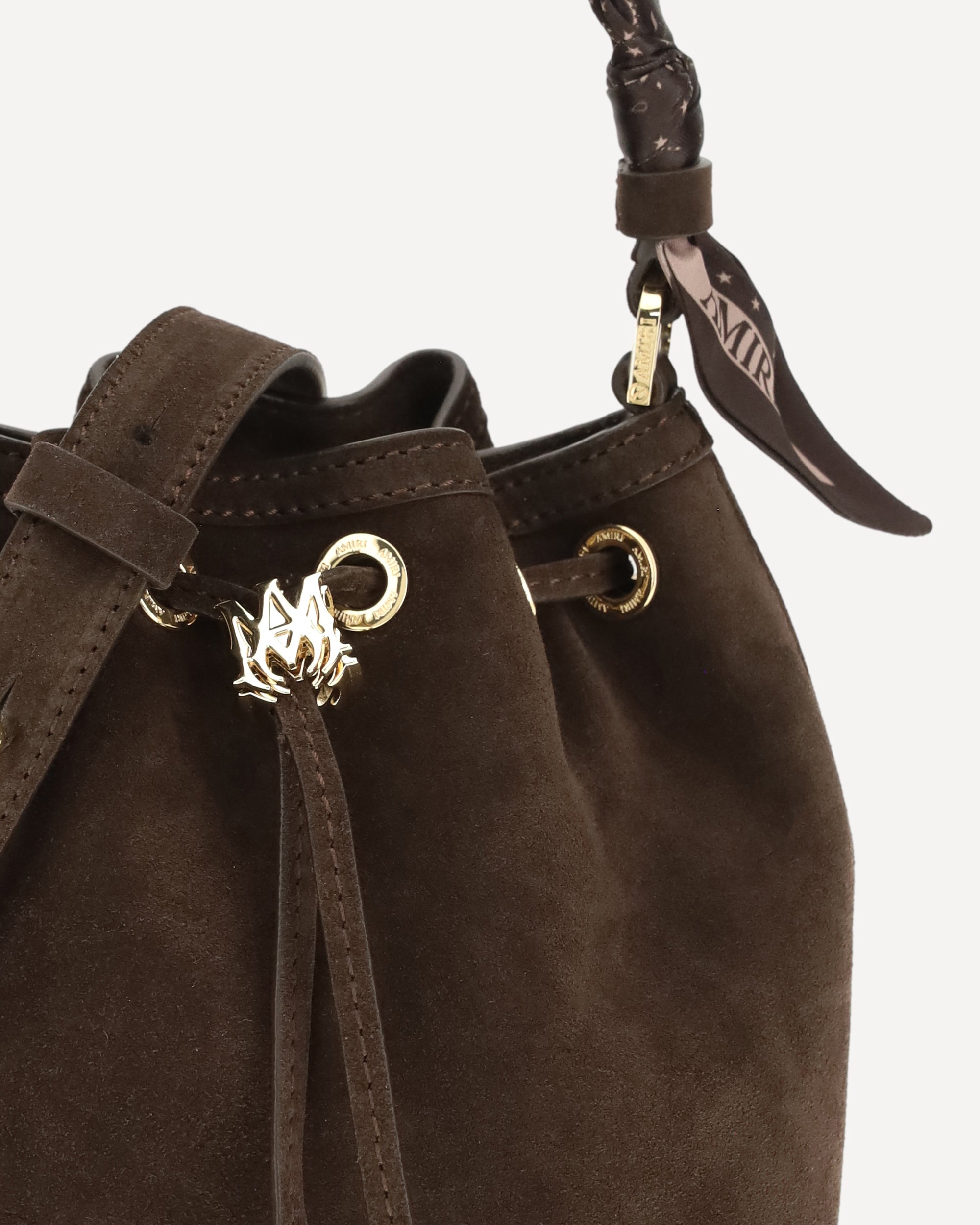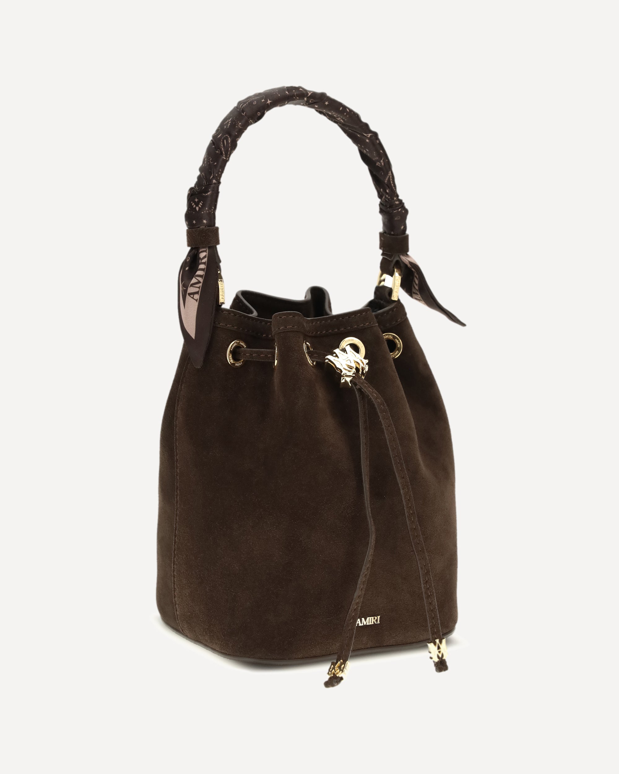 The Micro Ma Bucket Bag by Amiri expresses timeless elegance through a compact and refined silhouette. Made of soft suede leather, it is embellished with custom Ma metal details that enhance its exclusive character. The drawstring closure ensures practicality, while the top handle with knotted paisley scarves adds a distinctive touch. A detachable suede shoulder strap completes the design for a versatile and sophisticated style.