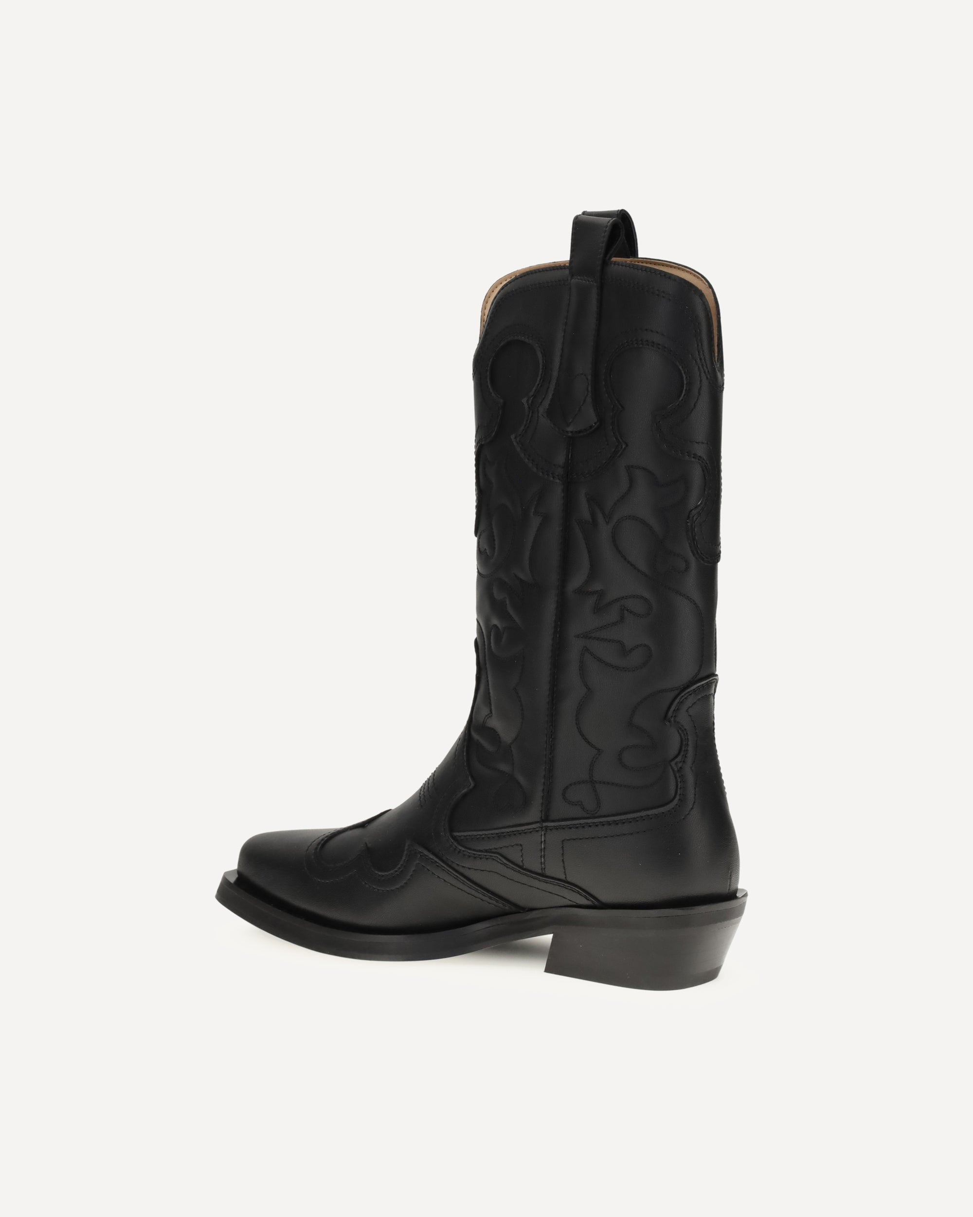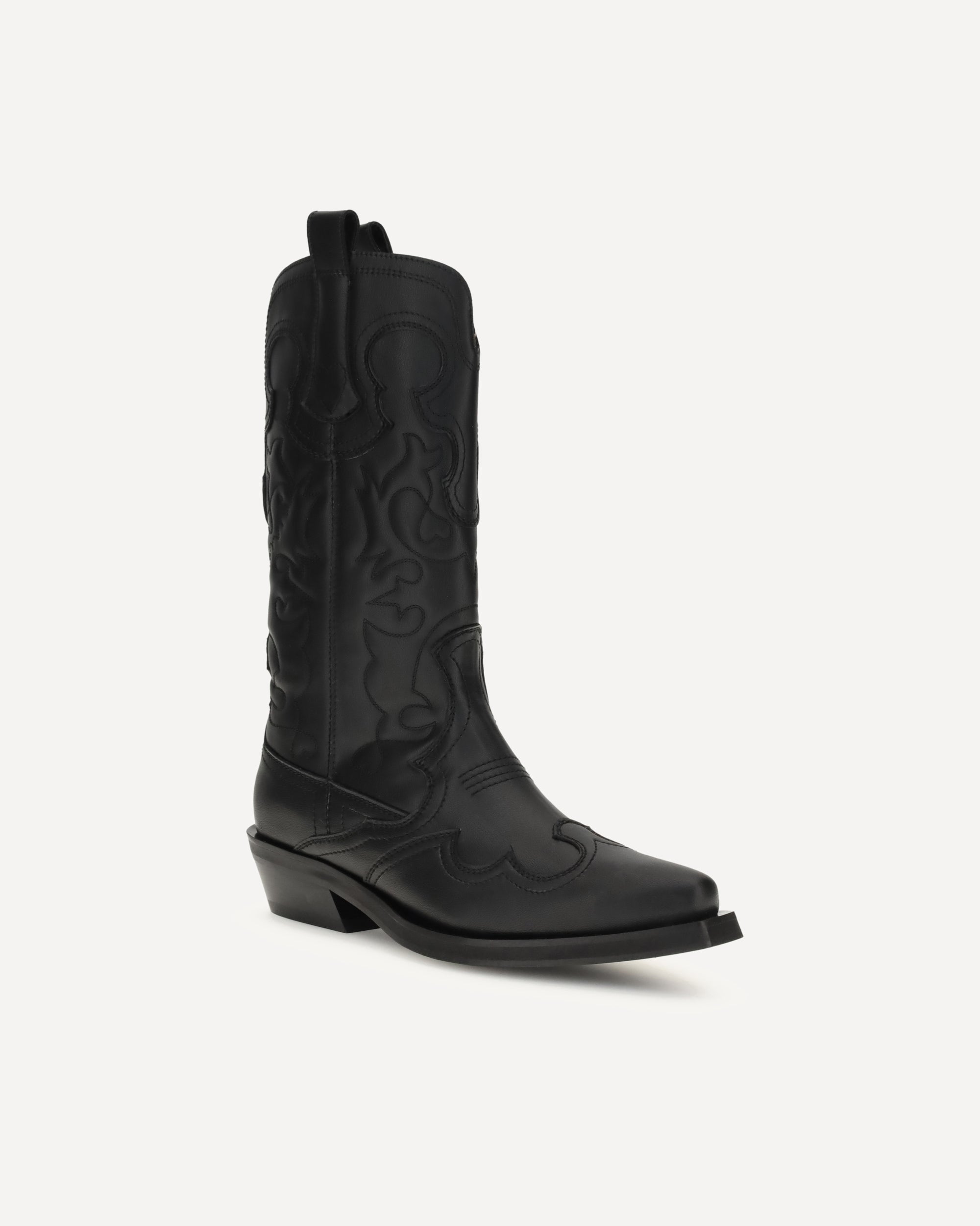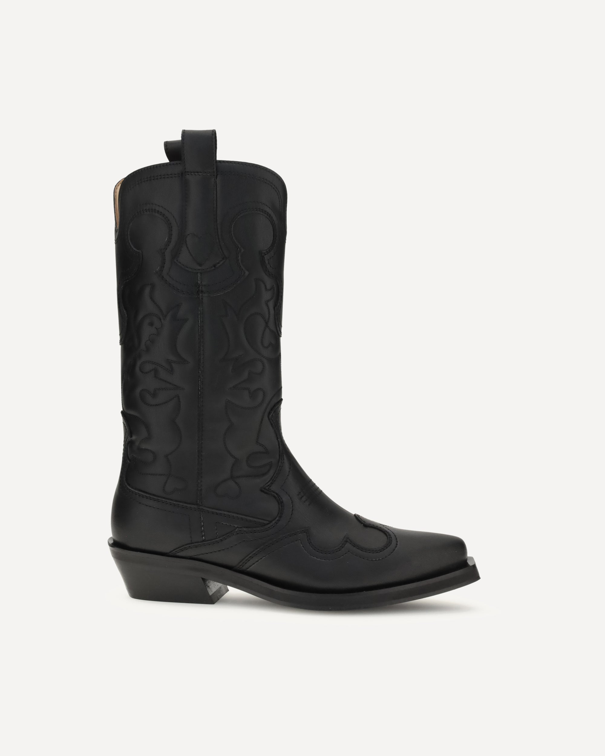 Ganni's embroidered Western Boots are a mid-calf style featuring a pointed toe and embroidered details that enhance its distinctive style. Practical pull tabs and a low, angled heel complete the design, perfect for a contemporary look with a Western flavor.