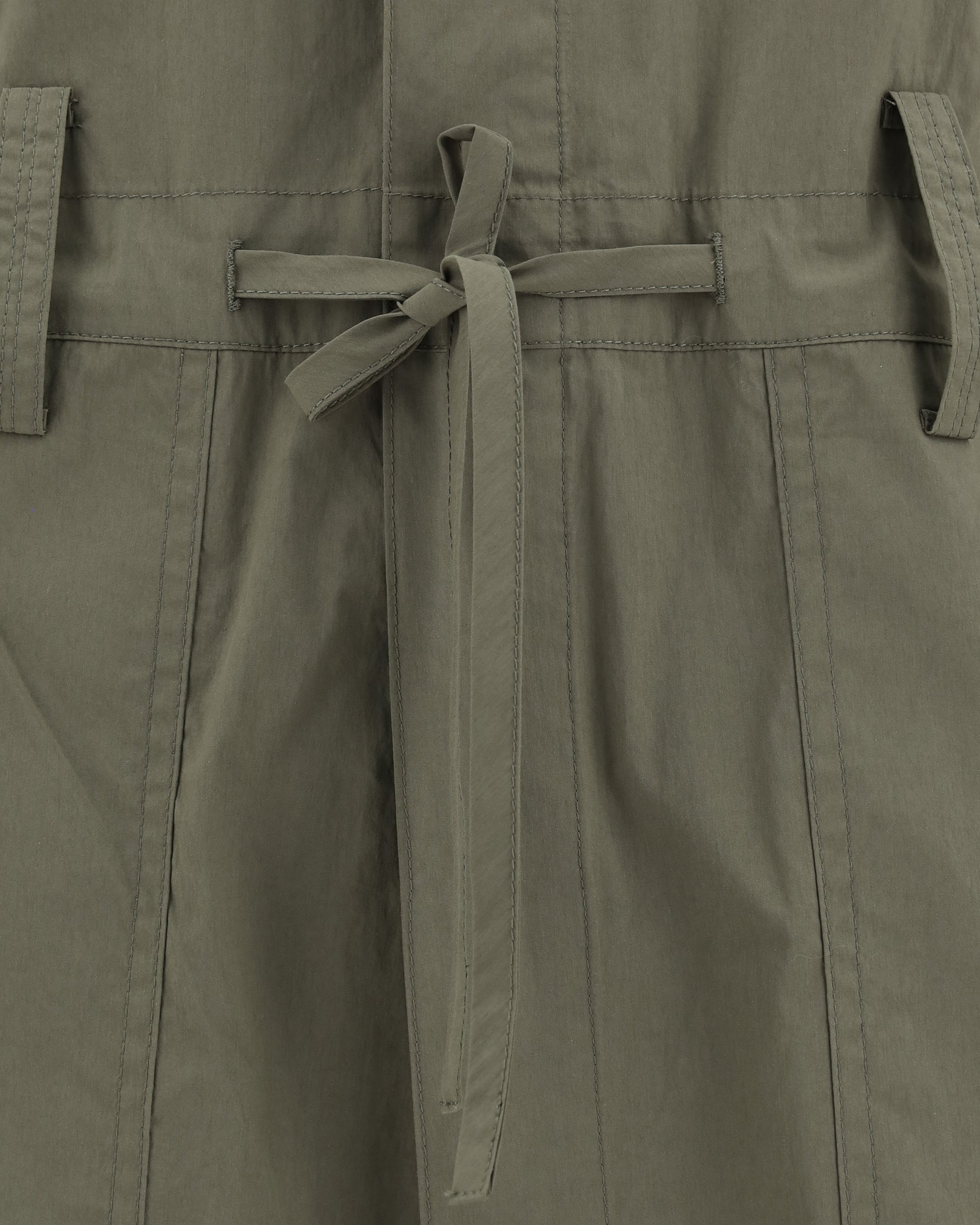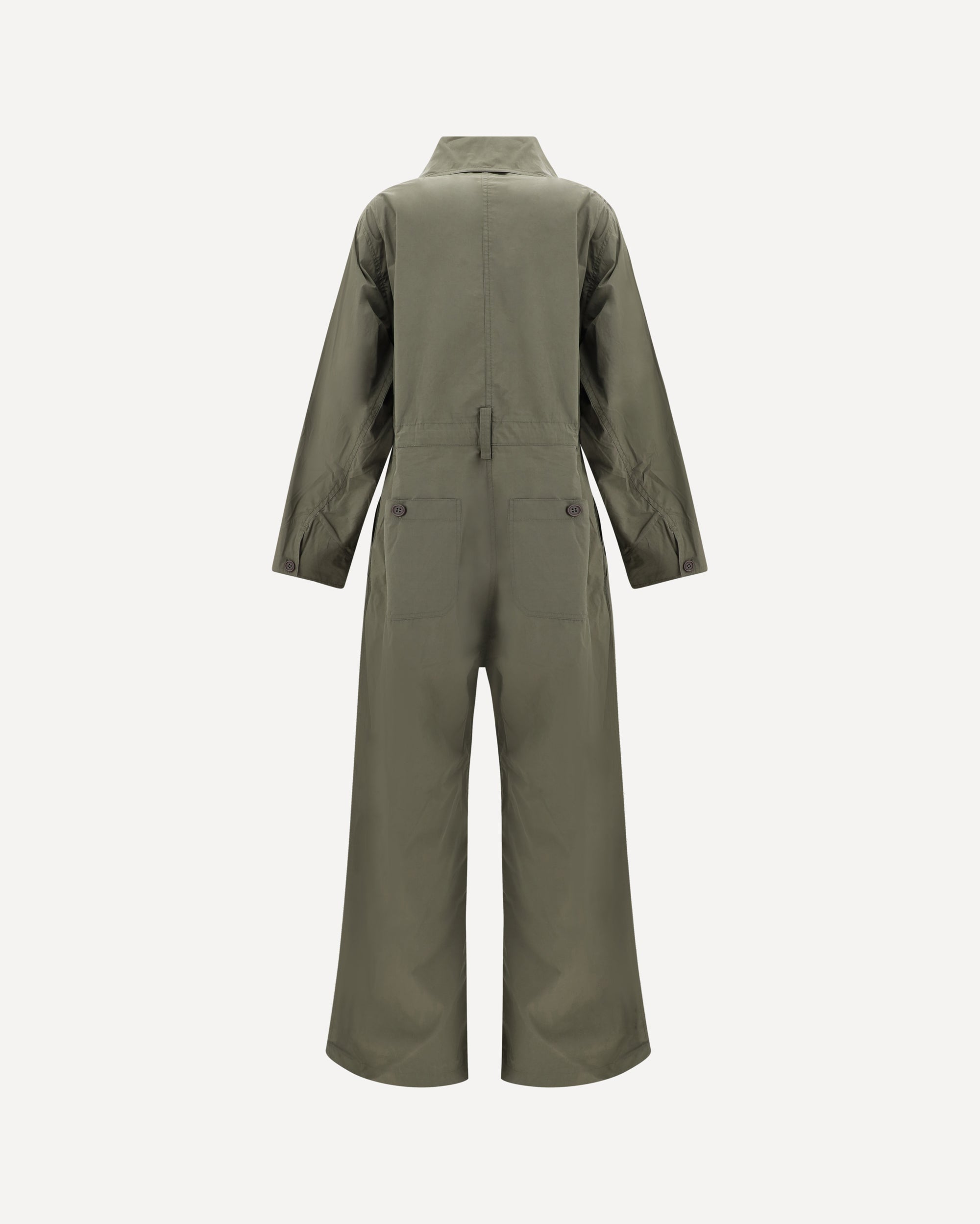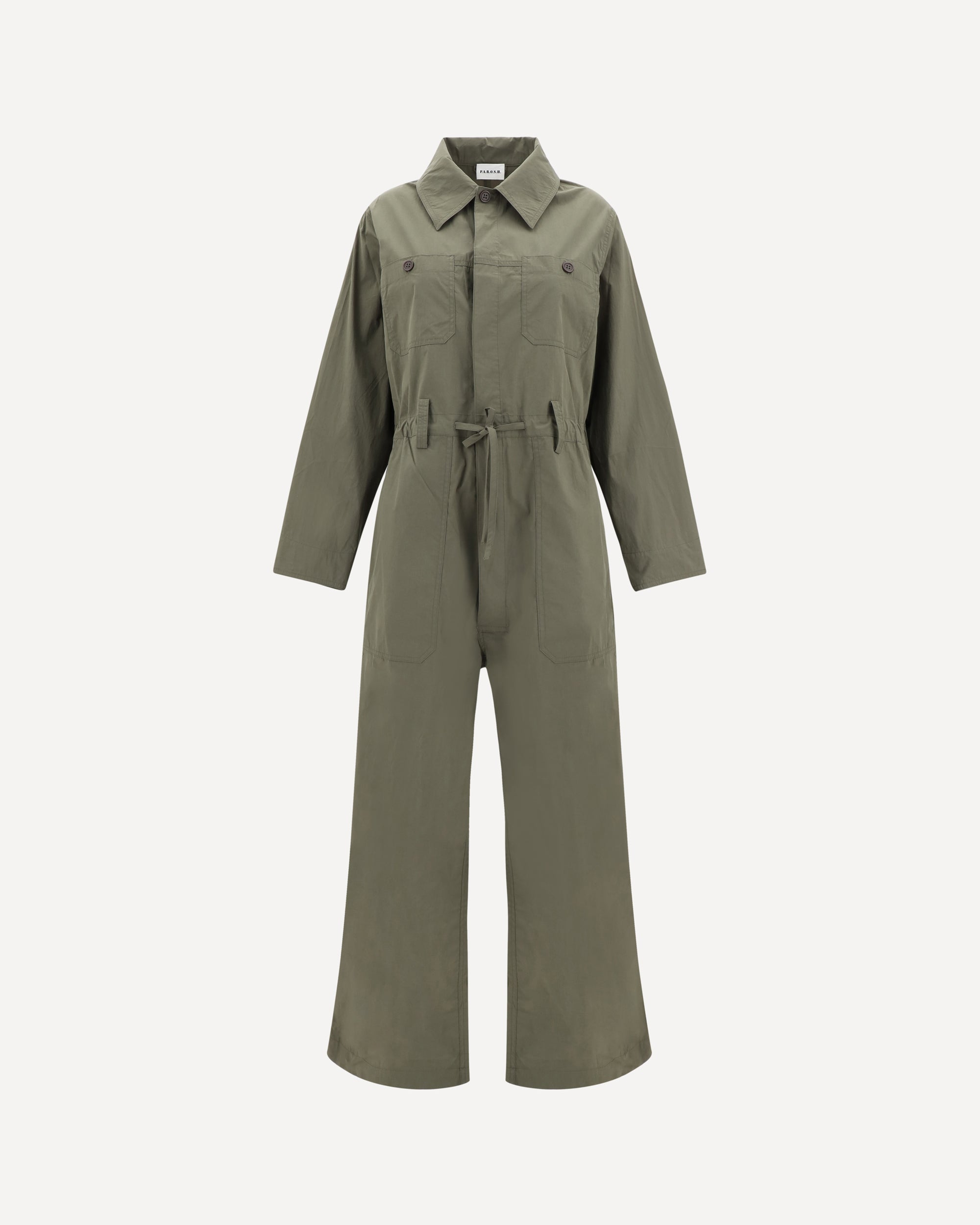 The Military Green Jumpsuit by P.A.R.O.S.H. is a versatile, sharply styled garment perfect for a practical yet sophisticated look. The long-sleeved design and classic lapels add a touch of elegance, while the front closure with hidden buttons ensures a clean, refined silhouette. The adjustable drawstring waist allows you to customize the fit, accentuating the silhouette. The numerous patch pockets-two side, two buttoned back, and two chest pockets-not only offer practicality, but also help give the jumpsuit a functional and dynamic look.