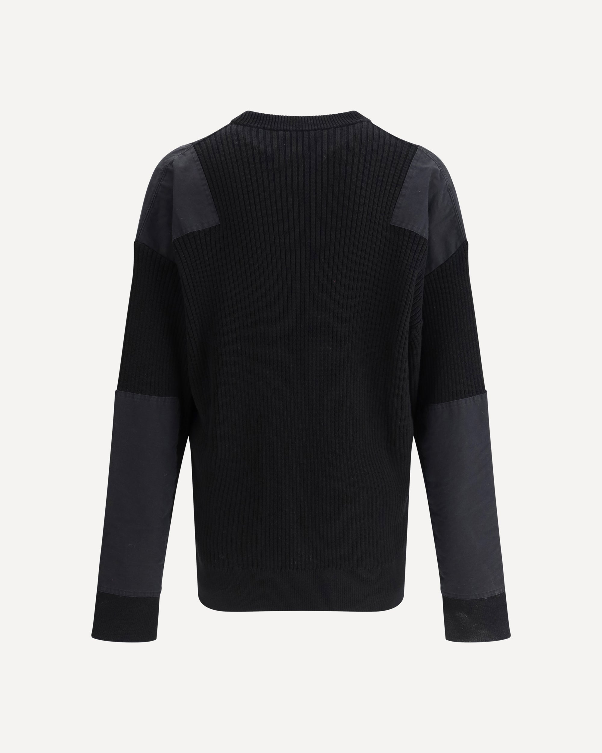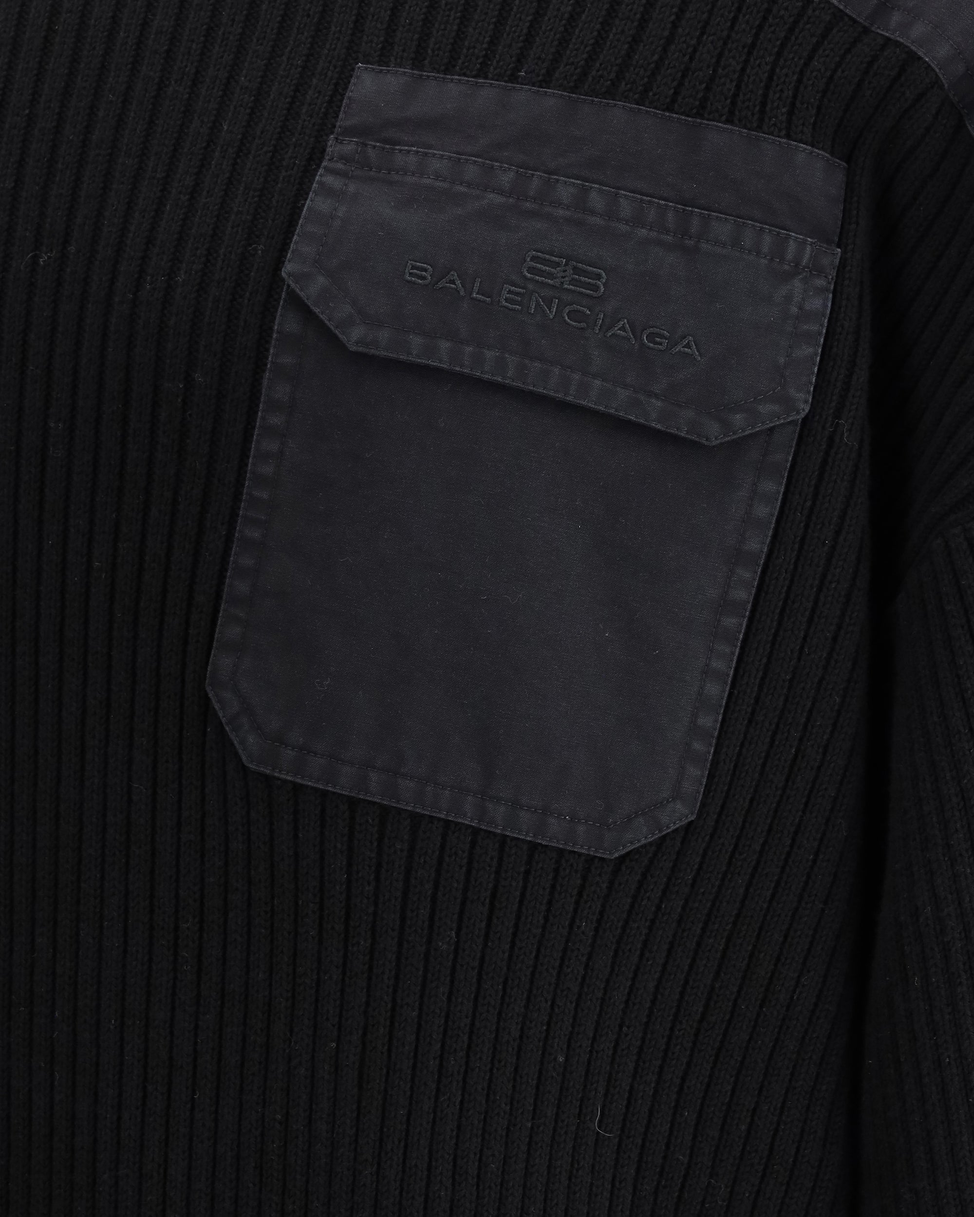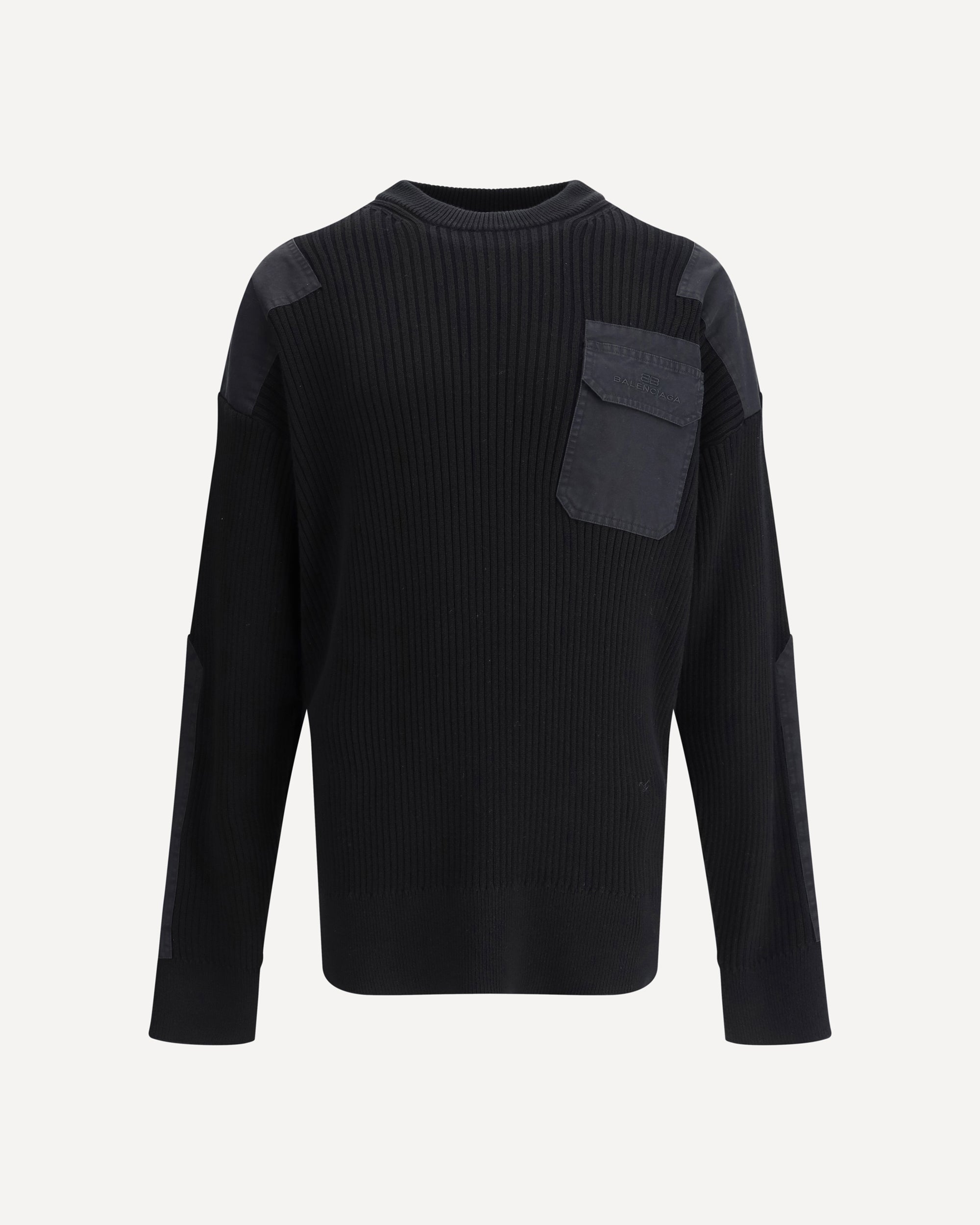 Balenciaga's Military Sweater features a ribbed crew neck that gives a classic and versatile look. The design features a combination of ribbing and panels, adding texture and a distinctive touch to the garment. A patch pocket on the front, with the signature stitched on top, enhances the sweater with a recognizable brand detail. Dropped sleeves complete the look, offering a more relaxed and modern fit.