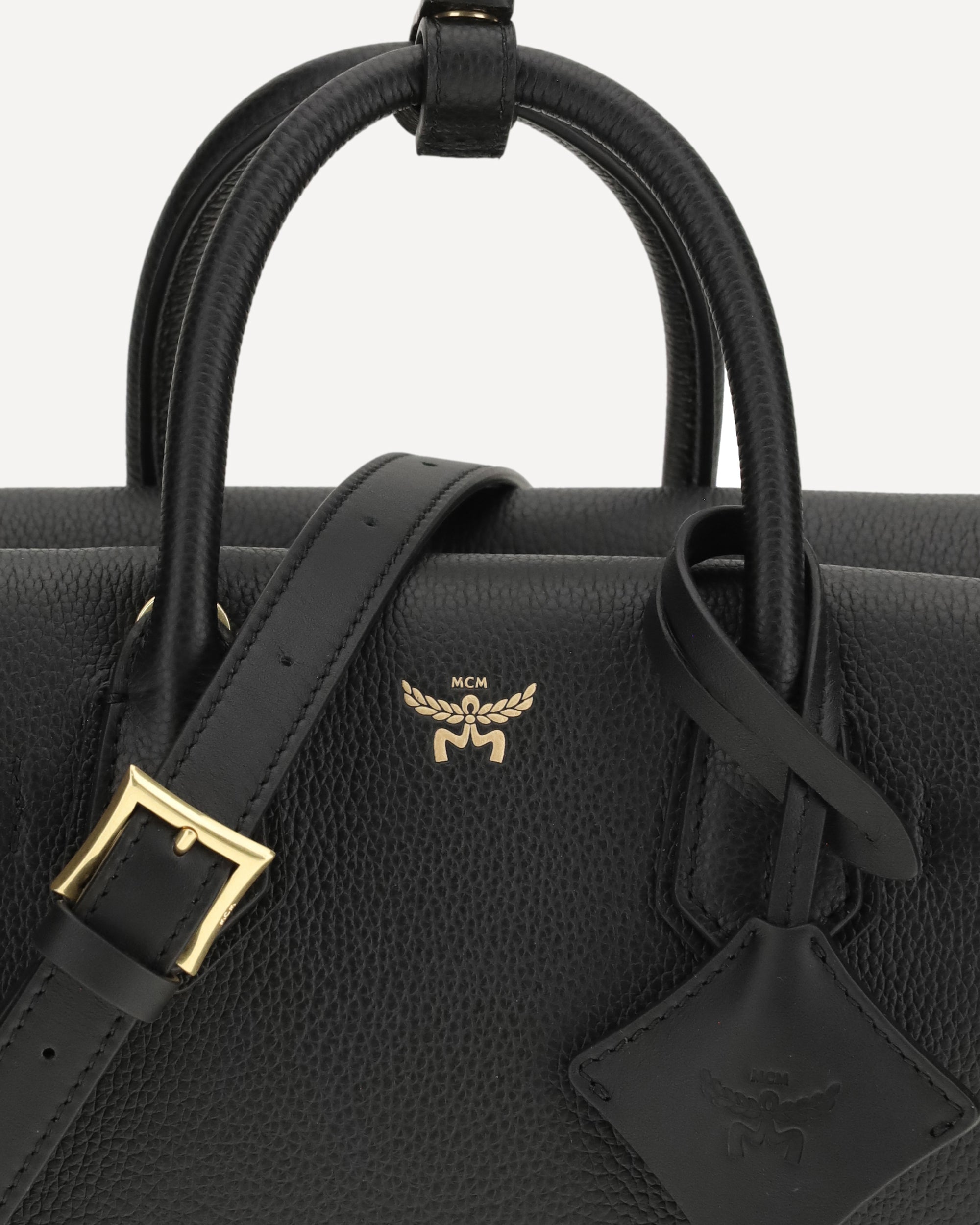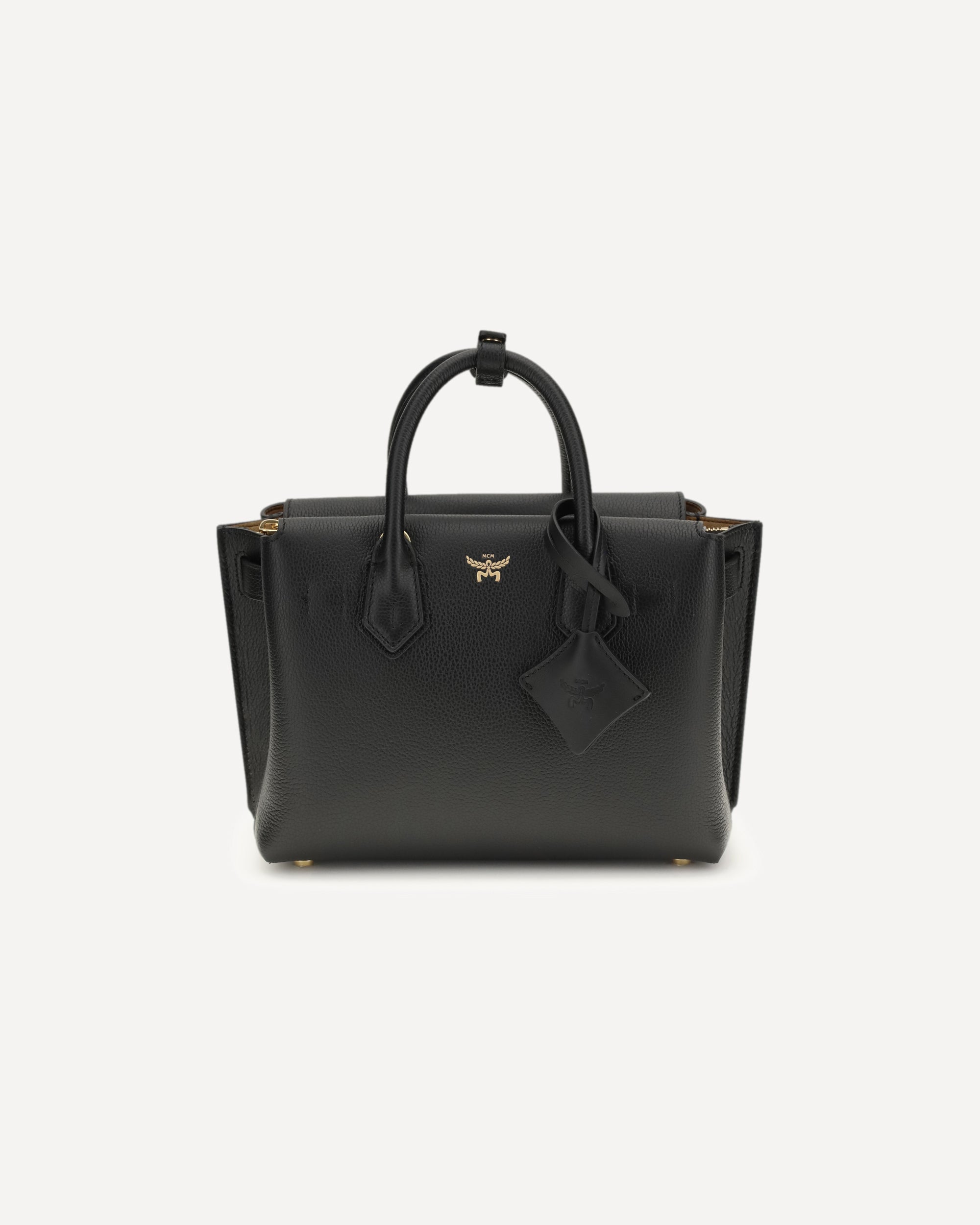 The Milla Handbag by MCM features a trapezoidal silhouette that gently flares upward. Equipped with two handles and a shoulder strap, it can be worn by hand, on the forearm or over the shoulder with great versatility. Gold details, including protective feet, exclusive closure and central "Mode Creation Munich" logo, add elegance, while discreet stitching and contrasting pink piping define a refined, minimalist design.