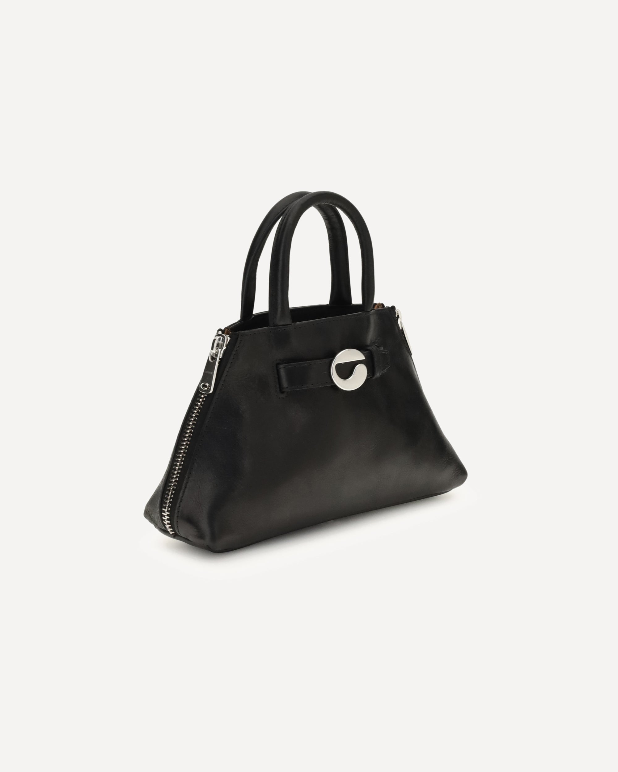 The Mini Data Bag by Coperni stands out for its sleek, compact silhouette. Crafted from black textured calf leather with a crinkled finish, it’s designed to carry just the essentials. A detachable long strap offers versatile styling options.