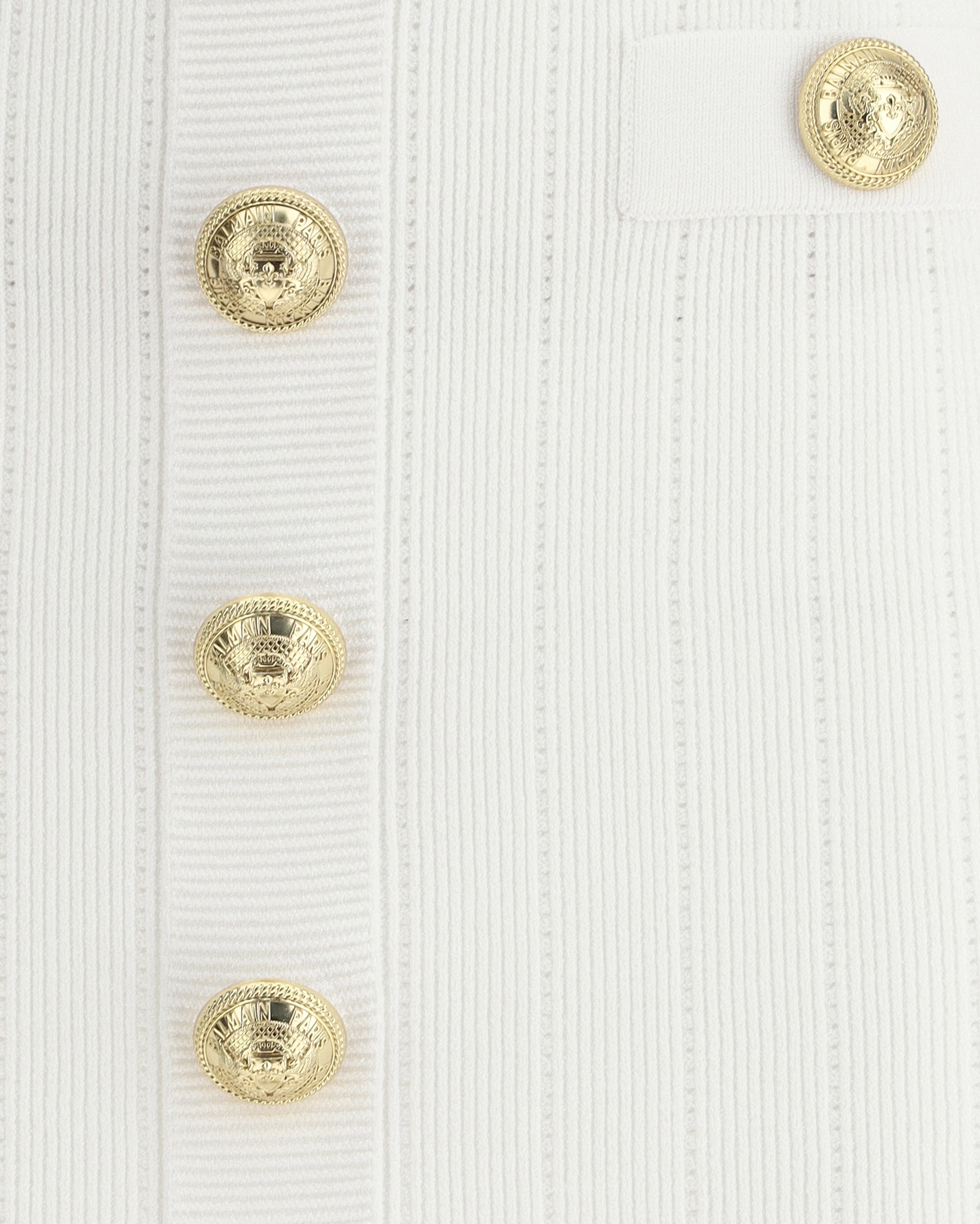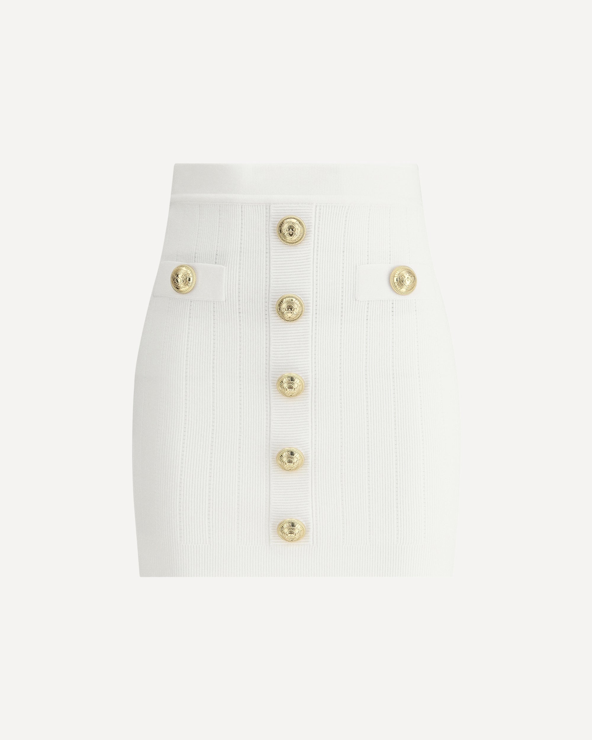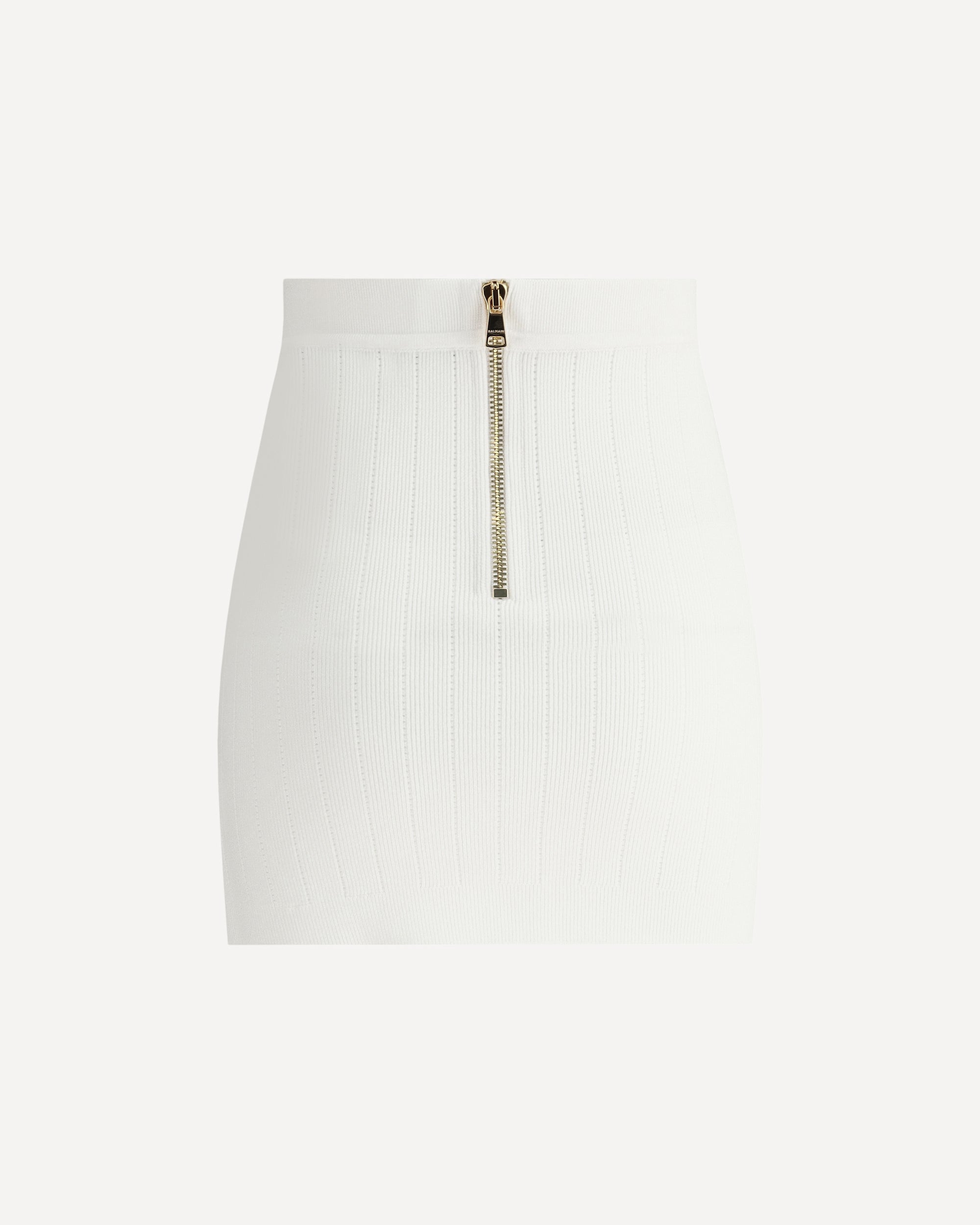 Mini Skirt by Balmain, ribbed design with all-over repeated perforated details, contrasting back zipper closure, two faux welt pockets on front, contrasting applied lion's head button detail on front, monochrome pattern, close fit.