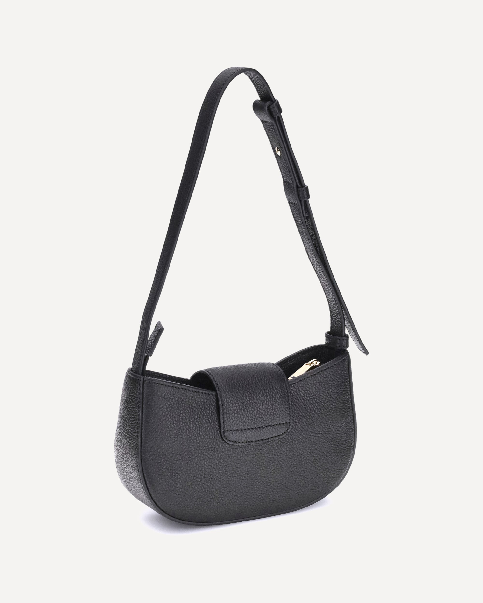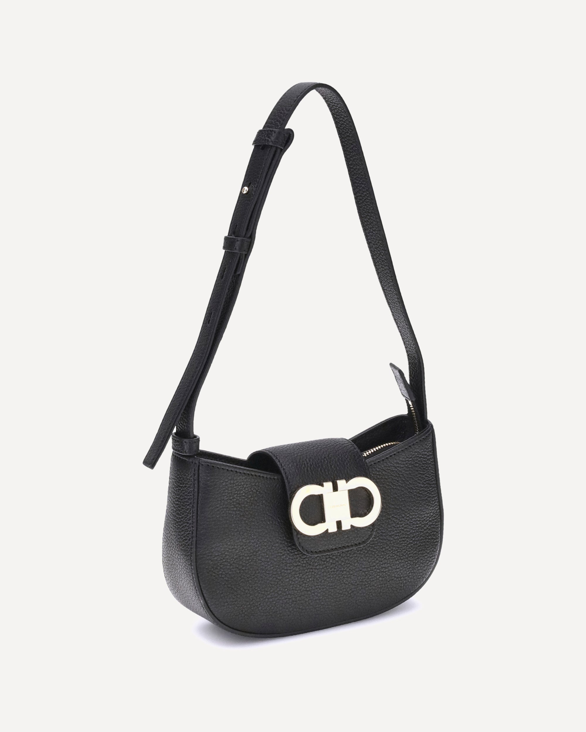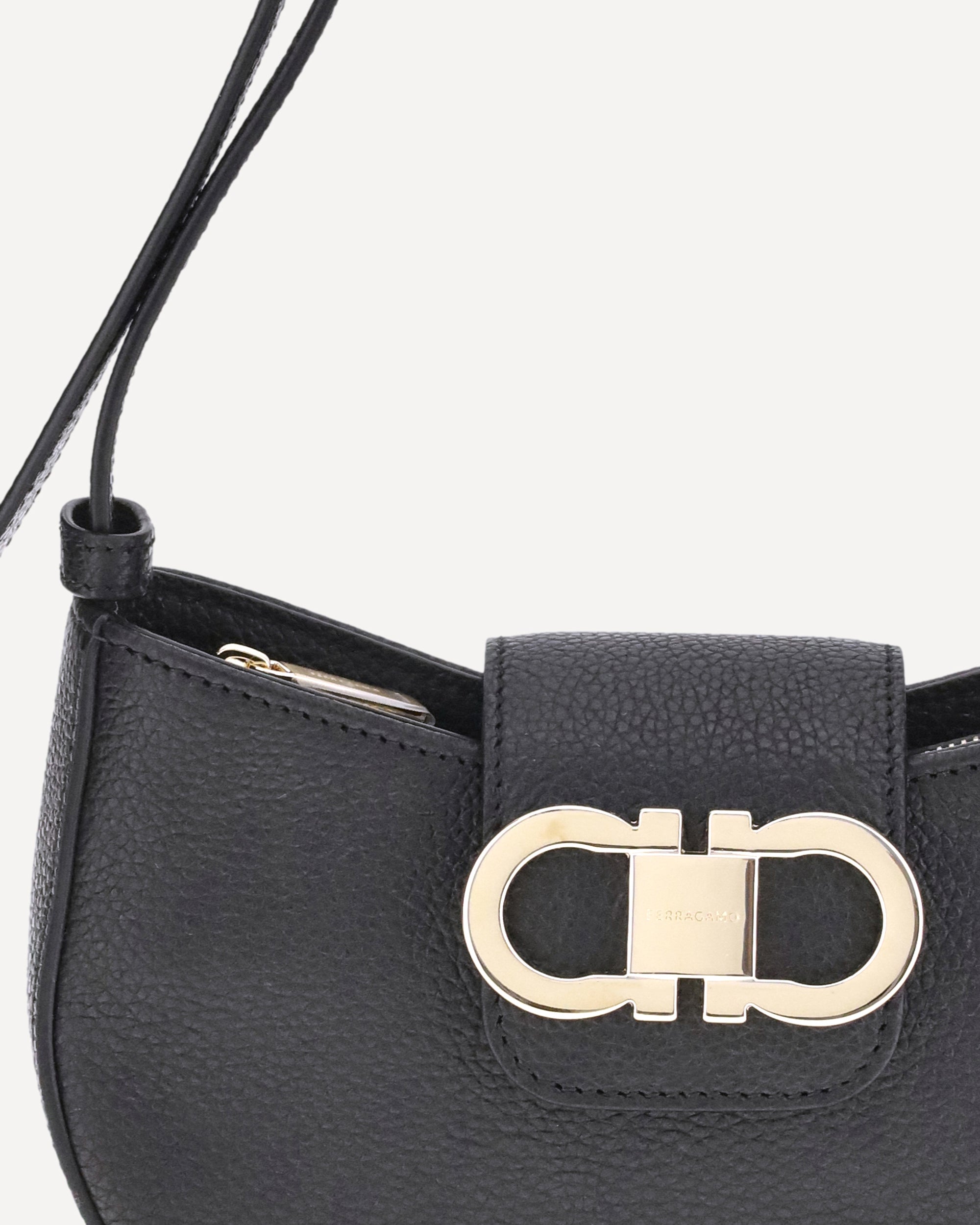 Ferragamo's Gancini Shoulder Bag embodies elegance through clean, simple lines. This new minibag features slightly rounded shapes, a modern and refined design. It opens with a practical zipper, and a bridge decorated with the iconic Gancini ornament enriches its aesthetic. Internally, it is finely lined in leather and optimized with slots for cards and documents, ensuring practicality and organization. With its length-adjustable shoulder strap, it can be comfortably worn over the shoulder, fitting perfectly with your style and needs.