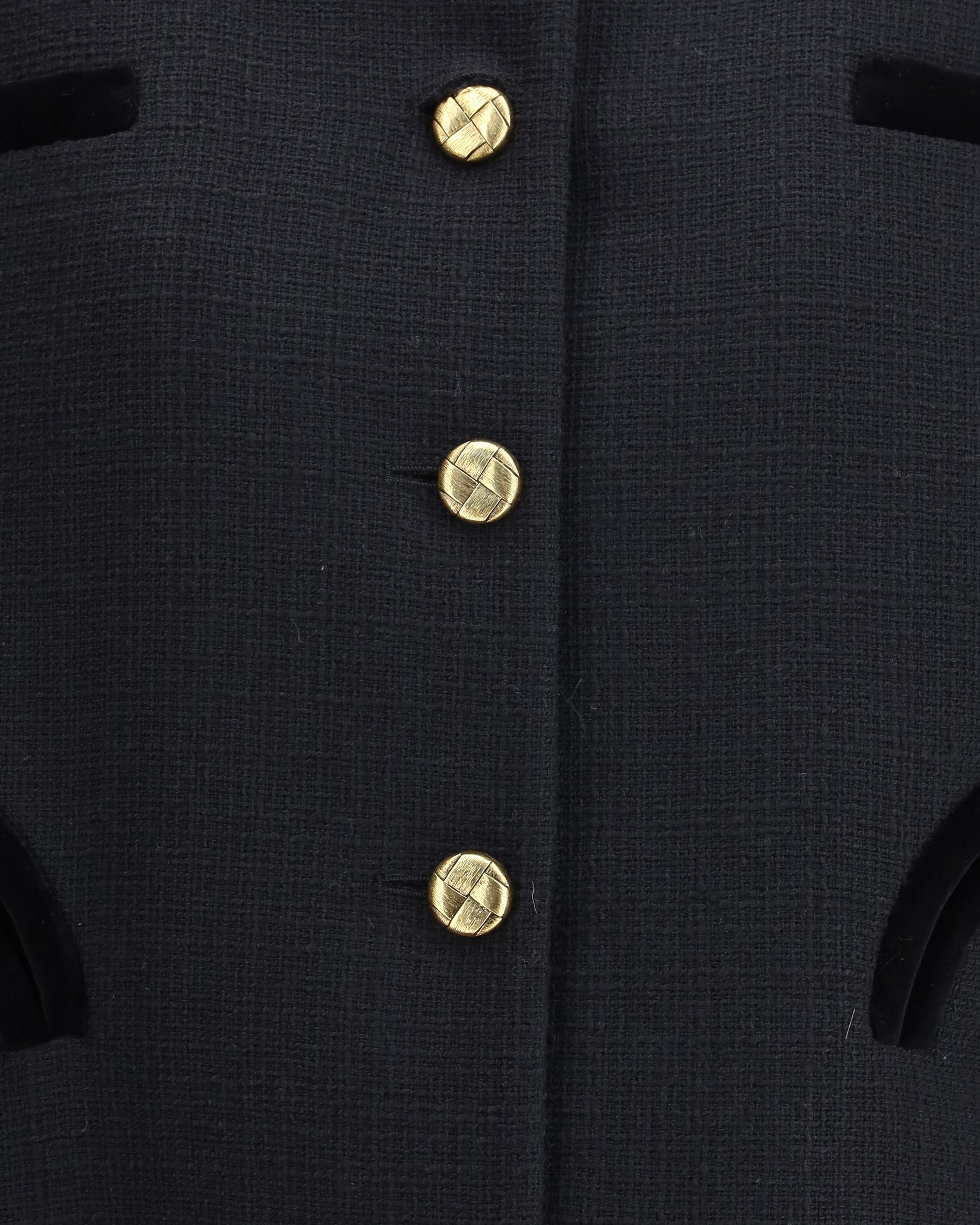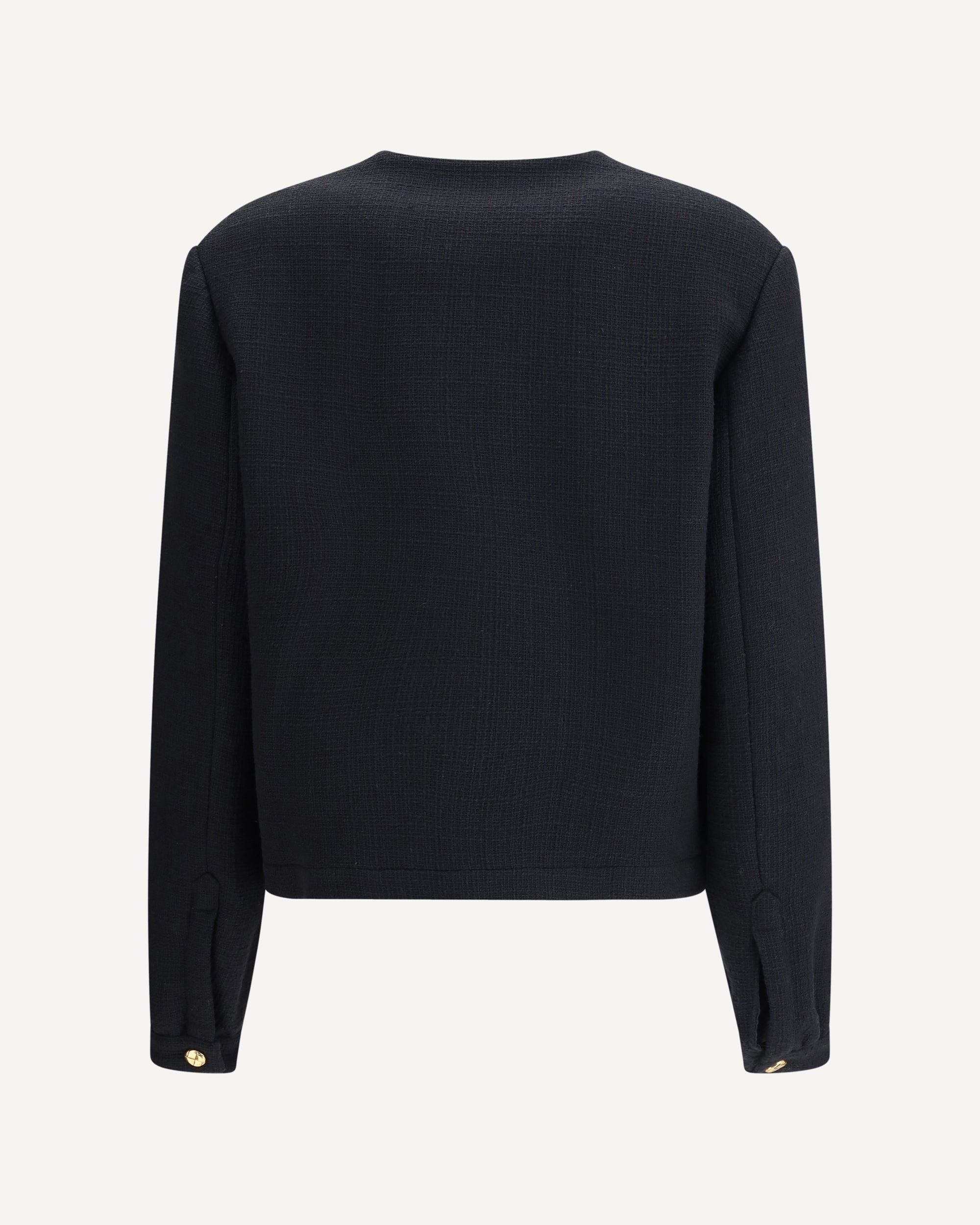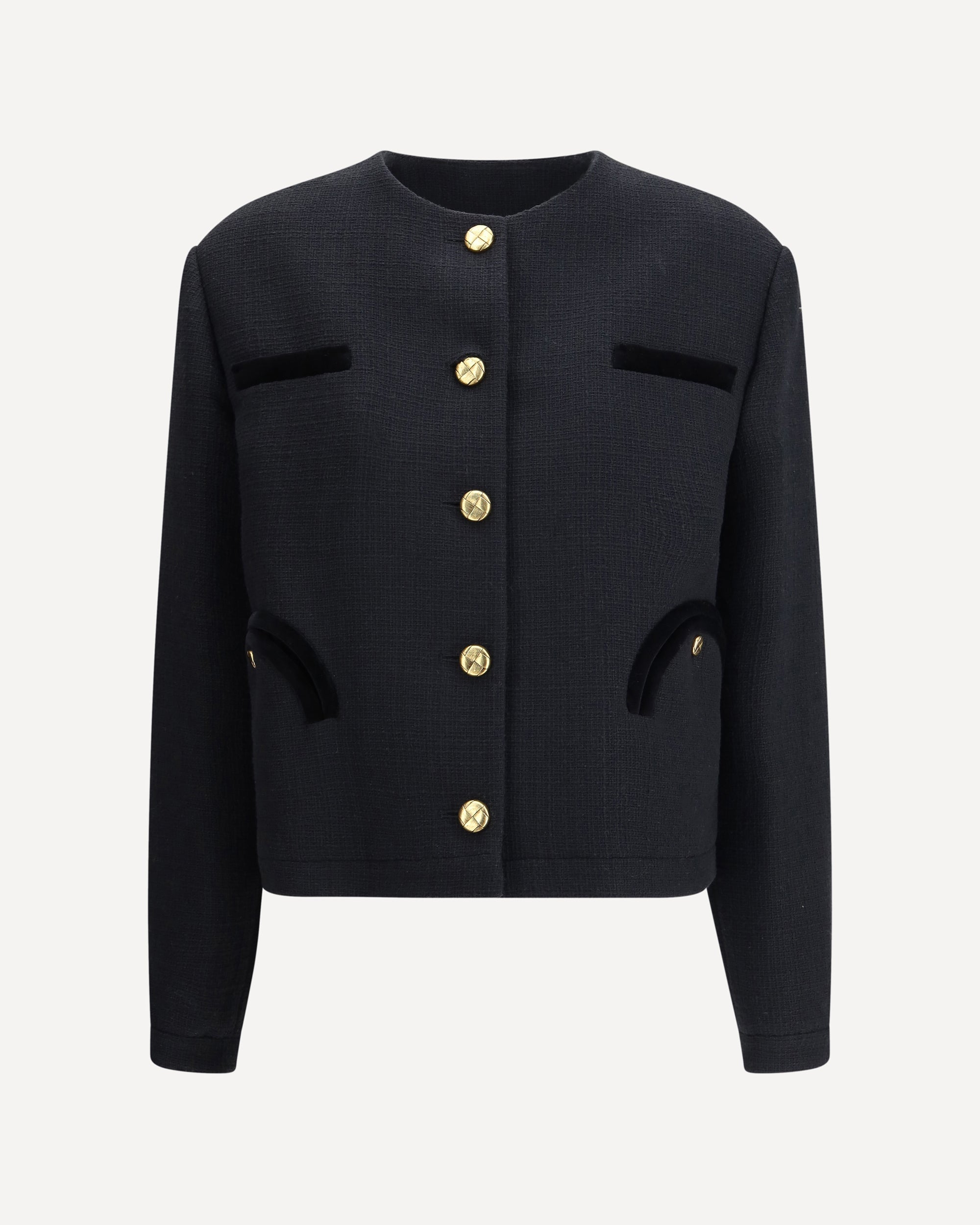 The Missy Gliss Bolero by Blazè Milano reimagines the cropped jacket with a modern attitude and sartorial flair. Crafted from soft-textured cotton tweed, it features an oversized bomber-inspired fit, enhanced by lightly padded shoulders for added structure. Contrasting velvet trims and five gold-tone buttons—fastening up to the collar—emphasize its refined character. The signature Smiley pockets on the front and navy lining highlight its contemporary appeal, striking the perfect balance between elegance and functionality.