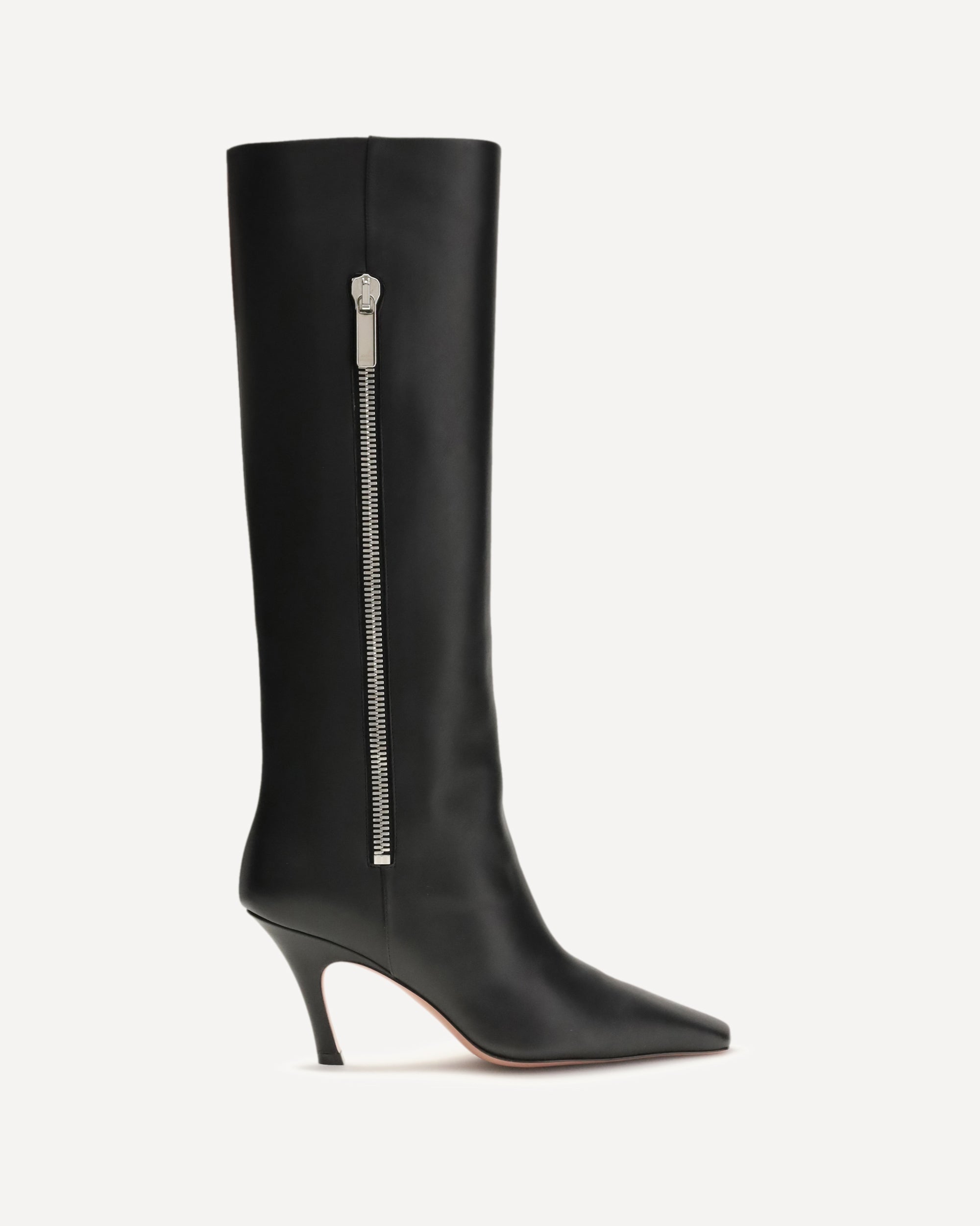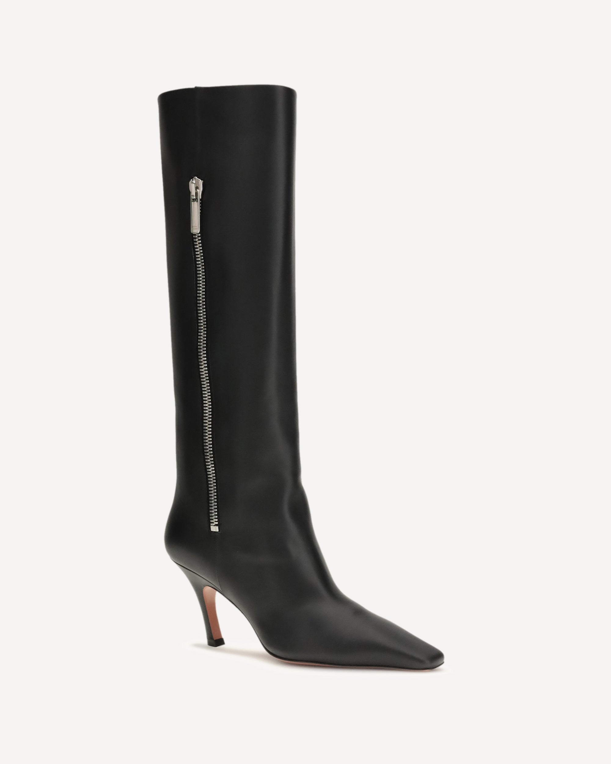 The Mona Boot 80 leather Boots by Amina Muaddi are a sophisticated and contemporary design, featuring the unmistakable 80 mm slanted heel that lends a modern, sculptural allure to the silhouette. Made of fine calfskin leather, they stand out for their clean lines, elegant structure and essential design that enhances any look. They also feature a practical external zippered pocket, a functional and distinctive detail that adds an urban touch to the model. A shoe with a strong character, perfect for completing both everyday and more sophisticated outfits.