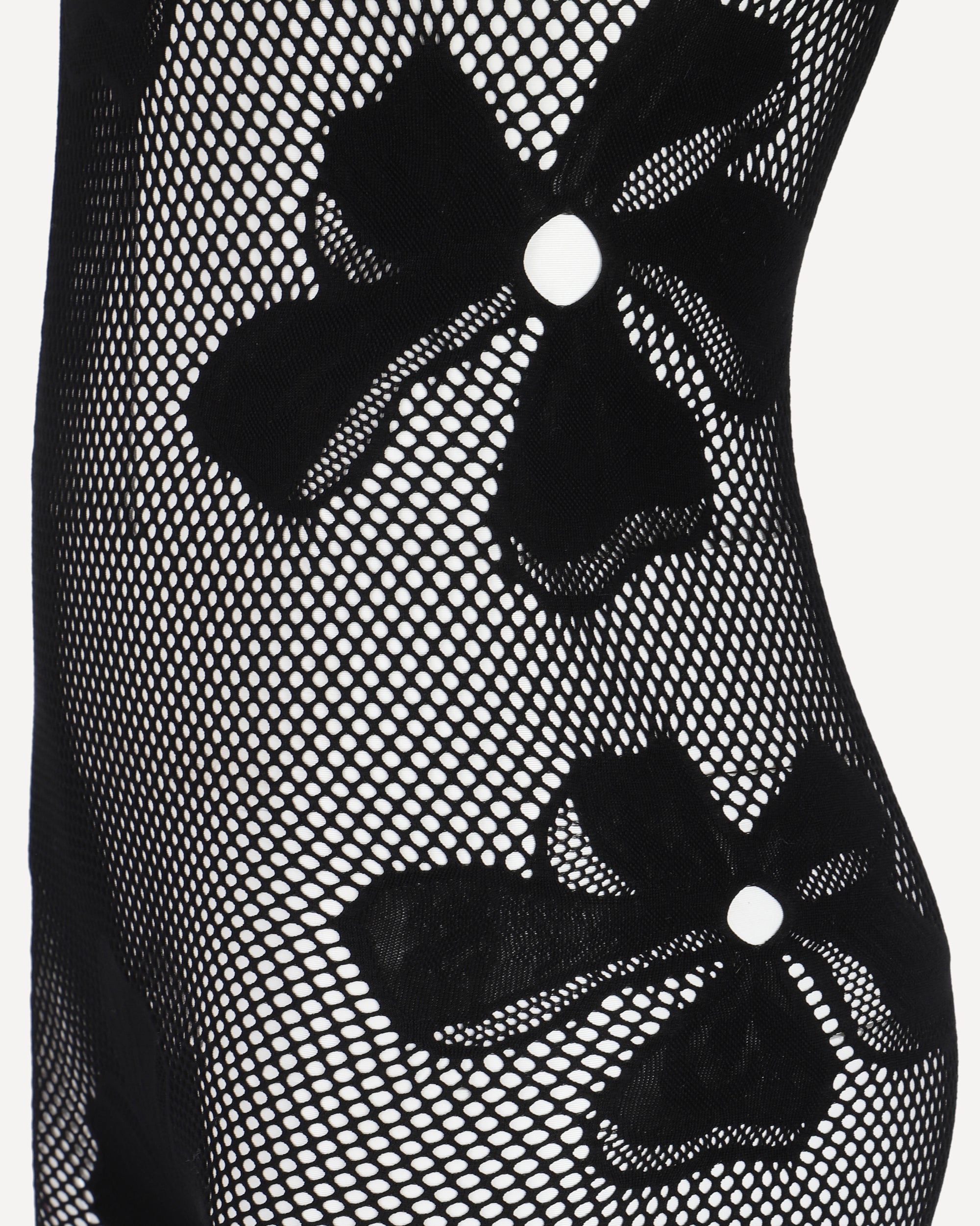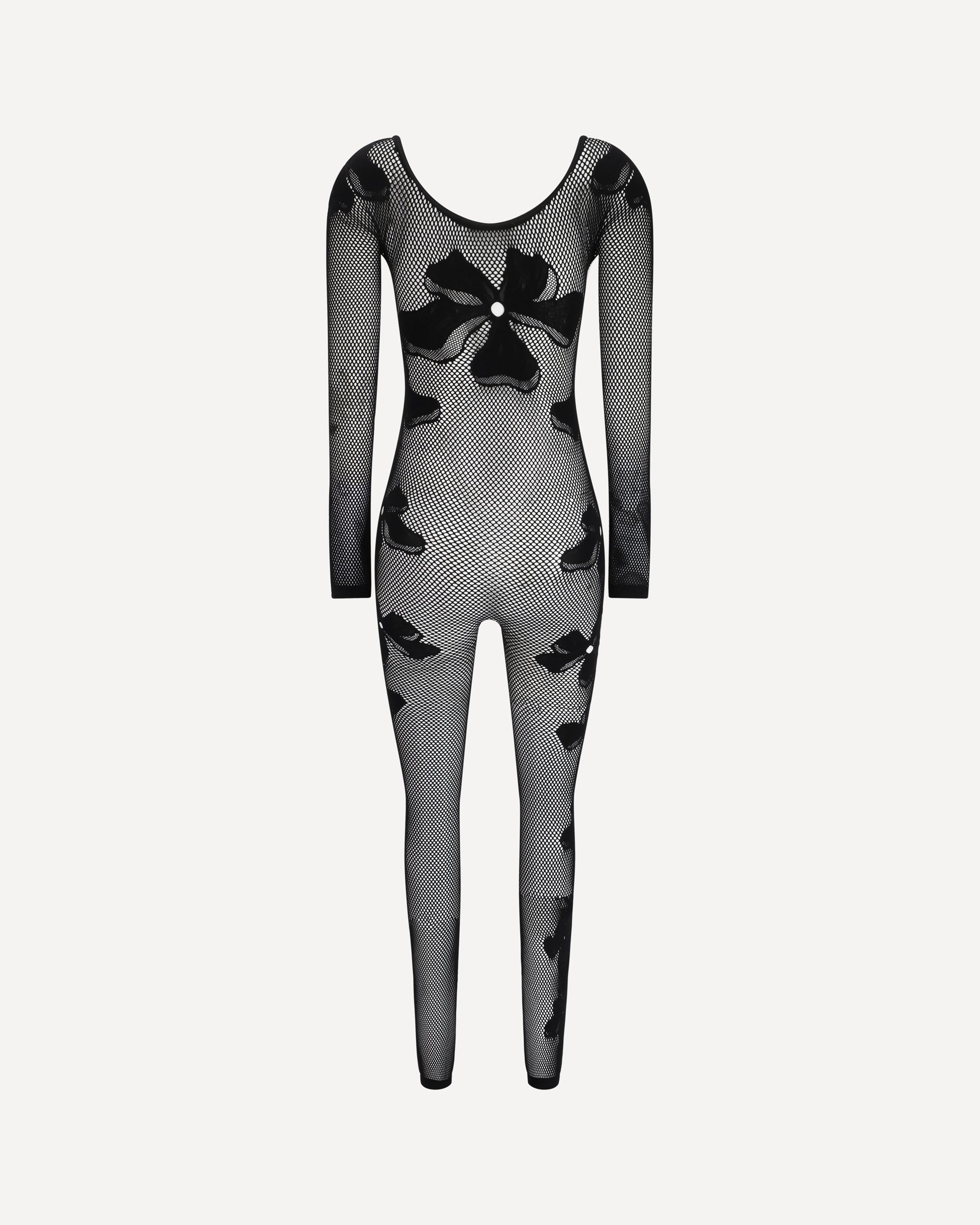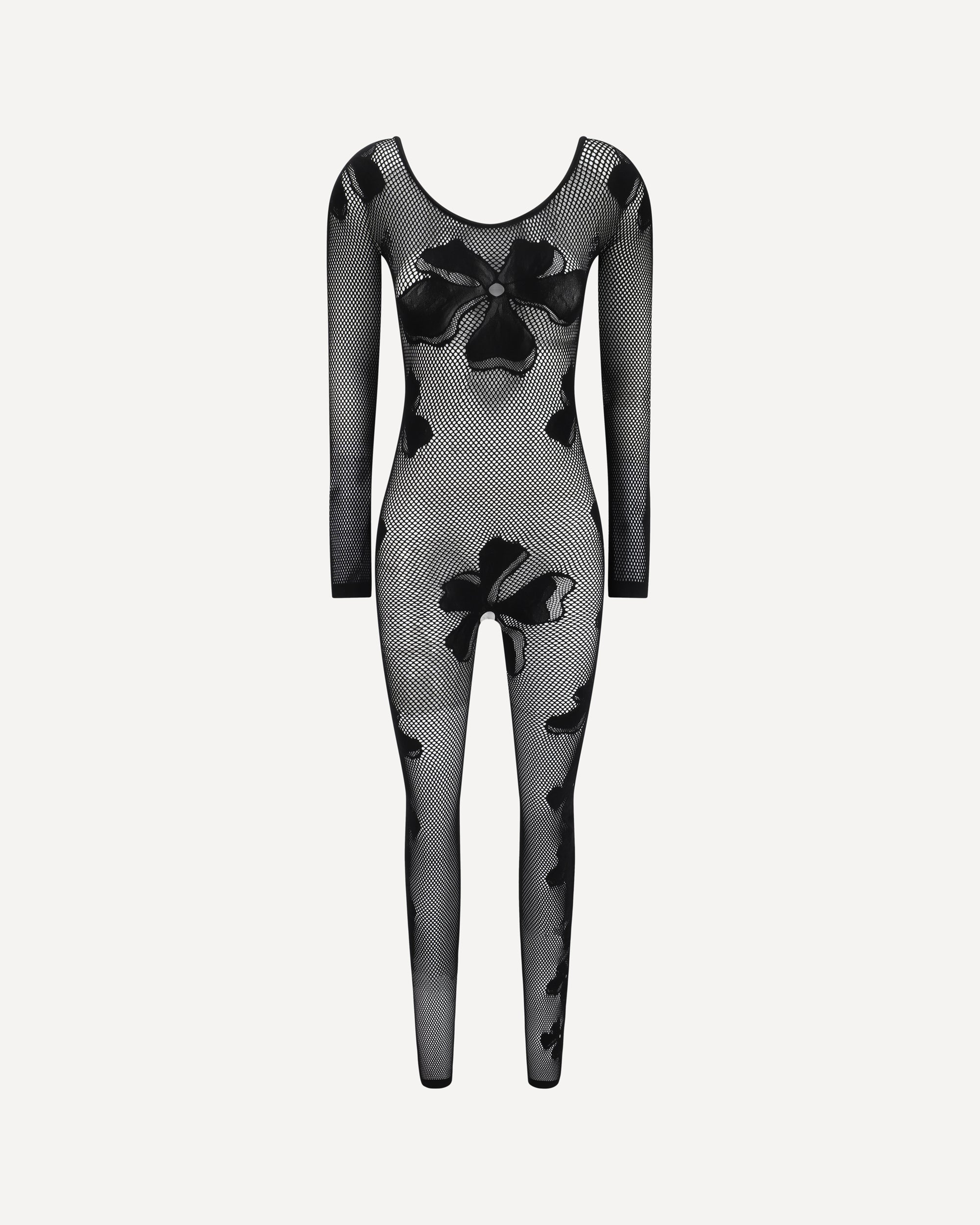 Monogram Jumpsuit Dress by Maccapani, see-through mesh design, all-over embroidered flower pattern, monochrome pattern, close fit.