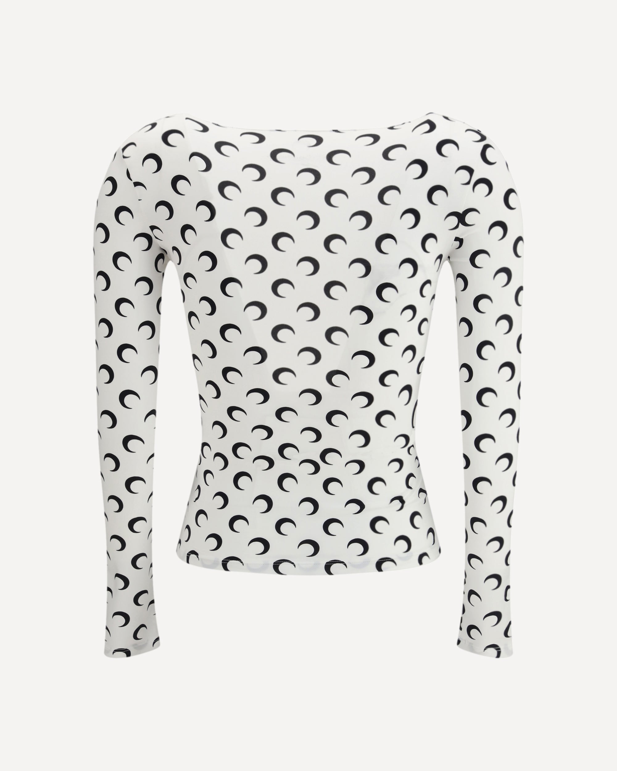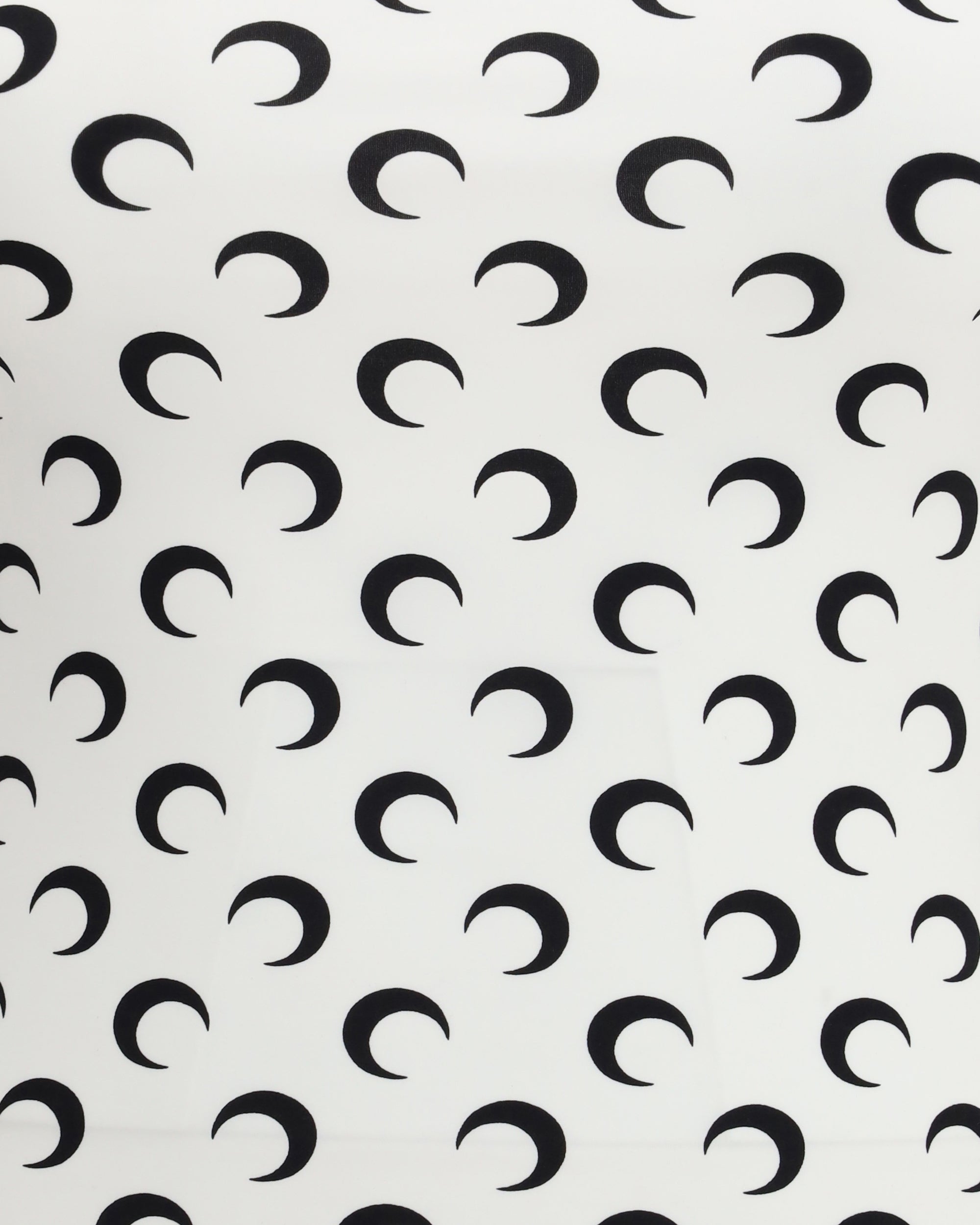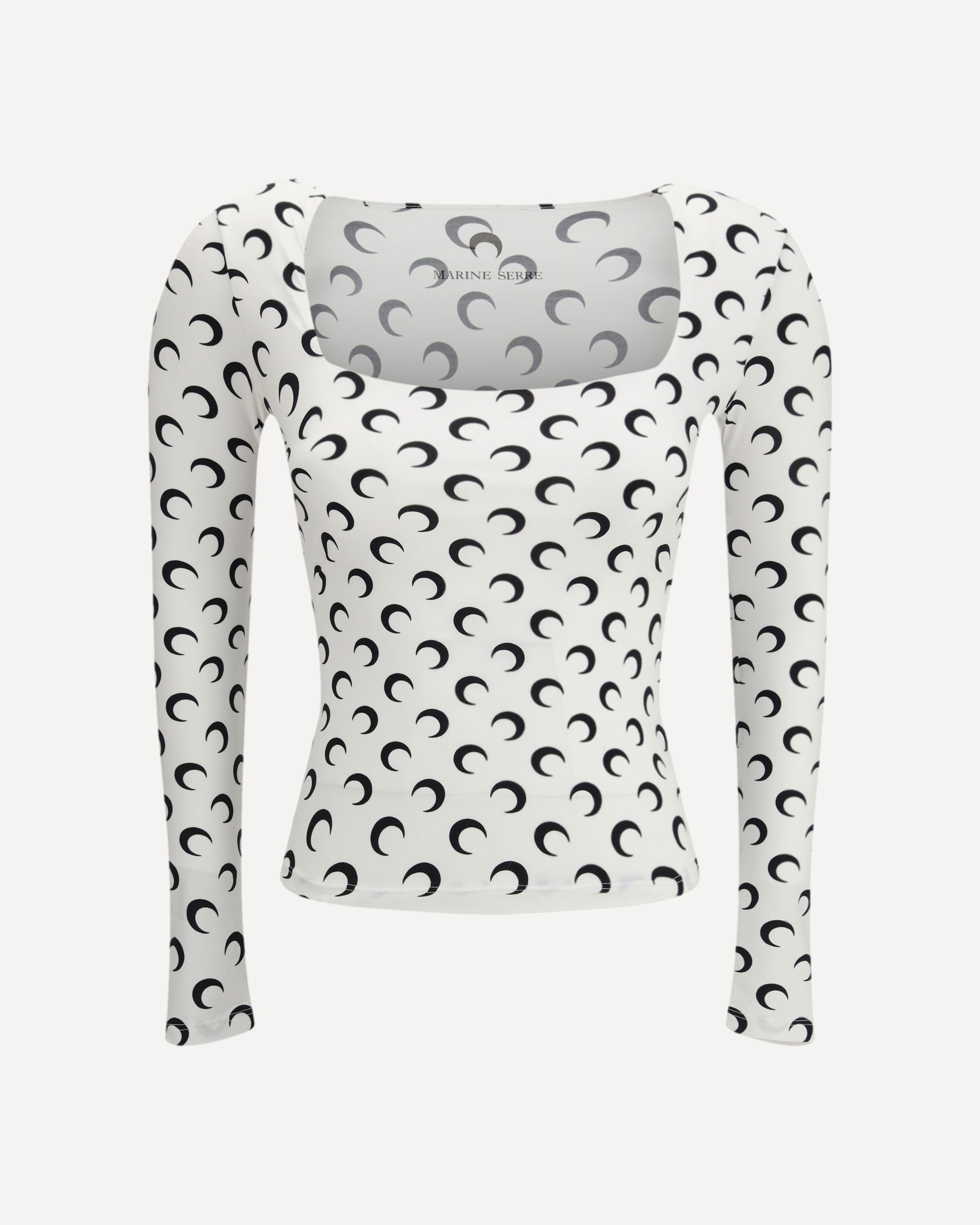 The Recycled Moon Top by Marine Serre embodies the brand’s avant-garde spirit, blending sustainability with contemporary design. Crafted from recycled fabric with a “second skin” effect, it fits closely to the body, enhancing the silhouette. The reinforced crew neckline and raw-edge finishes at the cuffs and hem highlight its modern attitude, while the all-over crescent moon print — a signature of the house — adds a bold, graphic touch. A sophisticated and versatile piece, perfect for futuristic and refined looks.