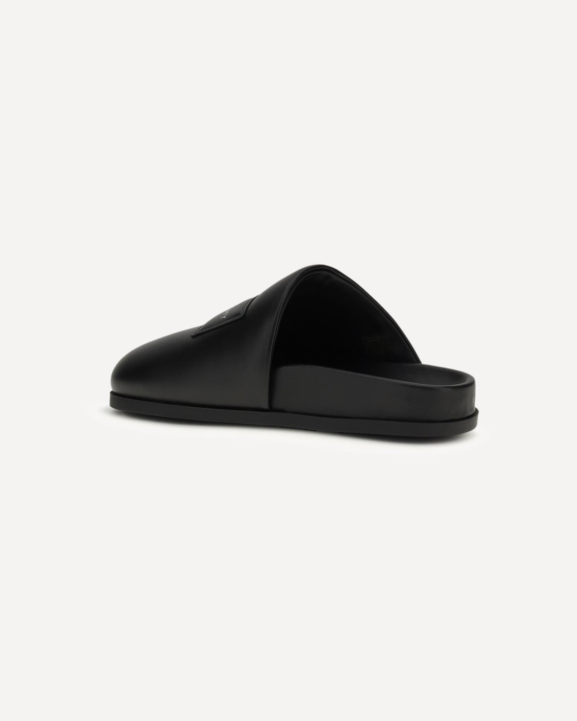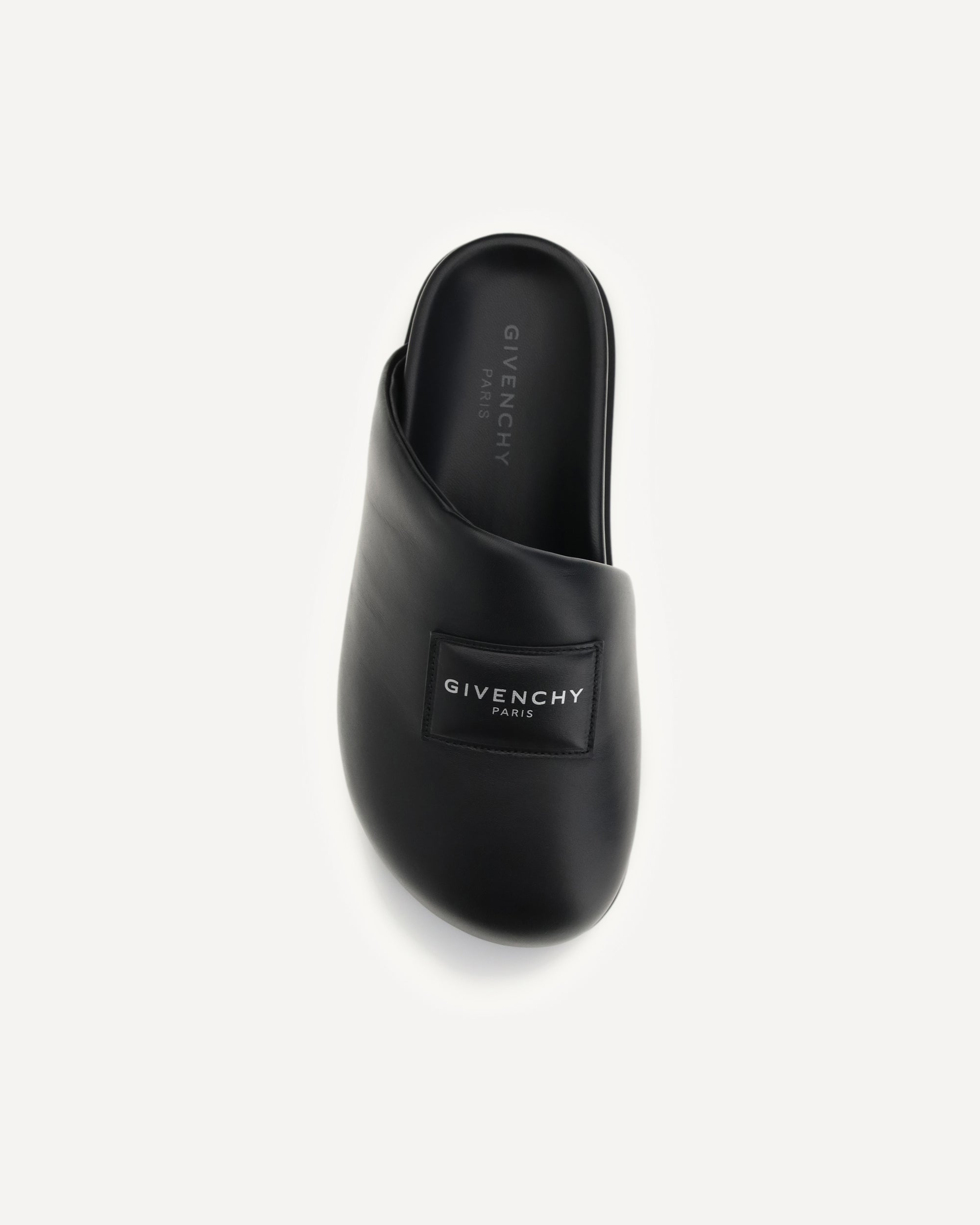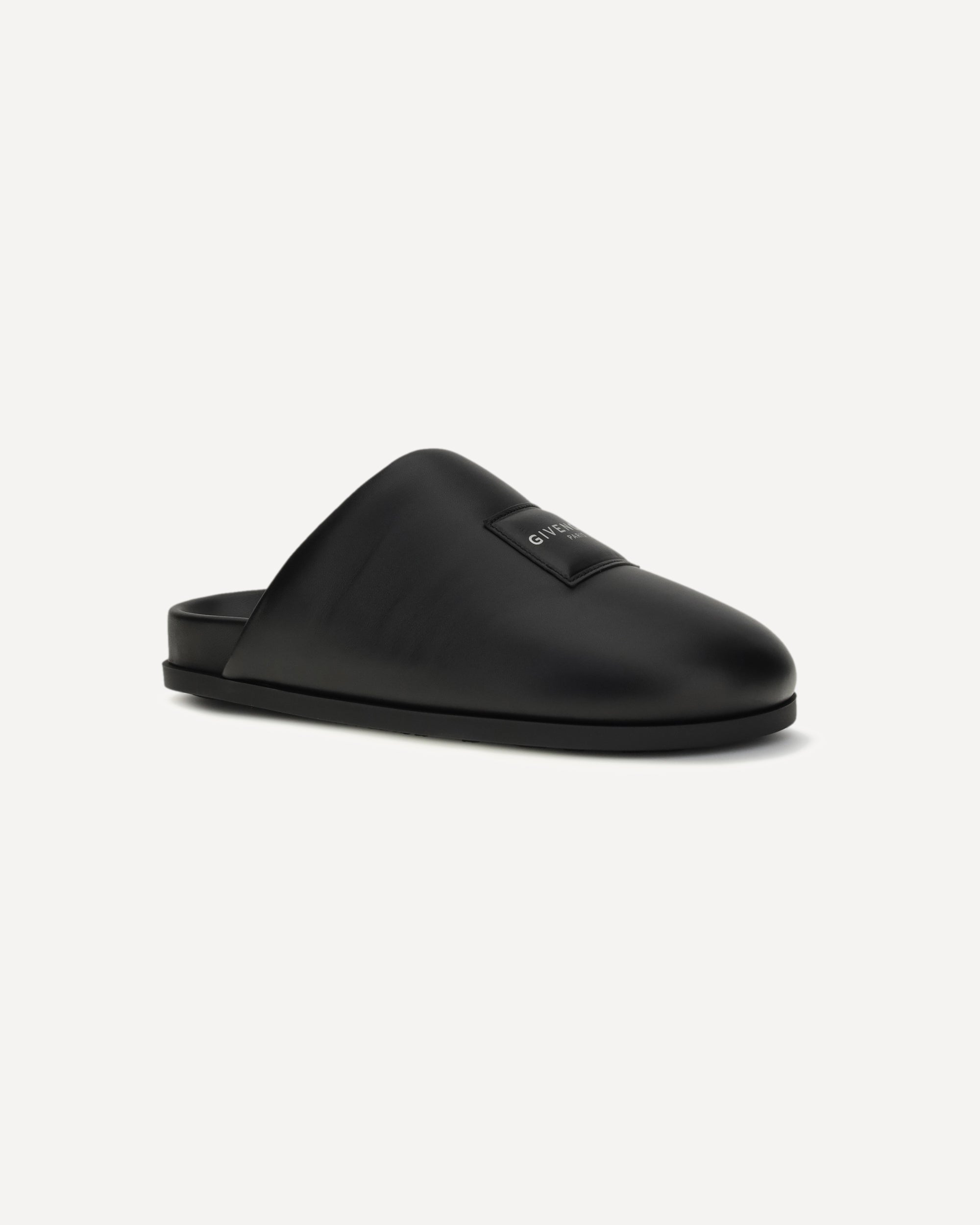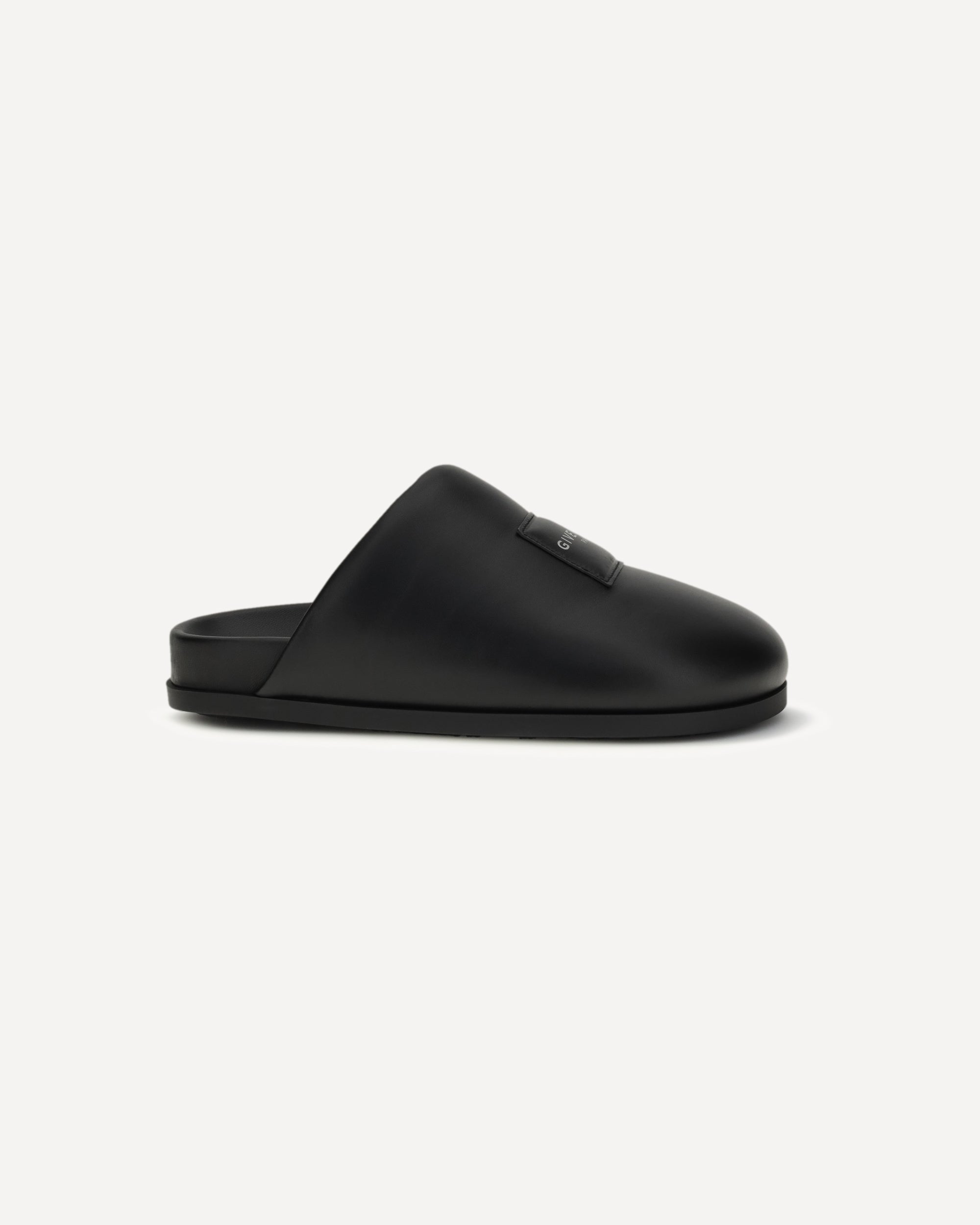 The leather Mules by Givenchy are an elegant and comfortable style, crafted from padded lambskin for a uniquely soft feel. The asymmetrical design adds a modern touch, while the tone-on-tone padded "GIVENCHY Paris" label on the upper expresses discretion and luxury. The leather insole with printed signature and the maxi signature under the sole complete the distinctive look. These mules are perfect for those seeking style and comfort without compromise.