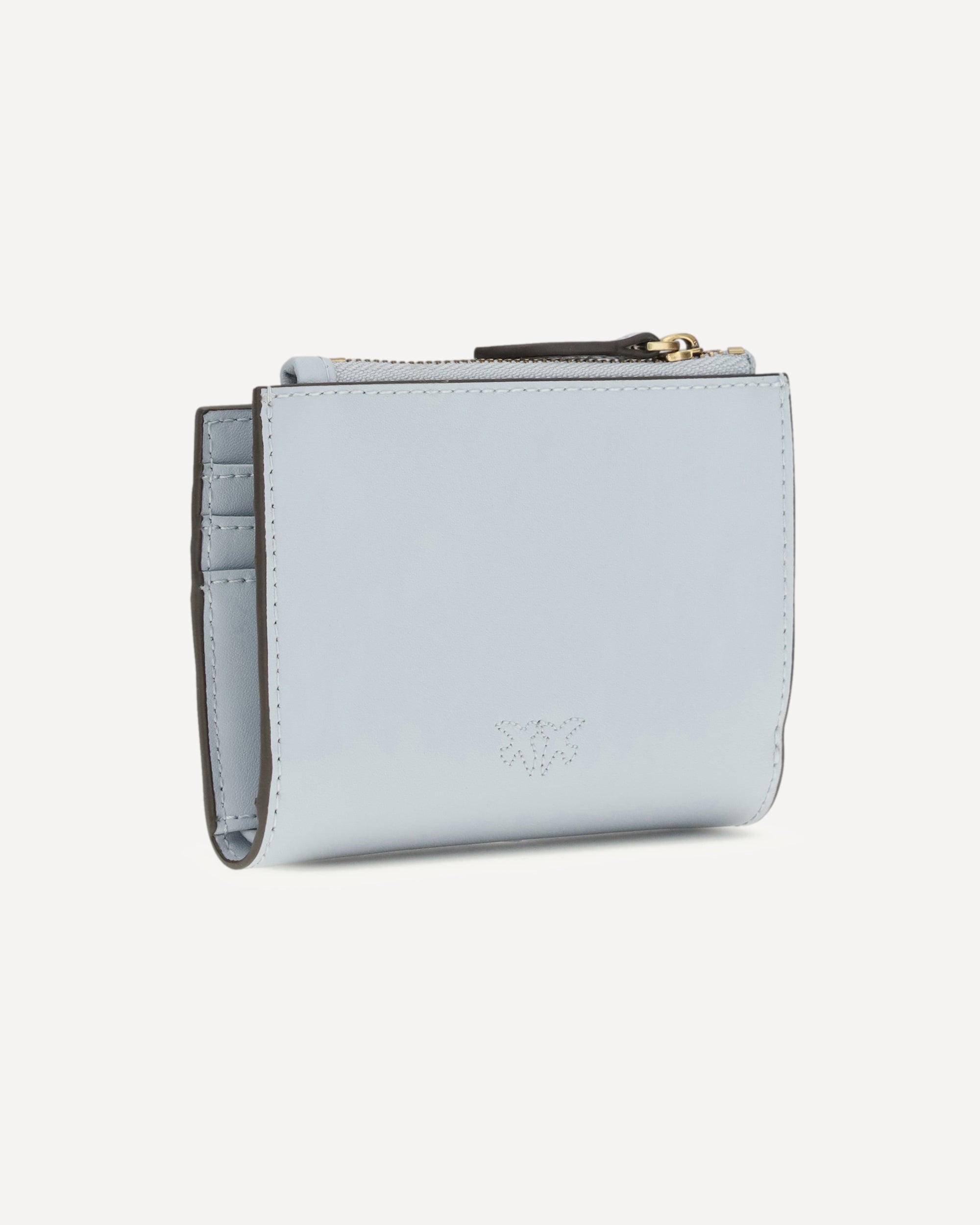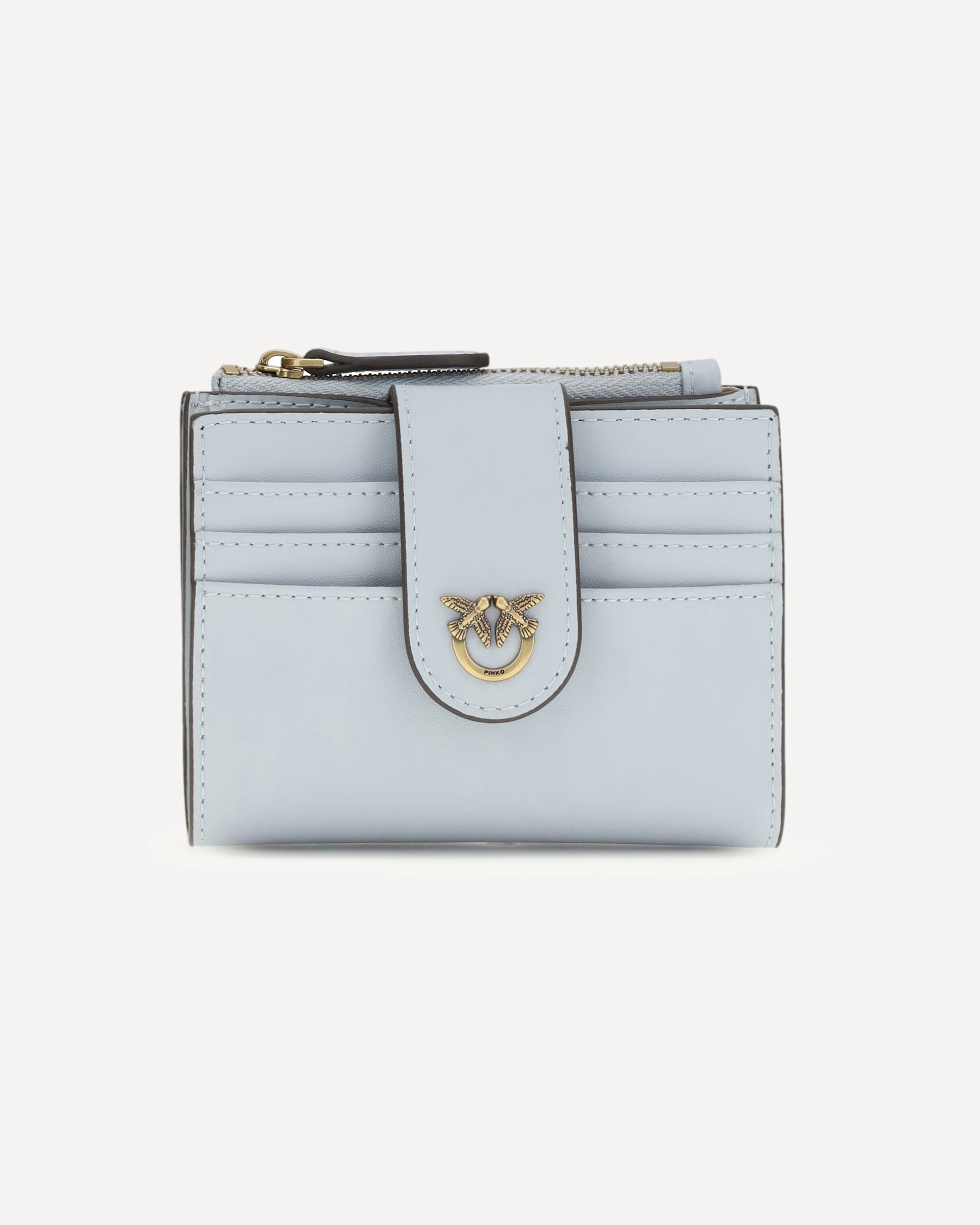 The Wallet with logo by Pinko is an elegant and practical accessory made from smooth leather. It offers numerous compartments for credit cards and documents, as well as a coin pocket with zip closure. The small strap closure is embellished with a metal plaque featuring the Love Birds logo, the brand's distinctive symbol, adding an iconic touch to your look. A must-have to add to your bag.