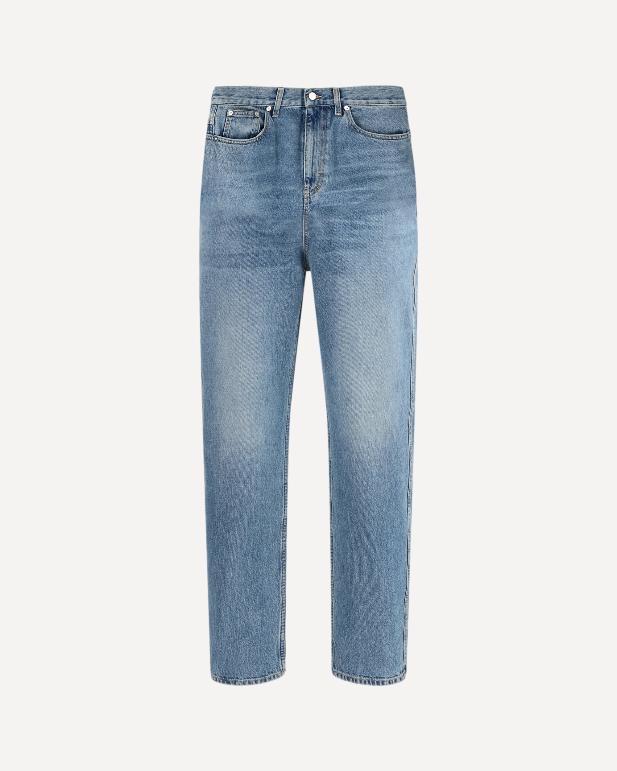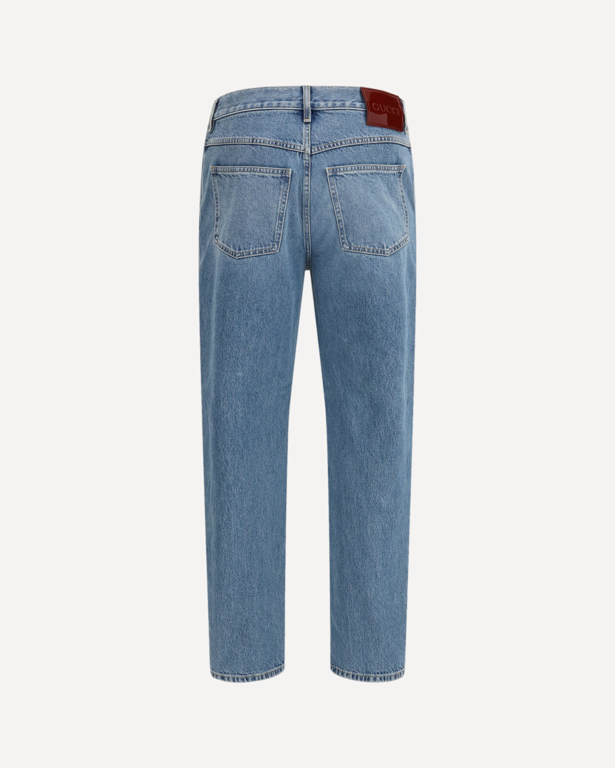 The slim-fit Pants in certified cotton denim with a light délavé finish express a clean and contemporary aesthetic. The streamlined silhouette enhances the figure with balance, while the five-pocket construction, belt loops and button-and-zip fastening recall a timeless design. The Gucci Rosso Ancora naplak label signs the piece with an iconic Maison Gucci detail.