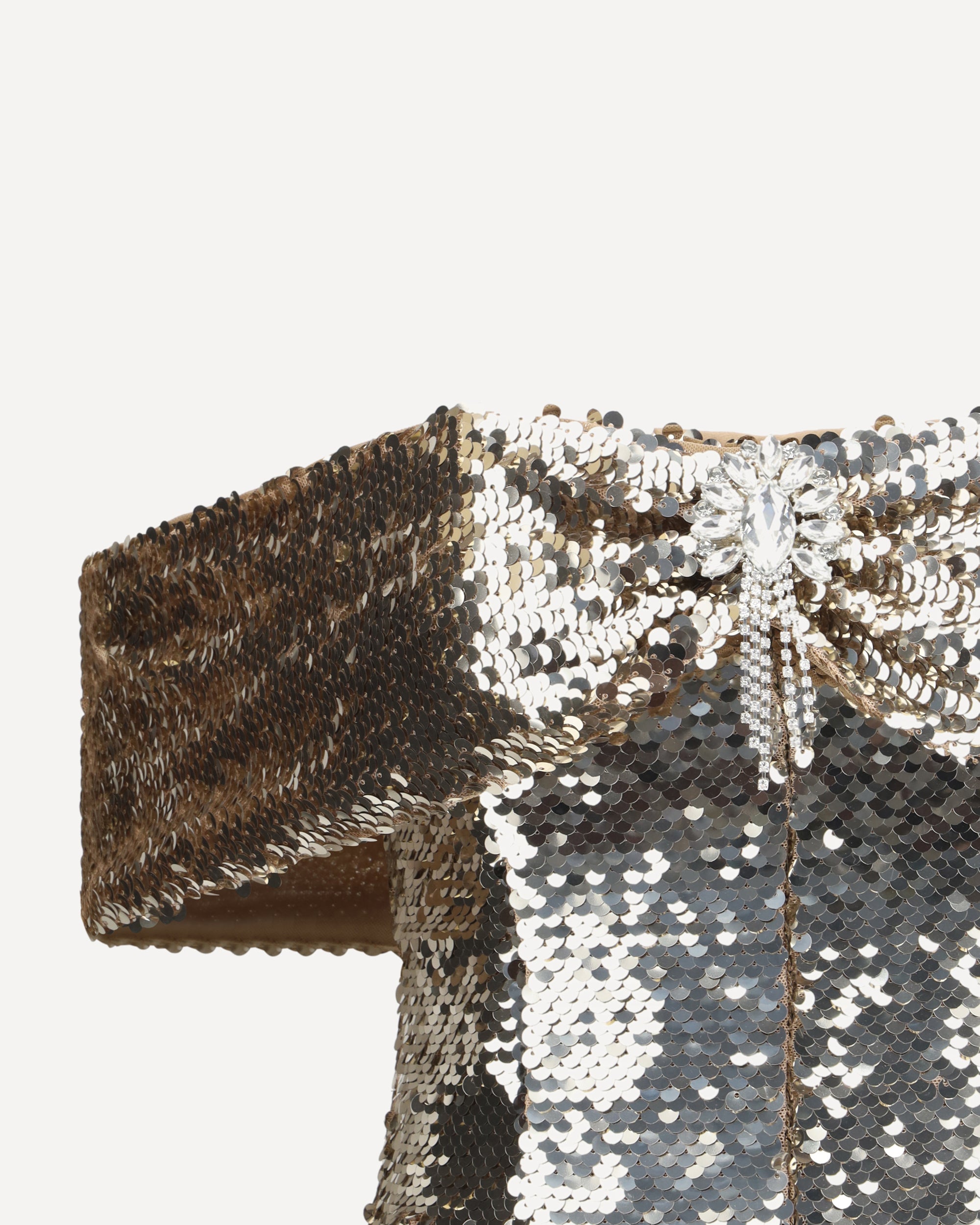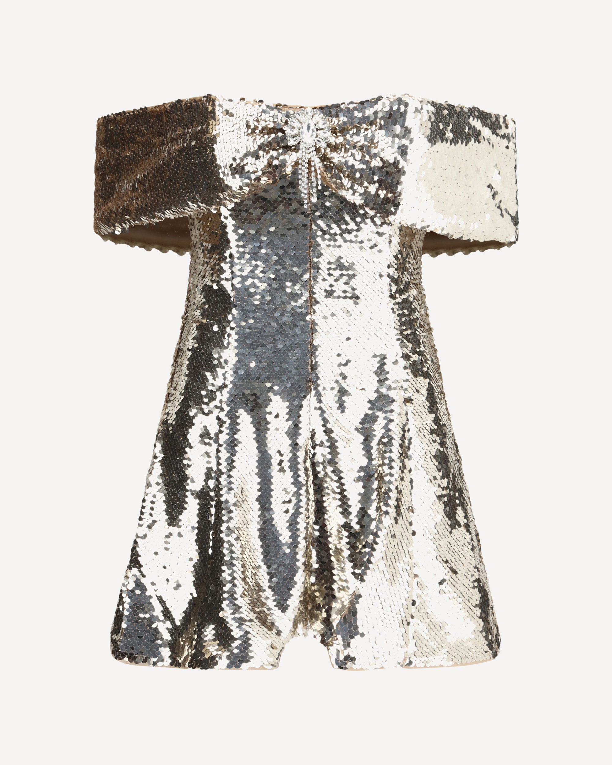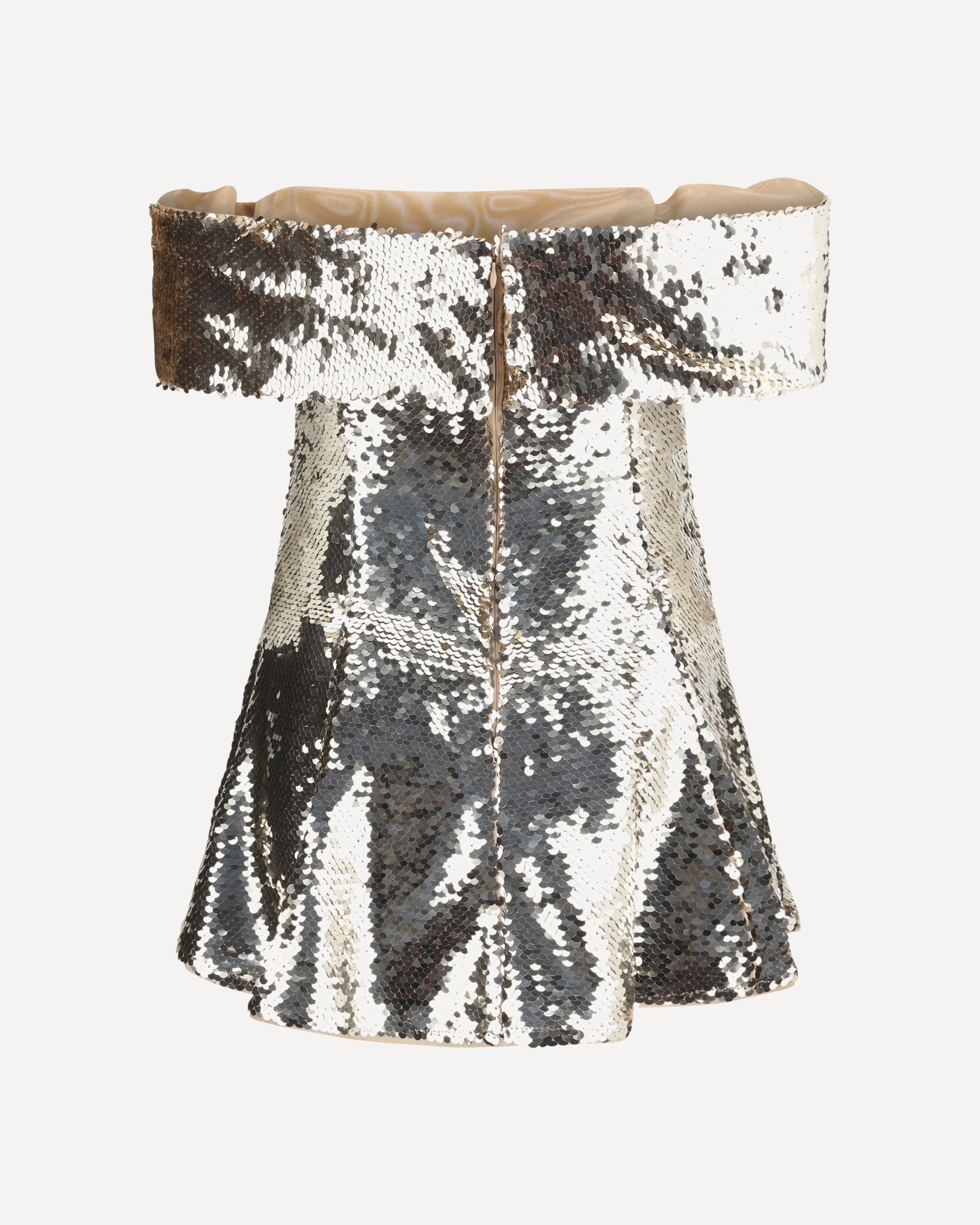 Self-Portrait's mini Dress is a bold and sophisticated piece, featuring exposed shoulders that give it a sensual and modern touch. The hidden zipper and hook-and-eye closure on the back panel ensures a flawless fit while keeping the design sleek and minimalist. The design of the dress is embellished with mirrored sequins applied evenly over the entire surface, creating a bright and sparkling effect that catches the eye.