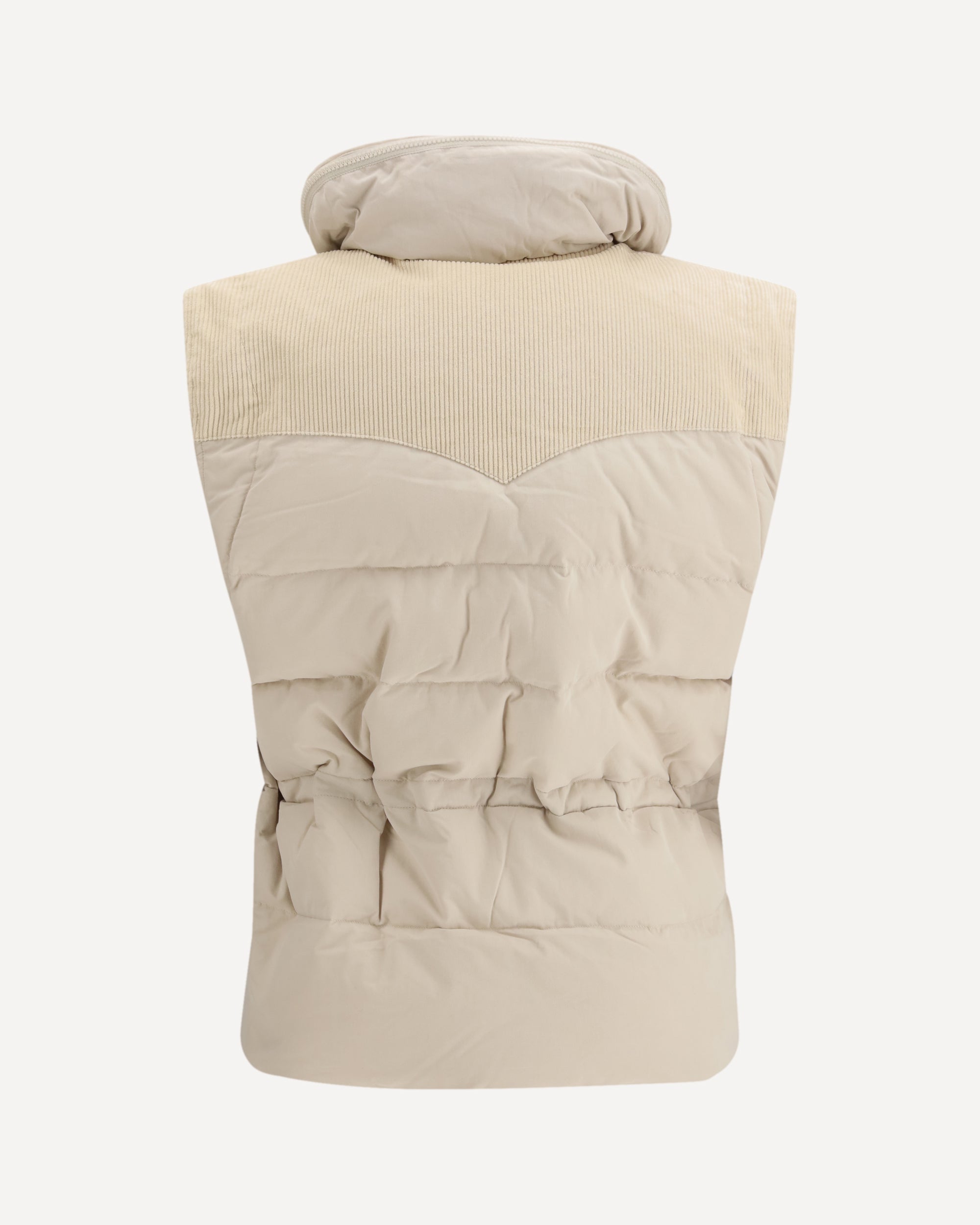 The Olfa padded Gilet by Marant Etoile blends functionality with contemporary style. Featuring corduroy details, it adds texture and character to the design. Padded for warmth and comfort, it is finished with a high neck for added protection and a front zip closure. Front pockets complete the piece, offering practicality and ease, making it ideal for casual, urban looks and effortless layering during transitional seasons.
